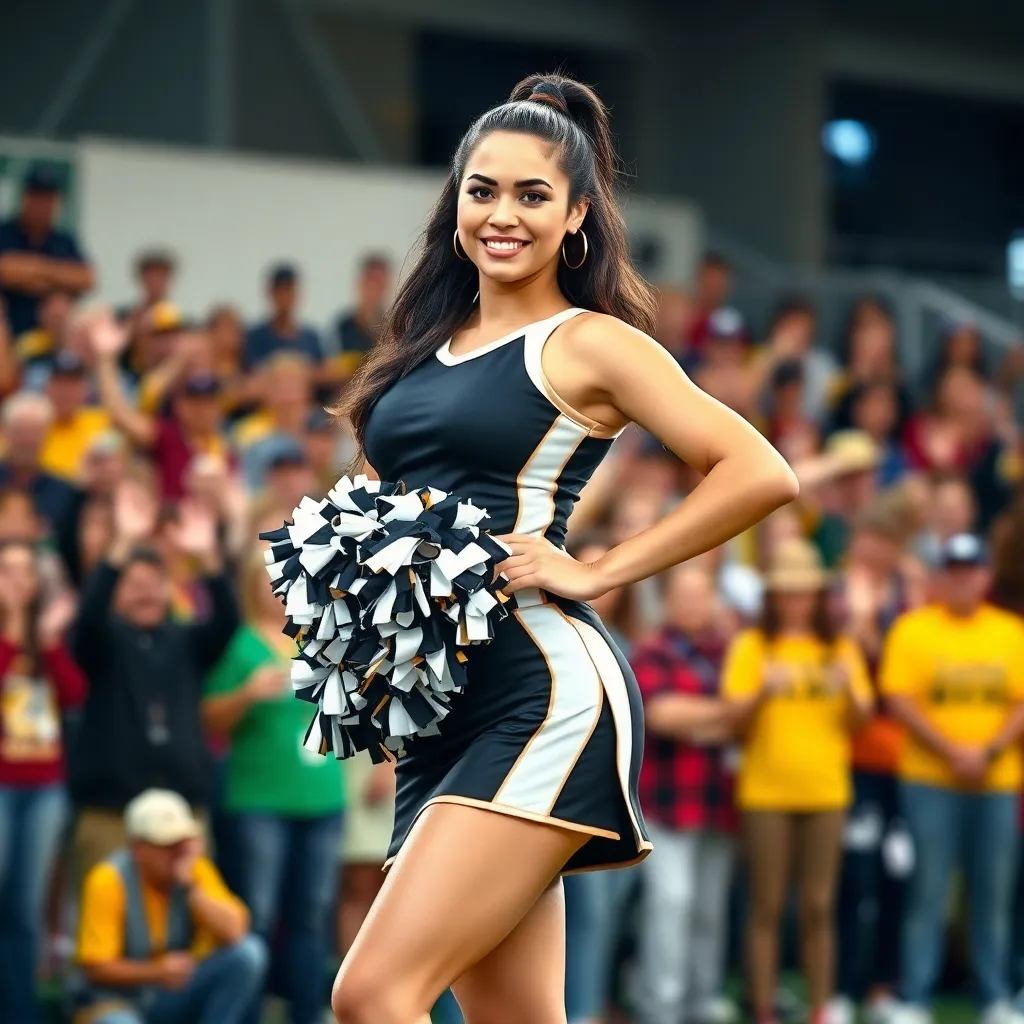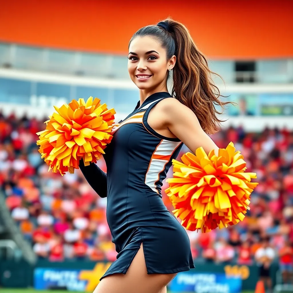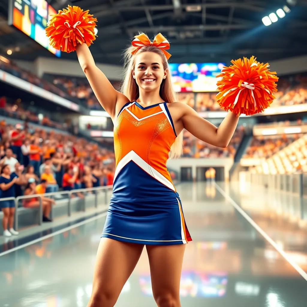 Capture the energy of a professional cheerleader in action! Imagine a confident, charismatic individual in a sleek uniform, pom-poms in hand, standing on the sidelines of a sports stadium. The image should convey excitement, enthusiasm, and a sense of community. Incorporate bright colors, dynamic poses, and a lively atmosphere.
