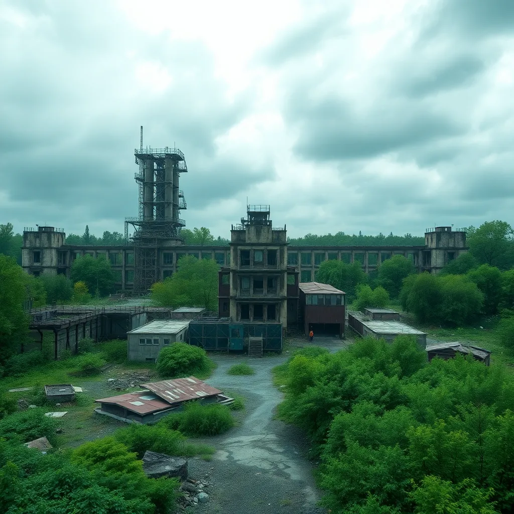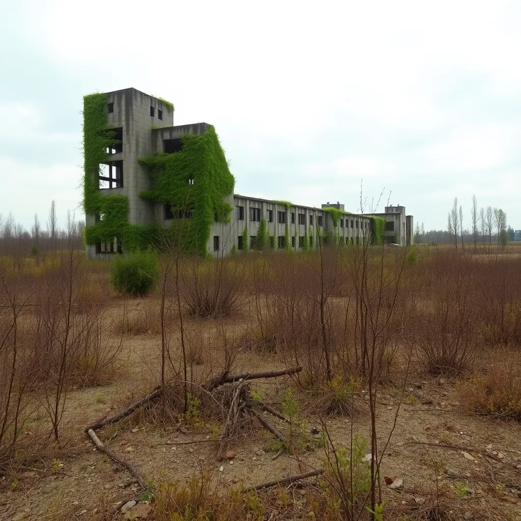 Capture the haunting beauty of the Chernobyl Exclusion Zone. Imagine a desolate landscape of abandoned buildings, overgrown vegetation, and a haunting silence. Include the iconic Reactor 4 building, its ruin a poignant reminder of the devastating nuclear disaster. Convey the eerie atmosphere and sense of history in your AI-generated image.