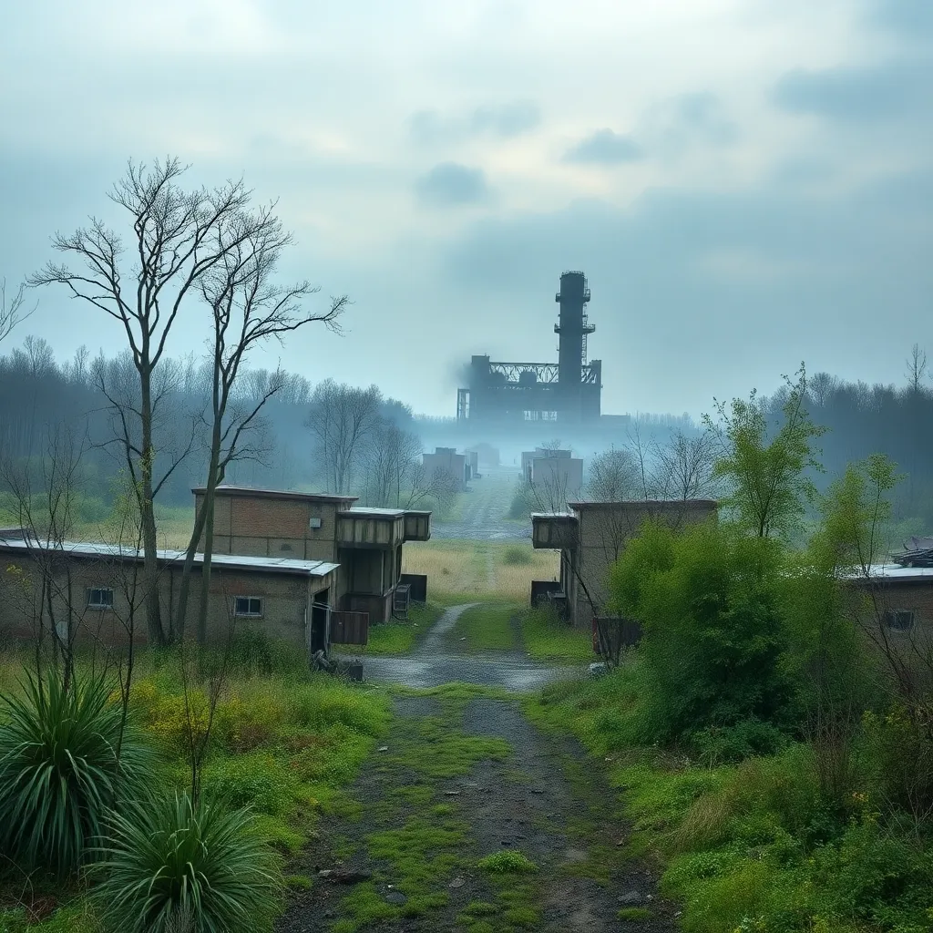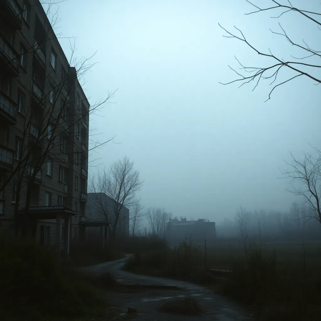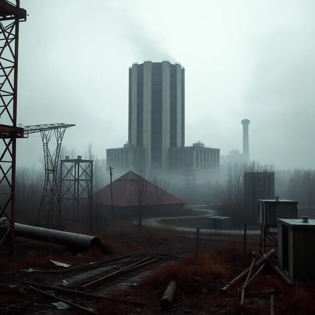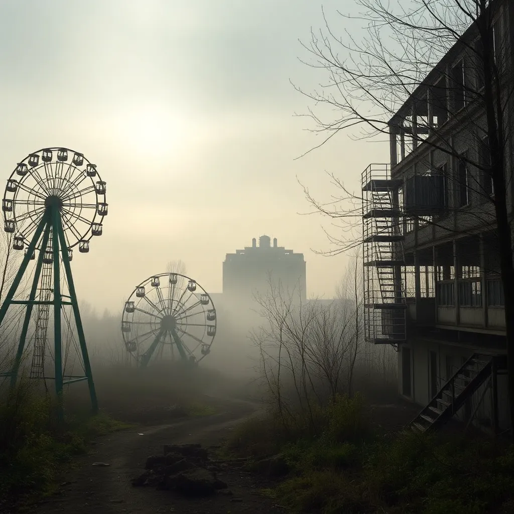 Imagine a hauntingly beautiful scene in the Exclusion Zone of Chernobyl, where the iconic Reactor 4 building stands as a testament to human error. A eerie mist shrouds the abandoned cityscape, with twisted metal and crumbling concrete structures looming in the distance. What kind of atmosphere would you create?