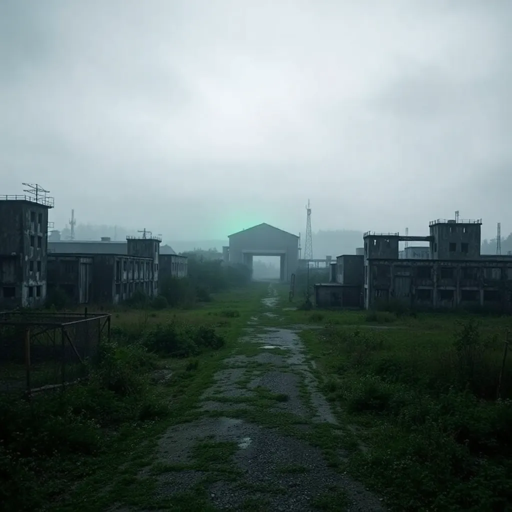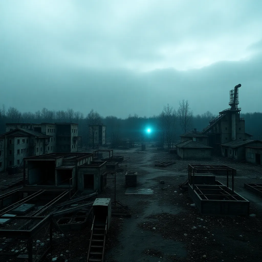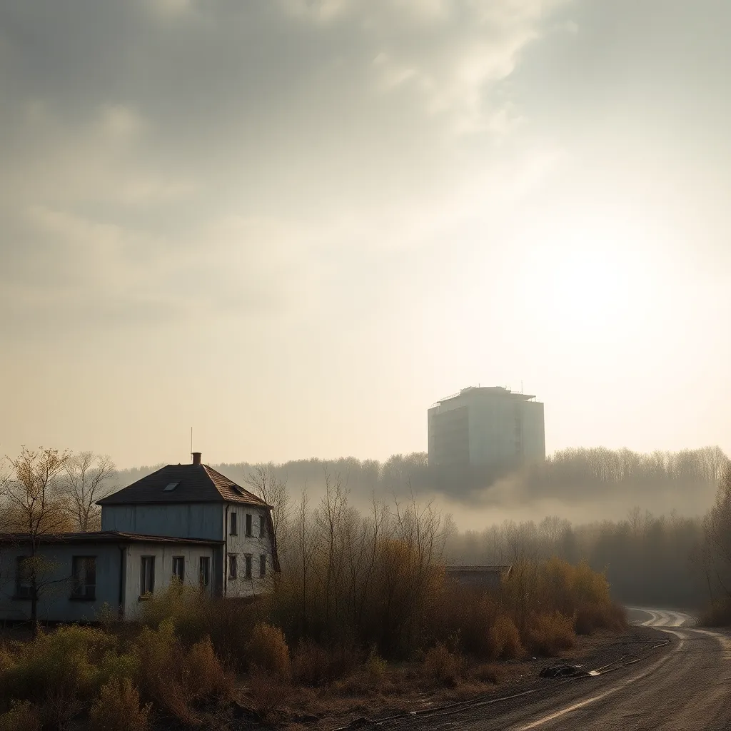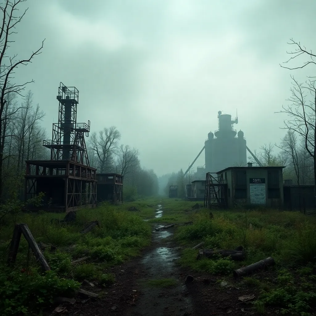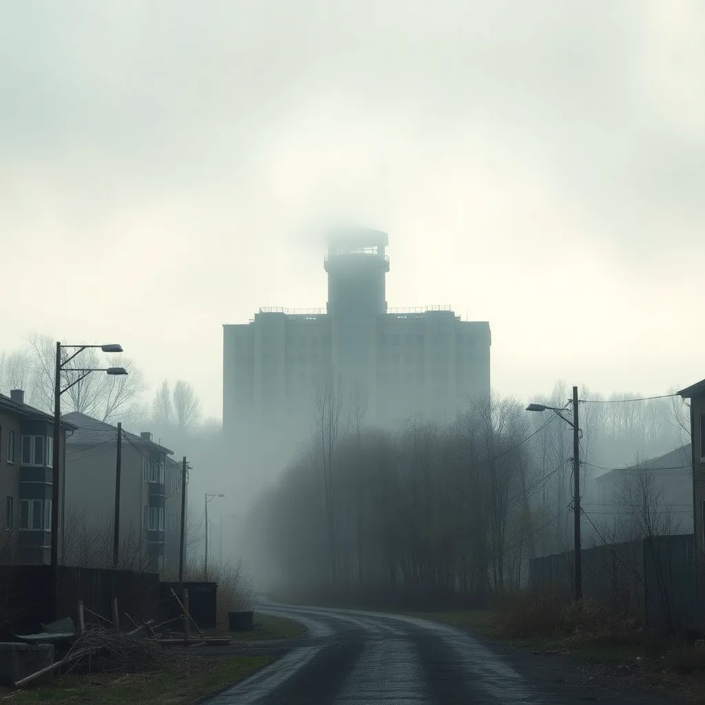 Imagine a hauntingly beautiful scene in the Exclusion Zone of Chernobyl, where the iconic Reactor 4 building stands as a testament to human error. A eerie mist shrouds the abandoned cityscape, with twisted metal and crumbling concrete structures looming in the distance. What kind of atmosphere would you create?