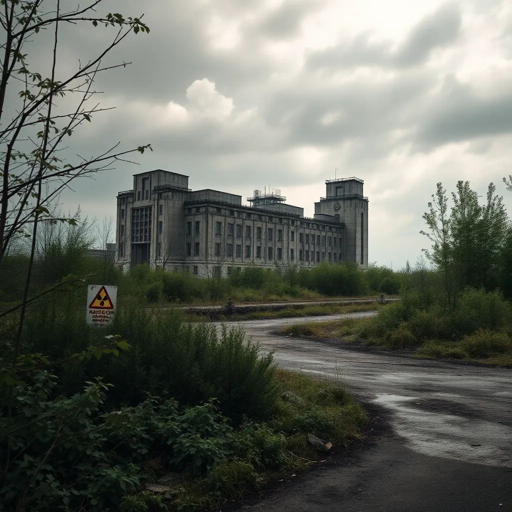 Imagine a hauntingly beautiful scene of the abandoned Chernobyl Exclusion Zone, where the iconic Reactor 4 building stands as a haunting reminder of the 1986 nuclear disaster. The image should capture the eerie atmosphere, with overgrown vegetation, crumbling concrete, and a hint of radiation warning signs.