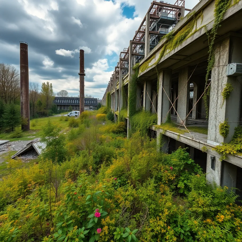 Imagine a hauntingly beautiful landscape of abandoned reactors, crumbling concrete, and overgrown vegetation. Capture the eerie silence of the Chernobyl Exclusion Zone, where nature has reclaimed the ruins of the 1986 nuclear disaster. Use vibrant colors to convey the stark contrast between decay and rebirth.