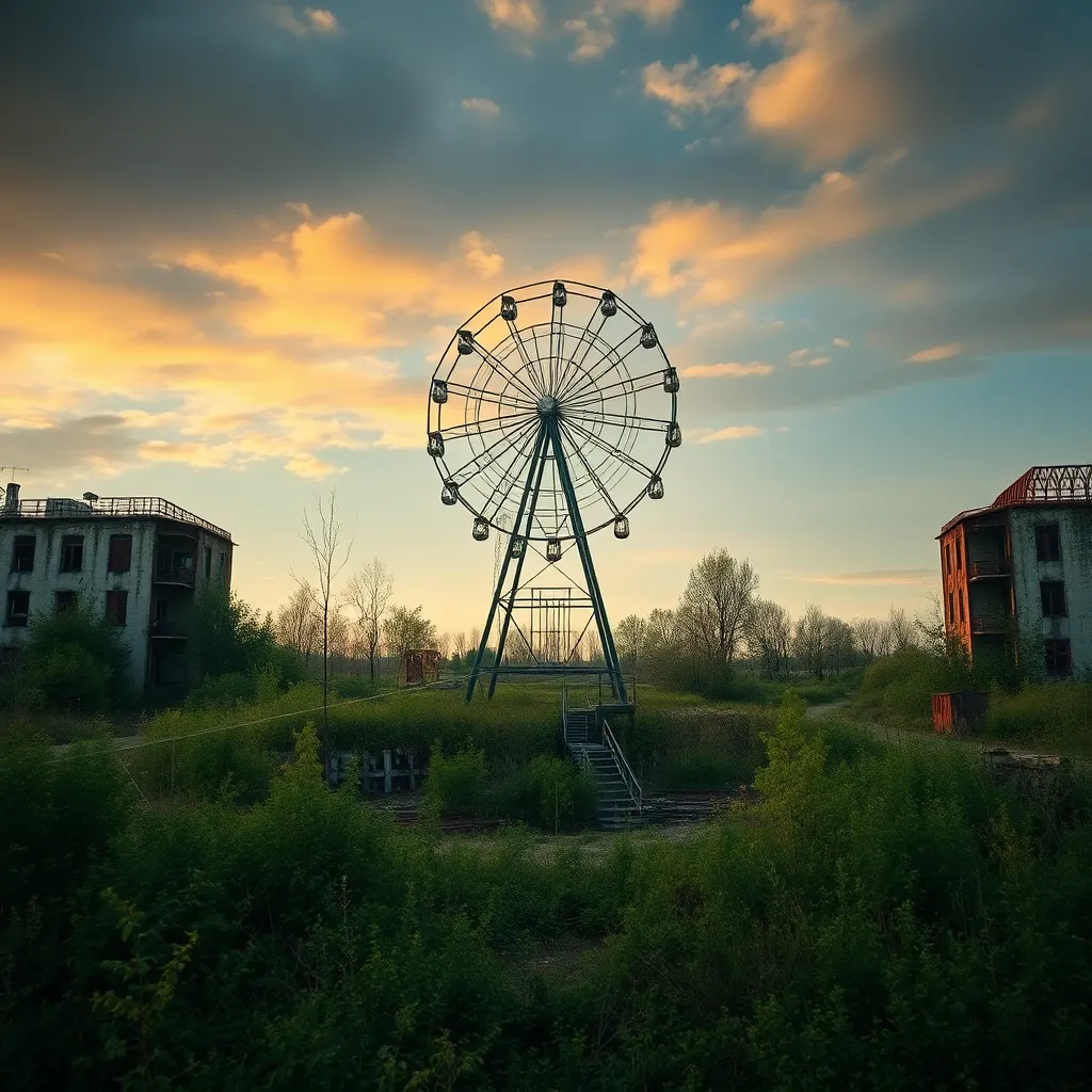 Capture the haunting beauty of the Chernobyl Exclusion Zone. Imagine a desolate landscape of abandoned buildings, overgrown vegetation, and twisted metal. A solitary Pripyat Ferris wheel stands tall, a poignant reminder of the devastating nuclear disaster. Create an AI image that conveys the eerie atmosphere and sense of abandonment.