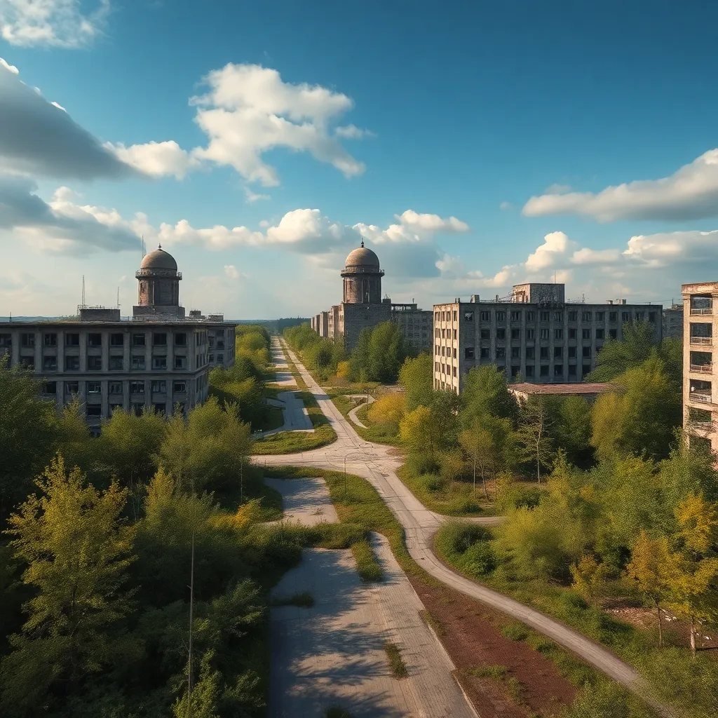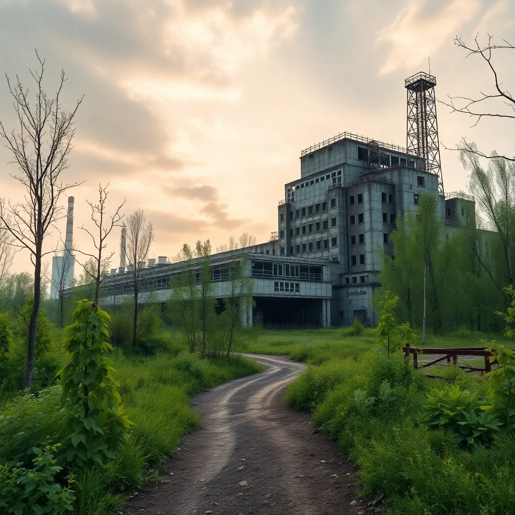 Capture the eerie beauty of the Chernobyl Exclusion Zone. Imagine a hauntingly serene landscape of abandoned reactors, overgrown streets, and crumbling buildings. The once-thriving city is now a testament to human error and nature's resilience. Your AI image should convey a sense of desolation and the passing of time.