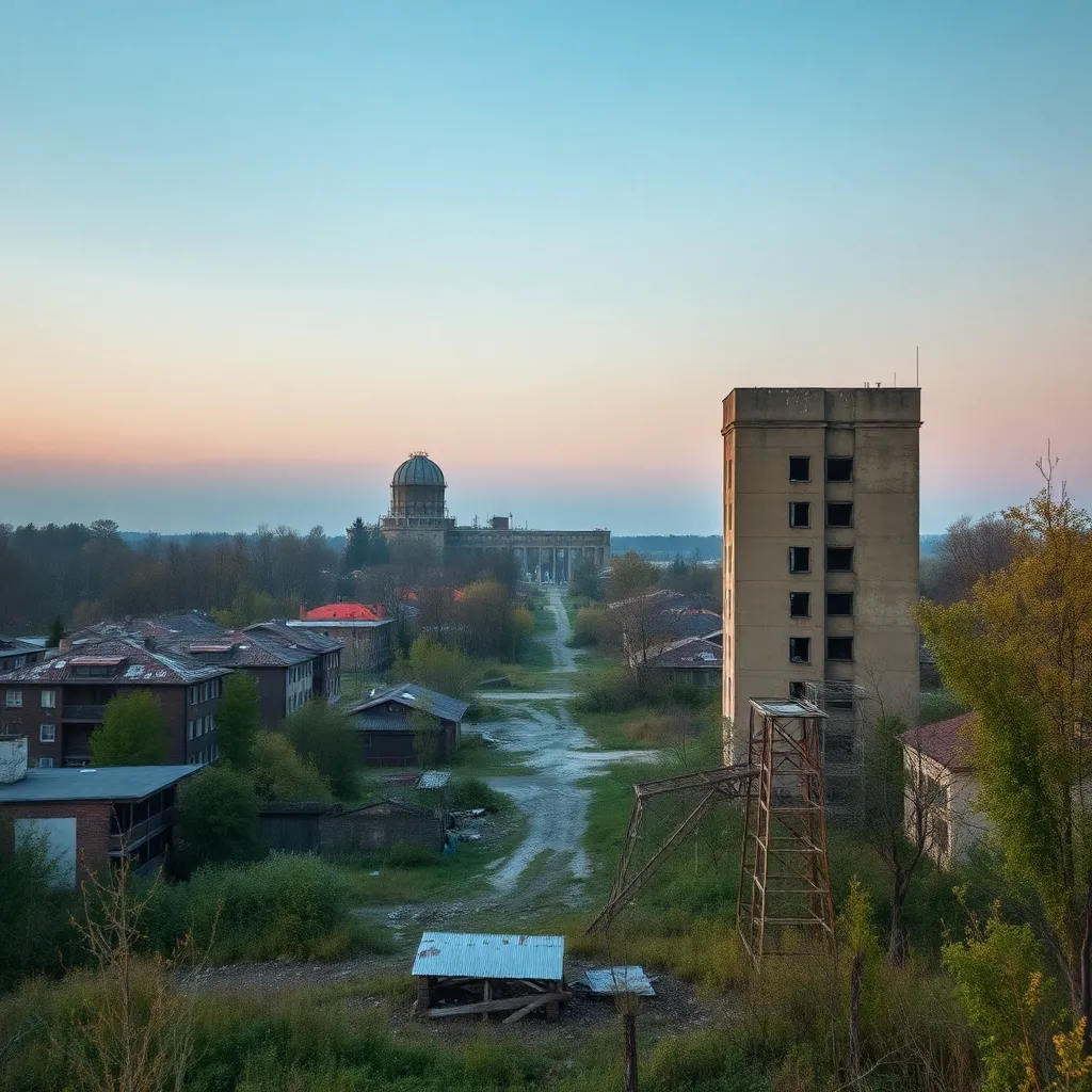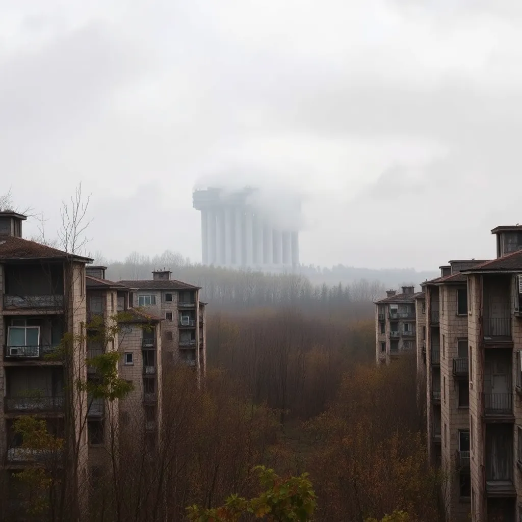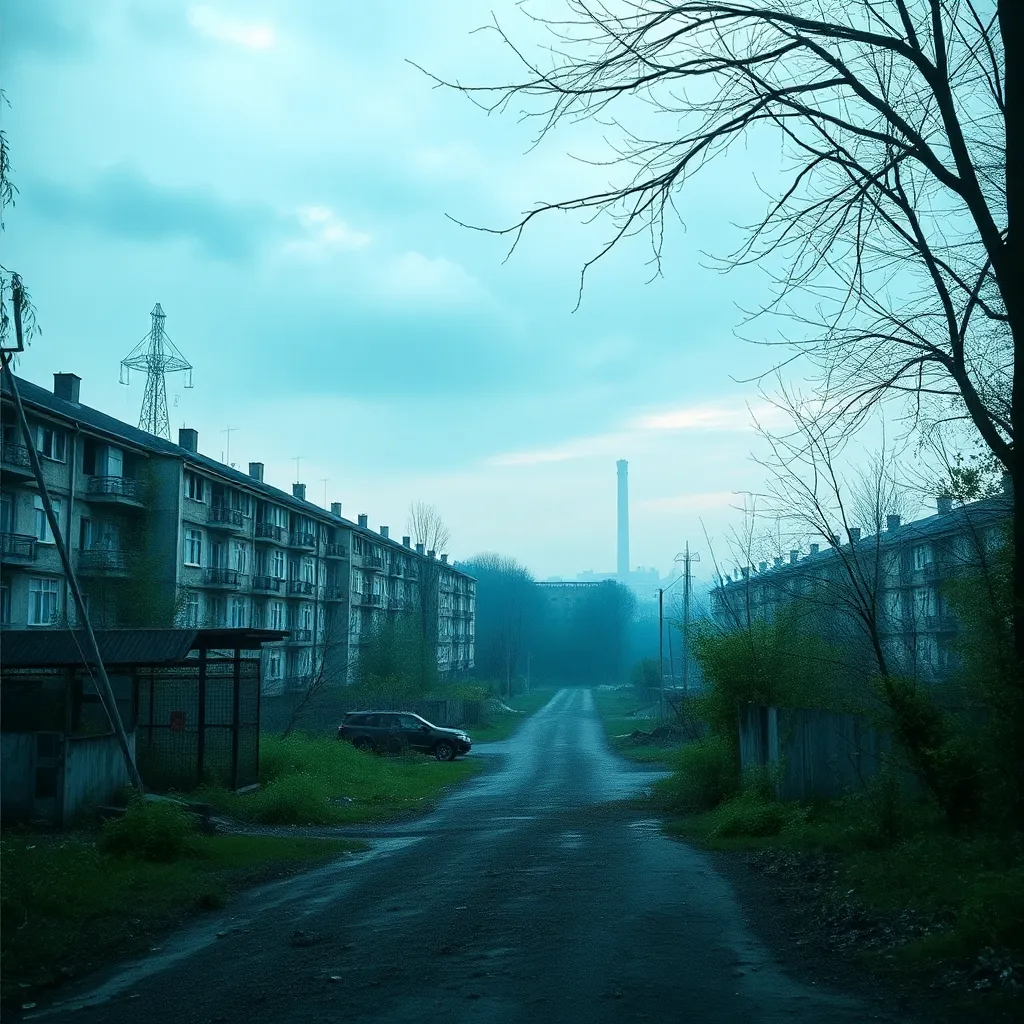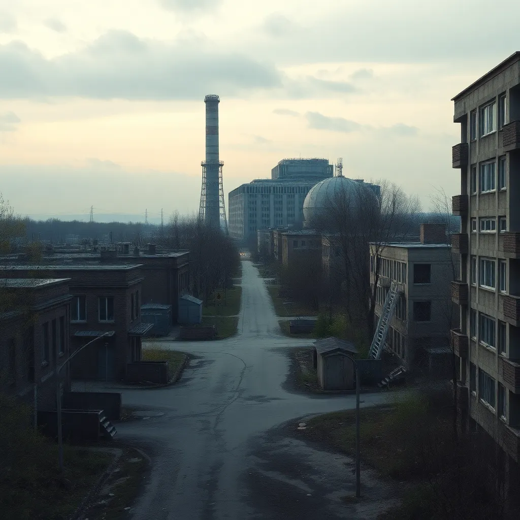 Imagine a hauntingly beautiful scene of the abandoned Pripyat city, once home to Chernobyl's nuclear power plant. The crumbling buildings, overgrown with vegetation, stand as a testament to the devastating 1986 disaster. In the distance, the iconic Reactor 4 building looms, shrouded in a misty veil of secrecy.