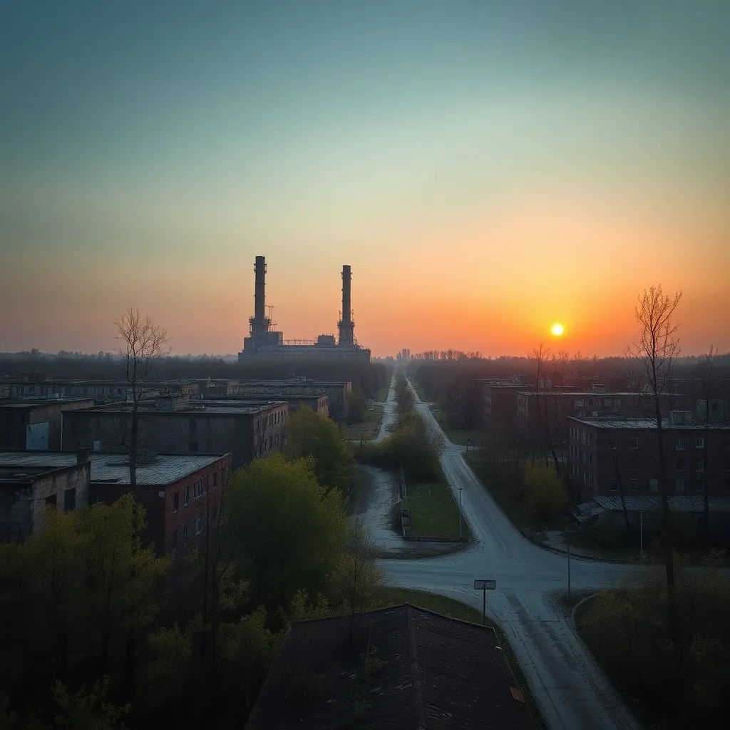 Imagine a hauntingly beautiful scene of the Chernobyl Exclusion Zone at dawn. The abandoned city of Pripyat lies still, with crumbling buildings and overgrown vegetation. In the distance, the iconic Reactor 4 looms, its damaged dome a stark reminder of the devastating nuclear disaster. Create a captivating image.