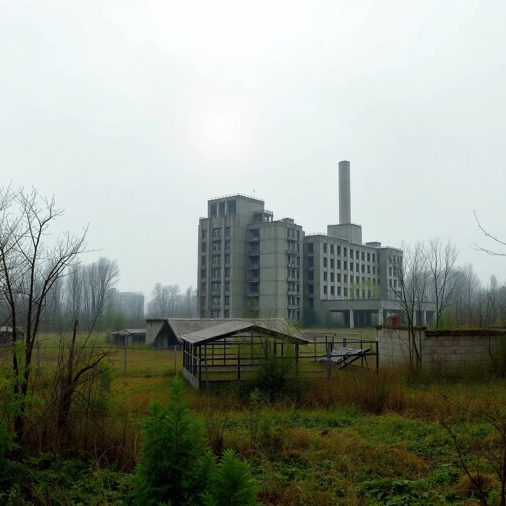 Imagine a hauntingly beautiful landscape of abandoned buildings, overgrown vegetation, and the eerie silence of the Chernobyl Exclusion Zone. Capture the surreal atmosphere of the 1986 nuclear disaster site, with the iconic Reactor 4 building in the distance, surrounded by a misty veil of uncertainty and forgotten history.