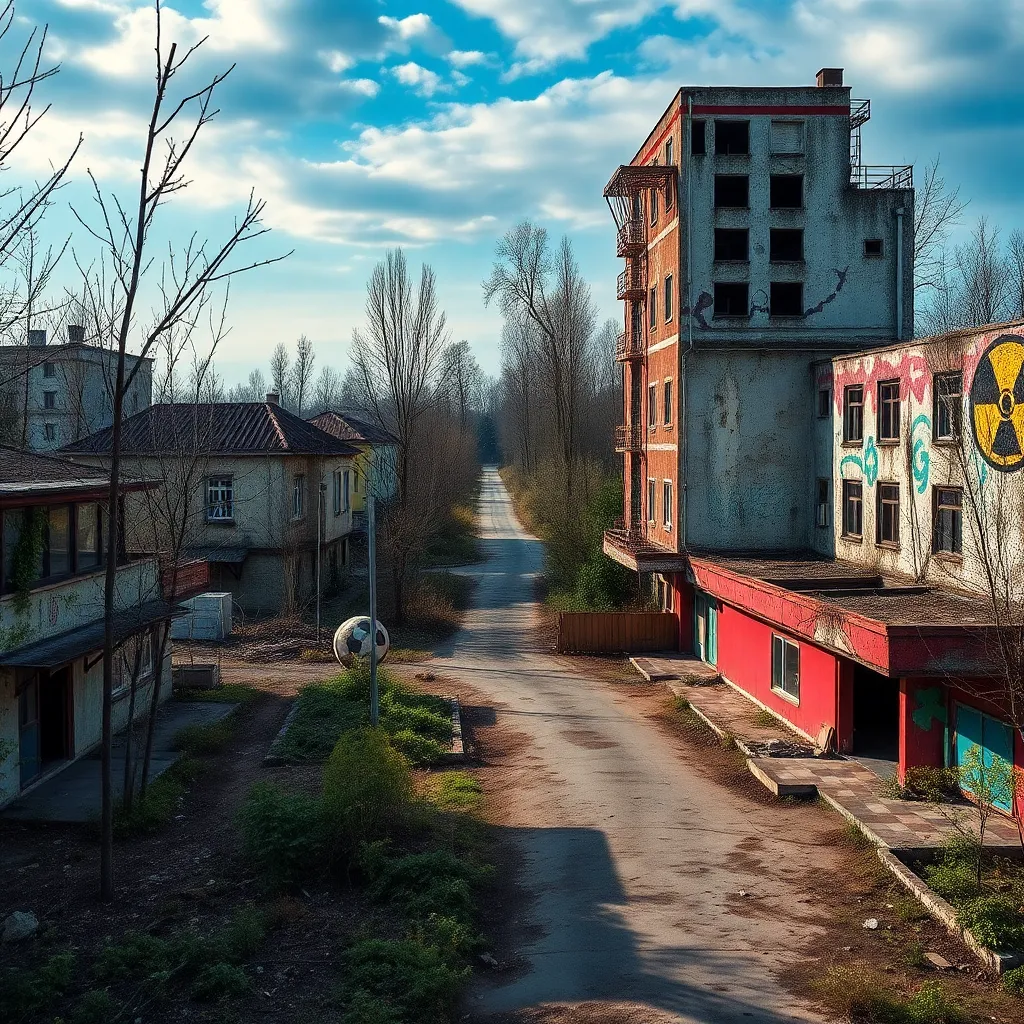 Explore the abandoned city of Pripyat, once home to Chernobyl's nuclear power plant. Capture the eerie atmosphere of the abandoned amusement park, crumbling buildings, and overgrown streets. Use vibrant colors to contrast with the desolate landscape, and include a hint of radiation symbol to represent the devastating nuclear disaster.
