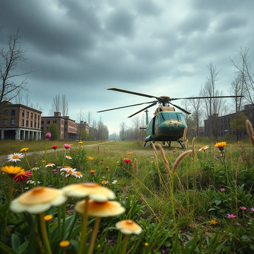 Capture the haunting beauty of the Chernobyl Exclusion Zone. Imagine a desolate, overgrown landscape with crumbling reactor buildings, abandoned streets, and eerie silence. Incorporate vibrant wildflowers, a rusted helicopter, and a faint glow of luminescent mushrooms in the foreground, evoking a sense of surrealism and unease.