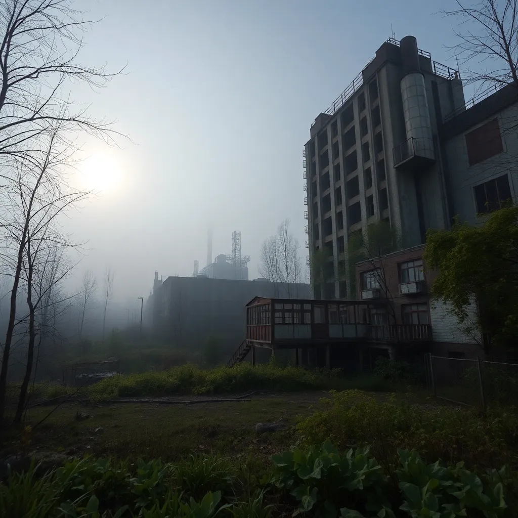 Imagine a hauntingly beautiful scene from the Chernobyl Exclusion Zone. A foggy morning in the abandoned city of Pripyat, with the iconic Reactor 4 building looming in the distance. The once-thriving streets are now overgrown with nature, with a sense of eerie silence. Capture the eerie atmosphere in your artwork.