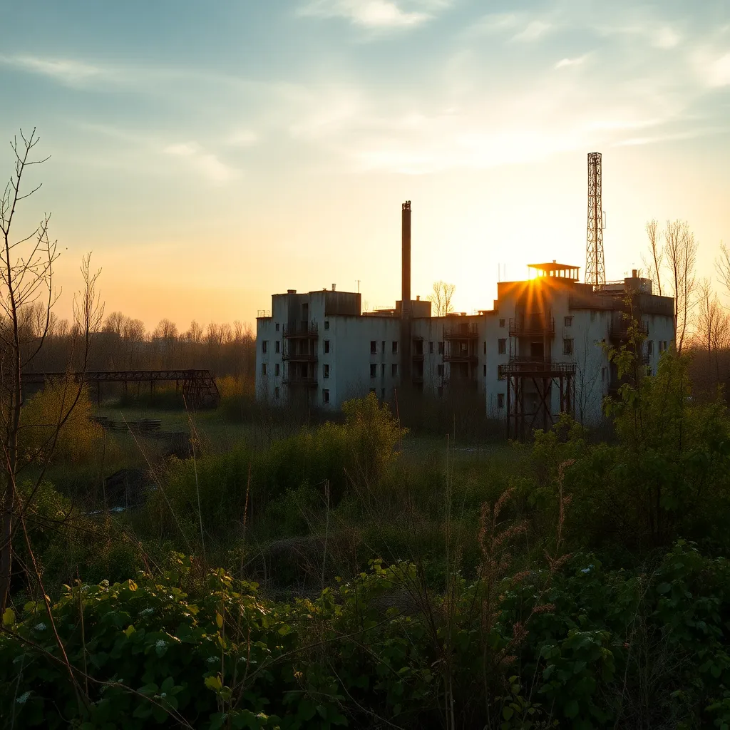 Capture the haunting beauty of the Chernobyl Exclusion Zone. Imagine a desolate landscape of overgrown reactors, crumbling buildings, and eerie silence. Incorporate iconic landmarks like the sarcophagus, abandoned settlements, and twisted metal sculptures. Convey the sense of abandonment and the whispers of the past in your AI-generated image.