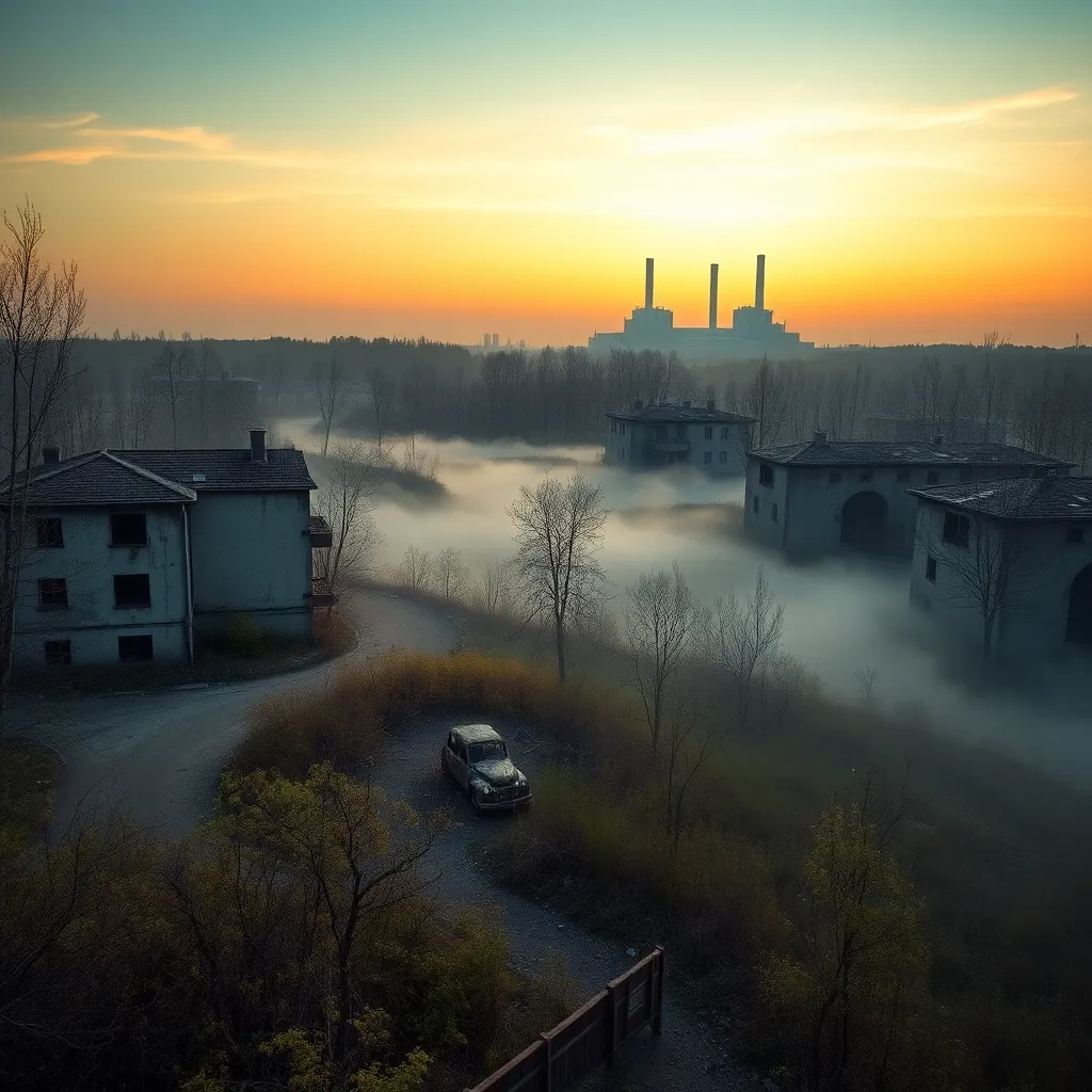 Imagine a hauntingly beautiful scene of the Chernobyl Exclusion Zone at dawn. The abandoned city of Pripyat lies in ruins, with crumbling buildings and overgrown vegetation. A misty fog rises from the ground, shrouding the desolate landscape. In the distance, the imposing Chernobyl Nuclear Power Plant looms, a grim reminder of the devastating disaster.