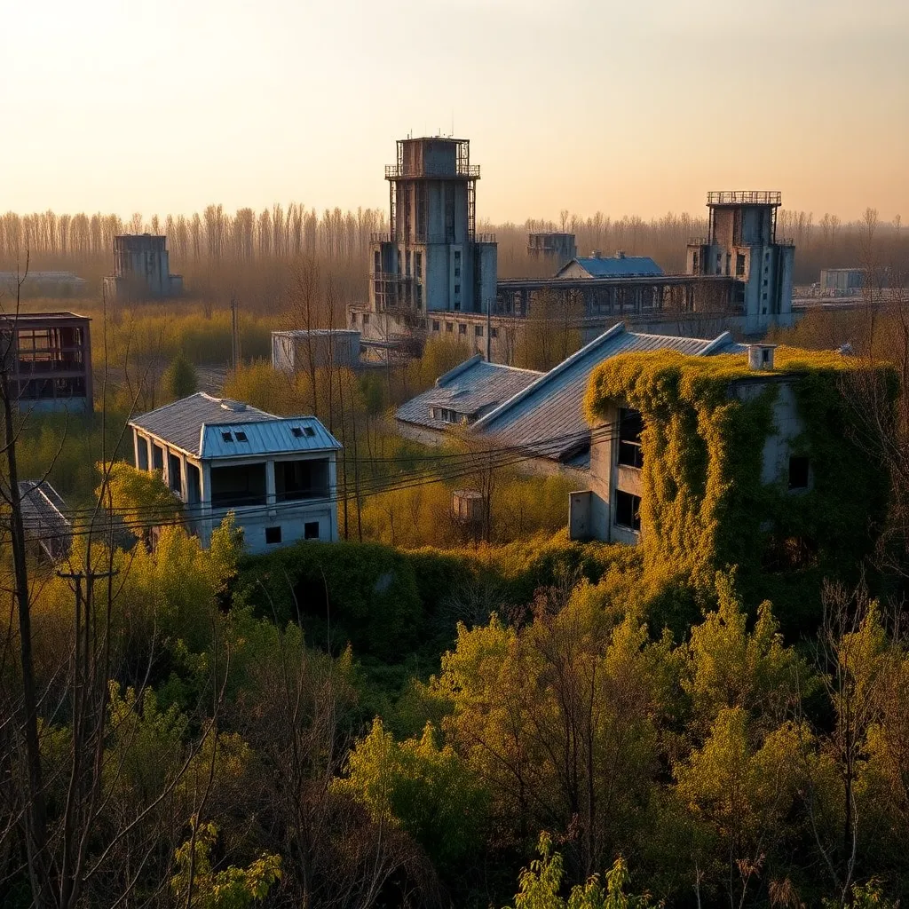 Capture the haunting beauty of the Chernobyl Exclusion Zone, where nature has reclaimed the ruins of the infamous nuclear power plant. Imagine a desolate landscape of crumbling buildings, overgrown vegetation, and eerie silhouettes, bathed in a haunting golden light. Convey the somber atmosphere of a site where history meets nature.