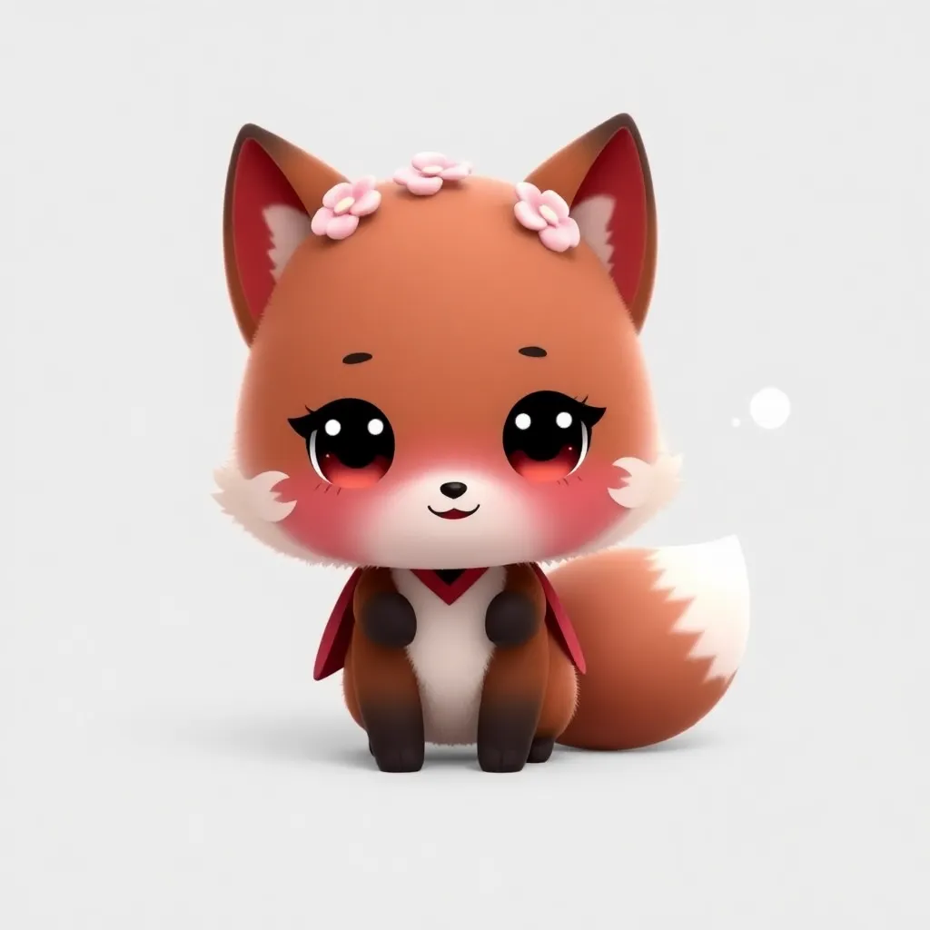 Create a whimsical, 3D chibi character inspired by Japanese folklore. Design a gentle, moon-worshiping kitsune (fox spirit) with soft, fluffy fur, big bright eyes, and a mischievous grin. Incorporate traditional Japanese elements, such as a cherry blossom crown or a wispy cloud-like aura, to complete the character's mystical charm.