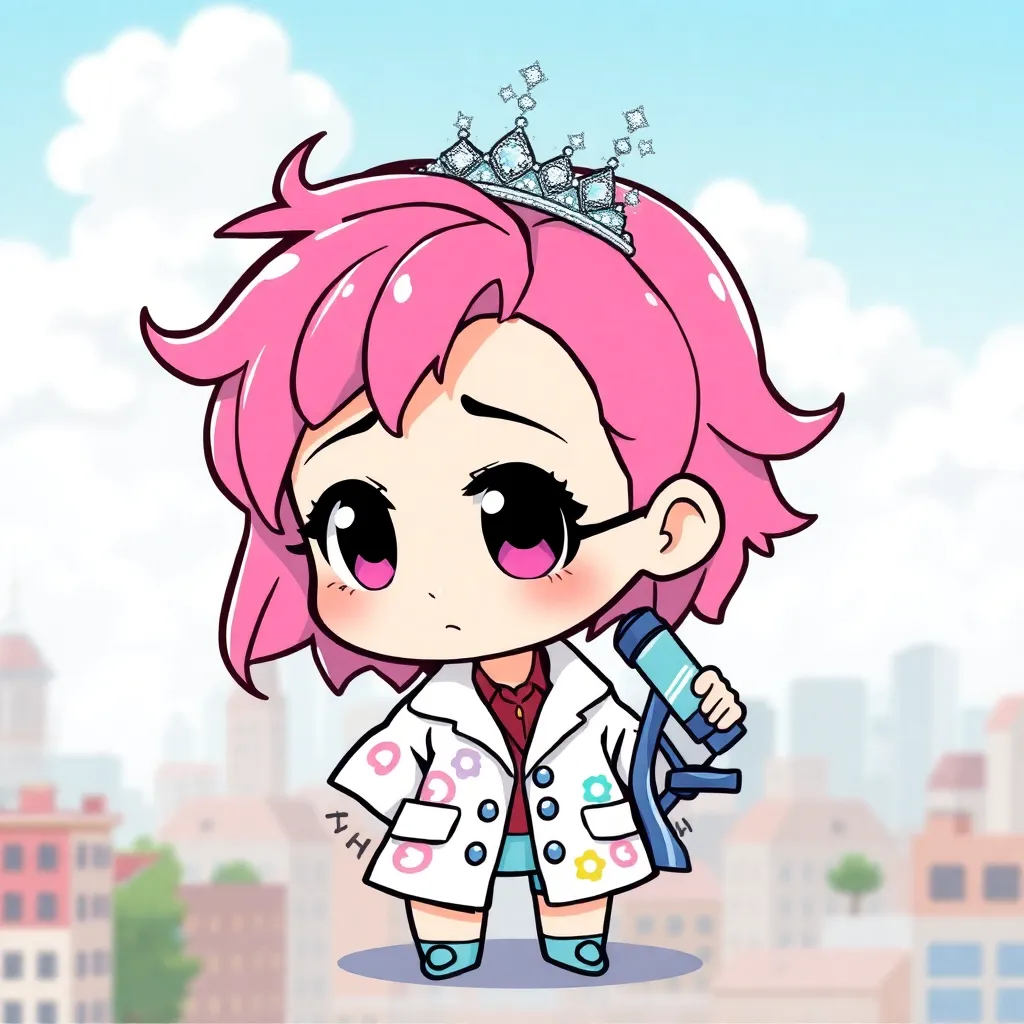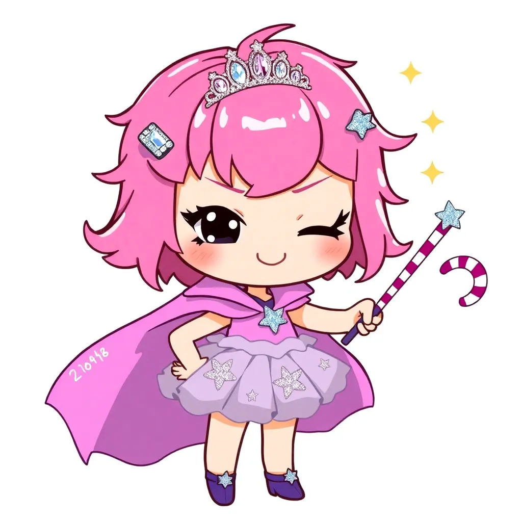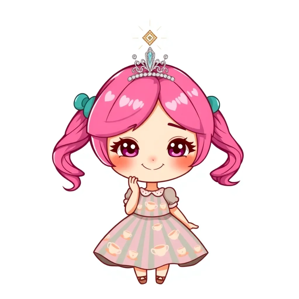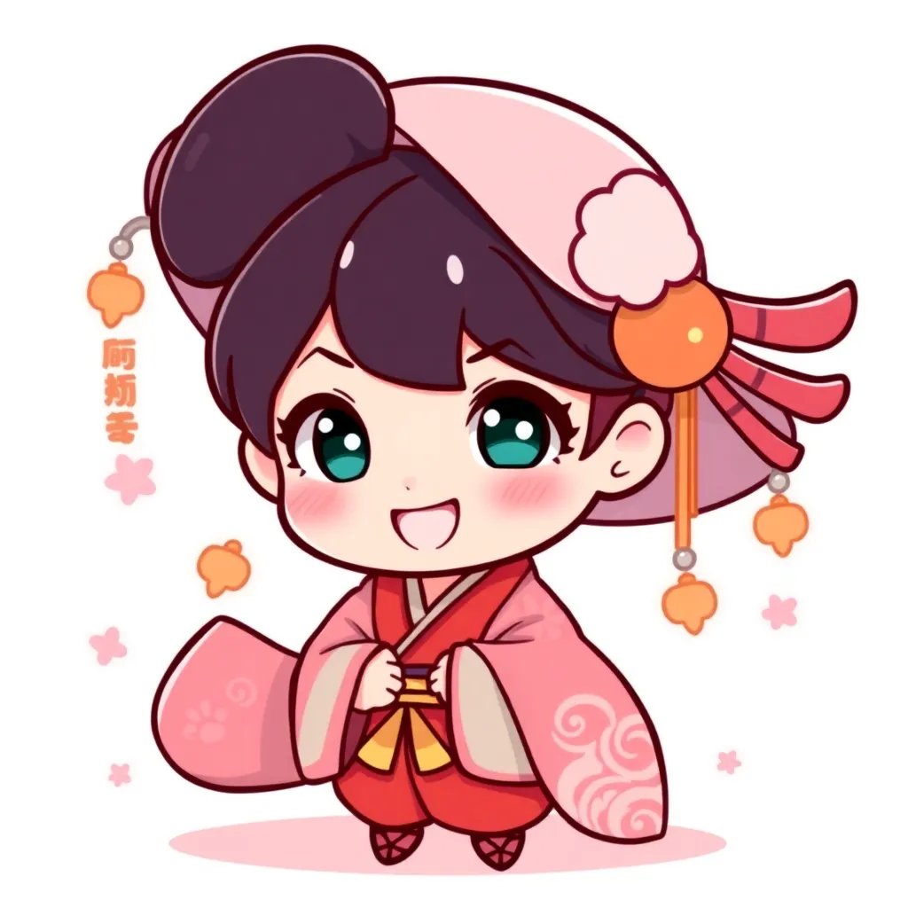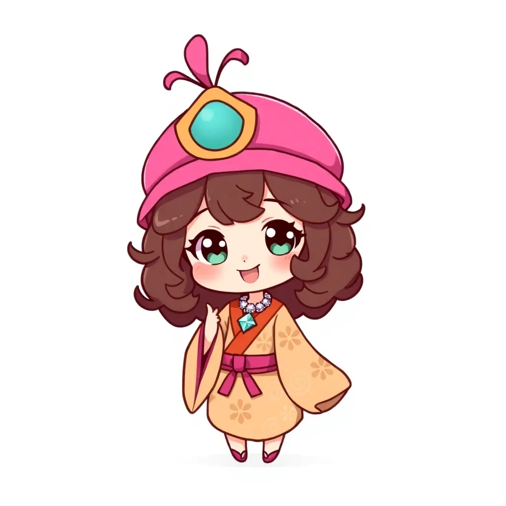 Create a whimsical chibi character with a playful expression, wearing a bright pink hat and a sparkly necklace. The character should have curly brown hair and big, shiny eyes. Design the outfit to resemble a traditional Japanese kimono, with intricate patterns and a flowing skirt. Make the character look adorable and lively!