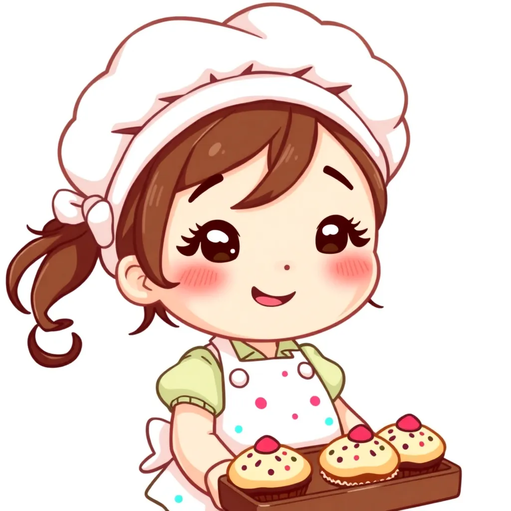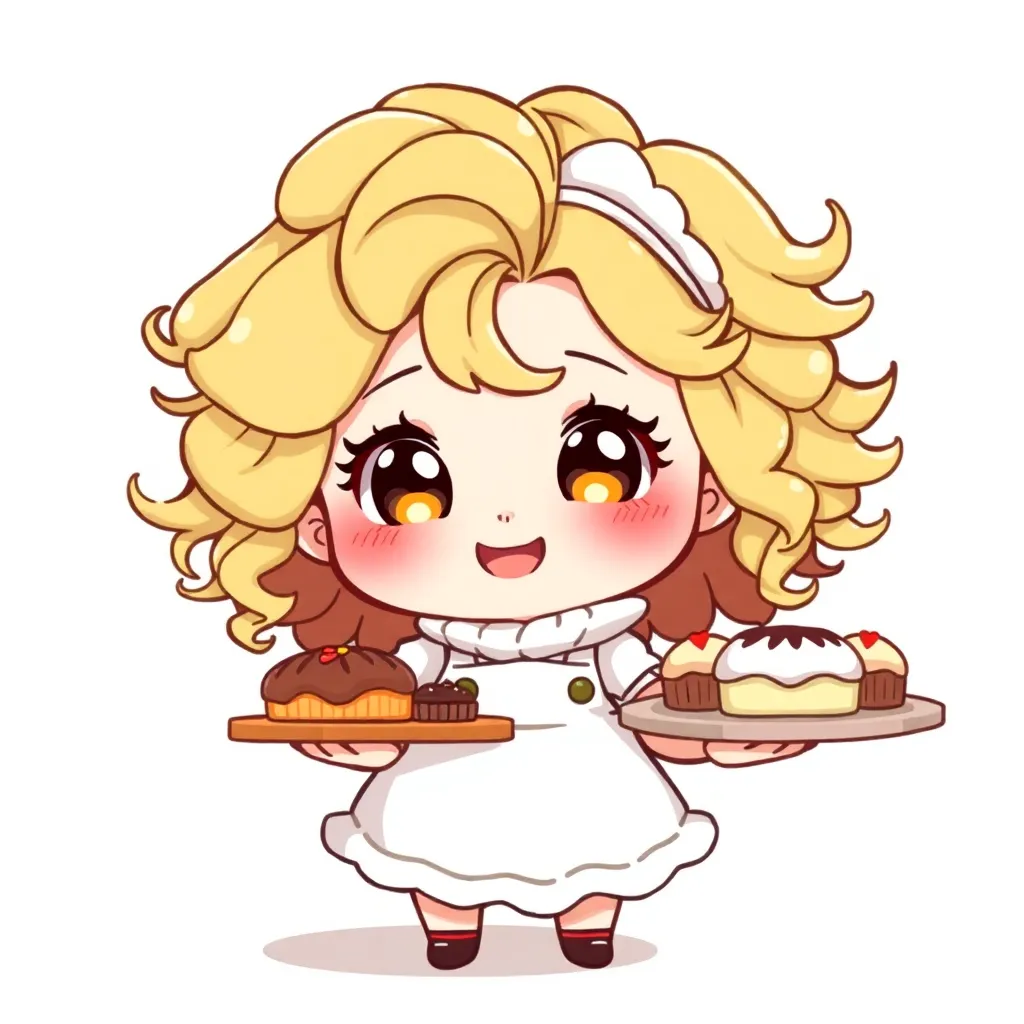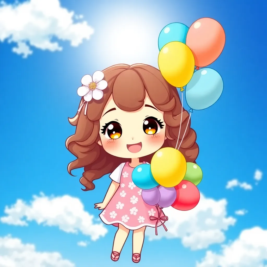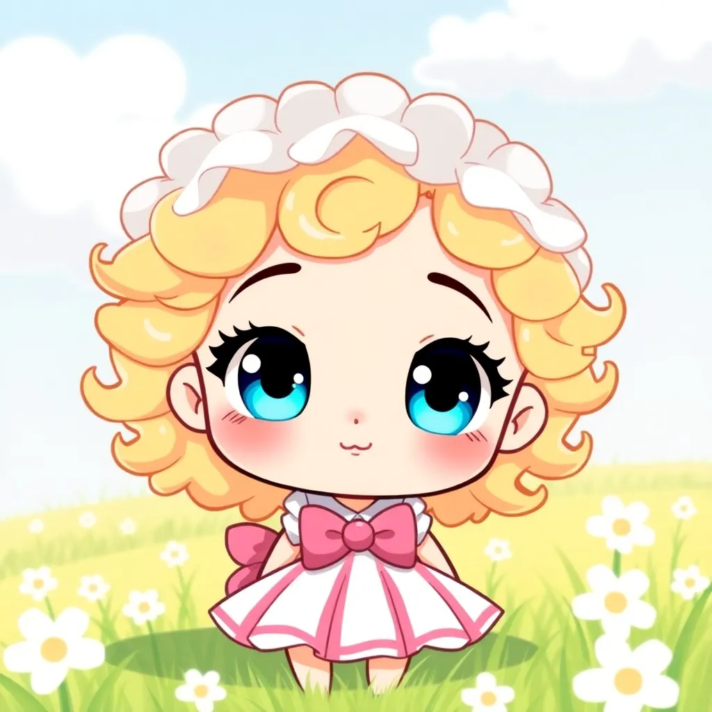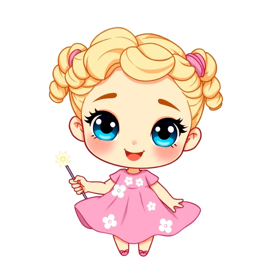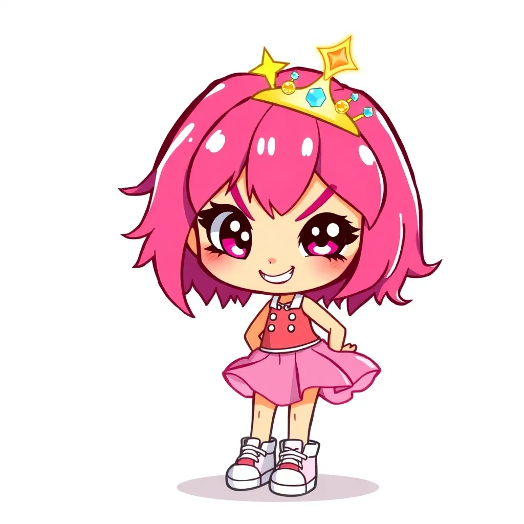 Create a whimsical chibi character with a playful expression, wearing a bright pink hat and a sparkly necklace. The character should have curly brown hair and big, shiny eyes. Design the outfit to resemble a traditional Japanese kimono, with intricate patterns and a flowing skirt. Make the character look adorable and lively!