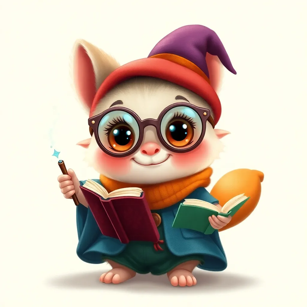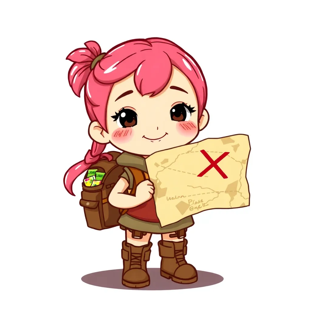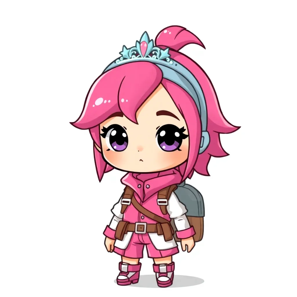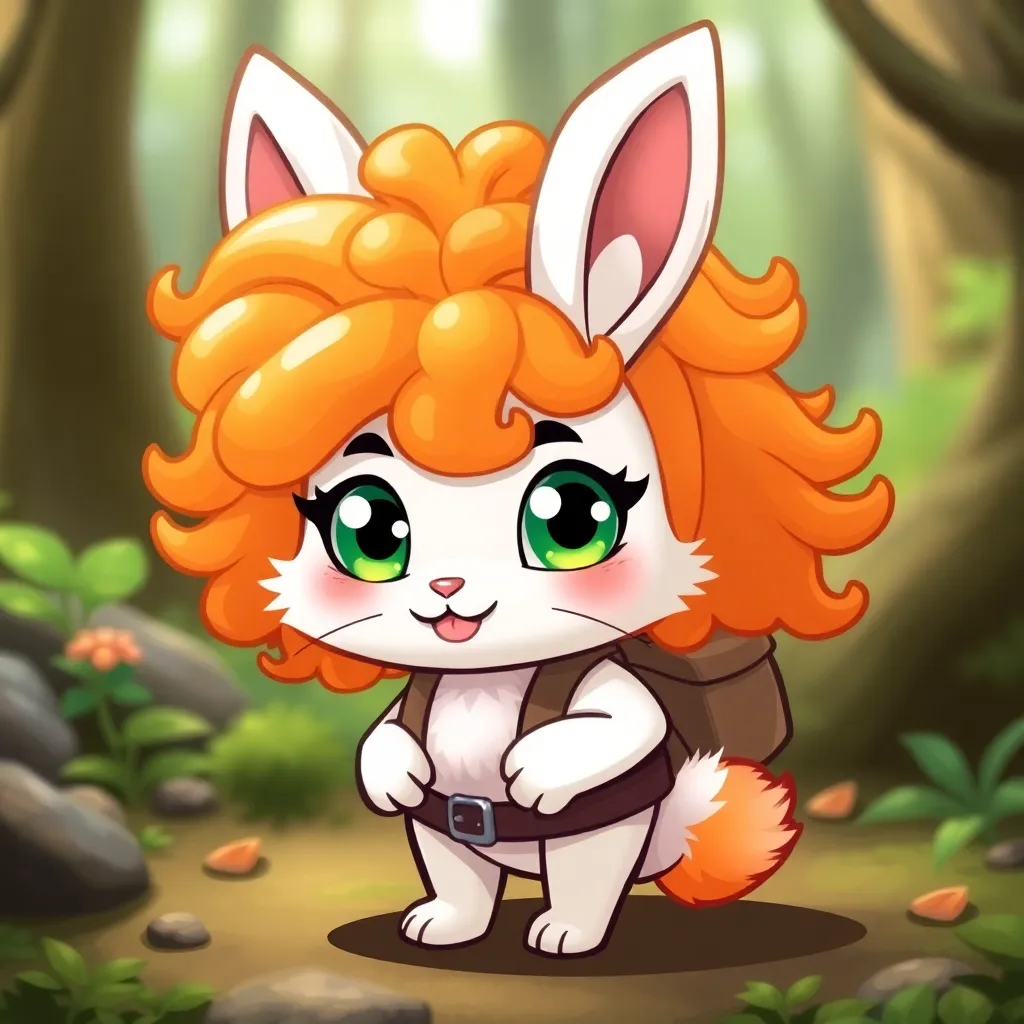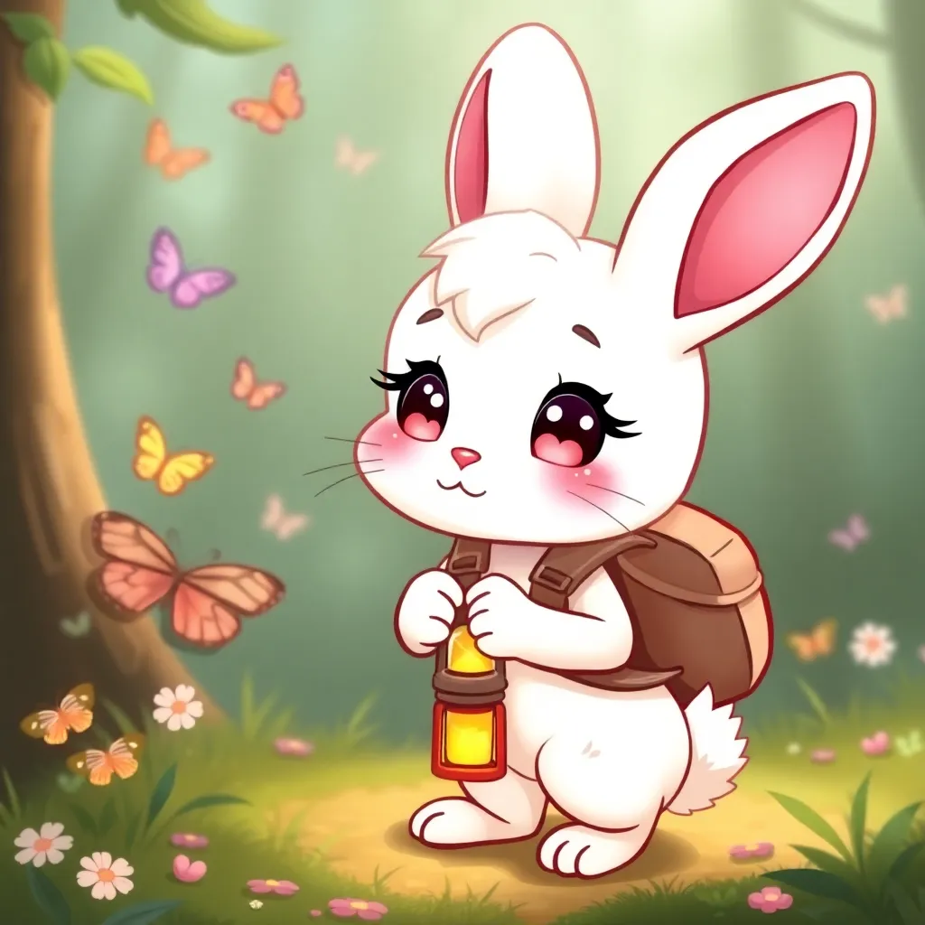 Create a chibi character that is a curious and adventurous young rabbit named Rosie. She loves to explore the forest, play with butterflies, and sniff out hidden treasures. Her fur is a soft, creamy white with bright pink accents on her ears, nose, and tail. She wears a tiny backpack and carries a miniature lantern.