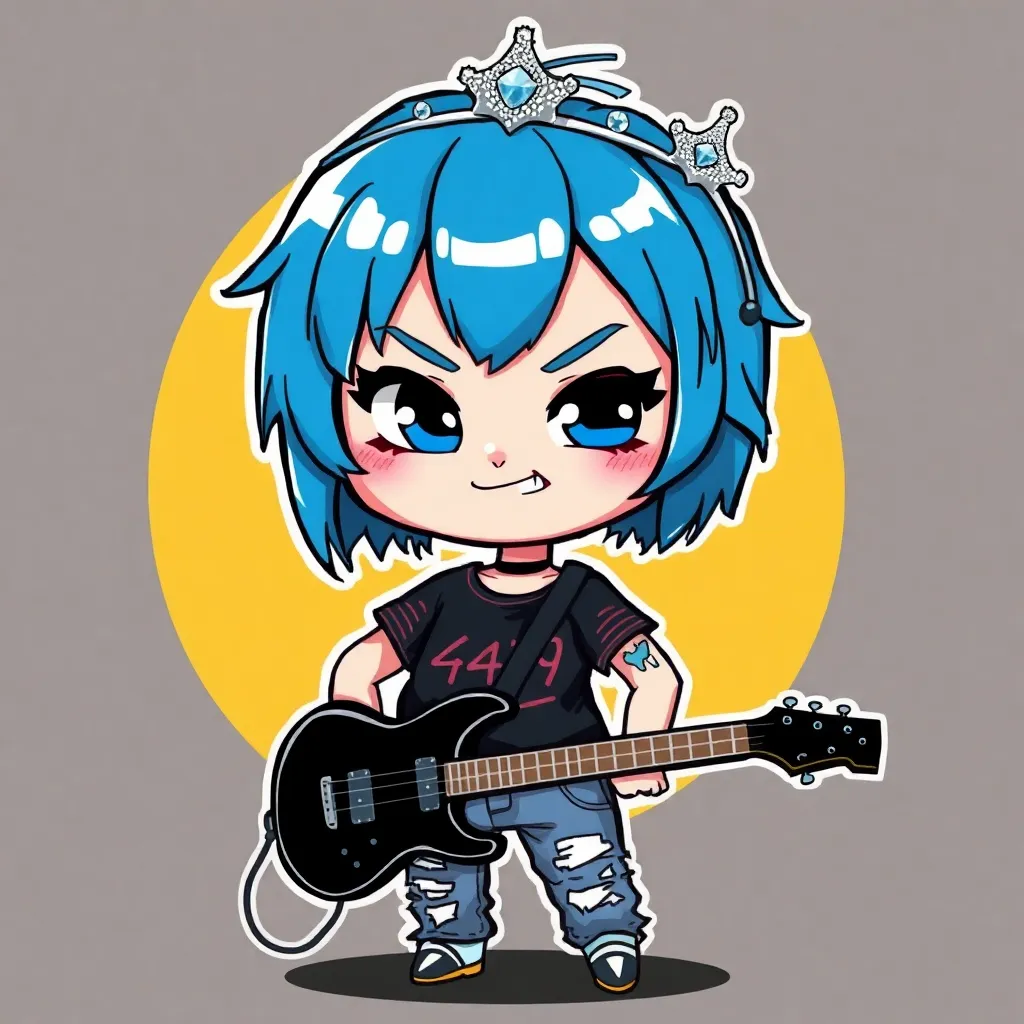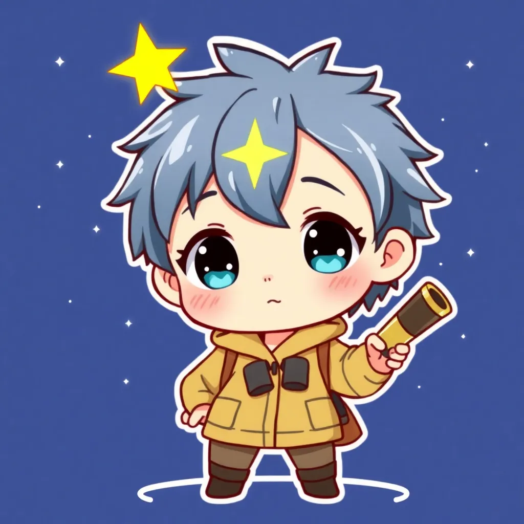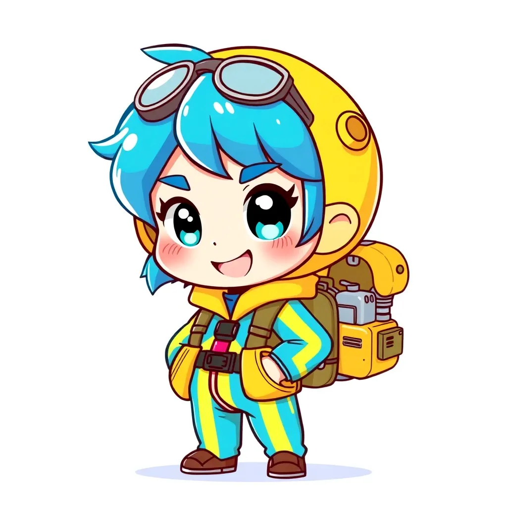 Create a whimsical, adventurous chibi character! This curious explorer has bright blue hair, a mischievous grin, and a backpack full of curious contraptions. They're dressed in a vibrant, striped jumpsuit and have a pair of goggles perched on their forehead. What's their name and what's their next discovery?