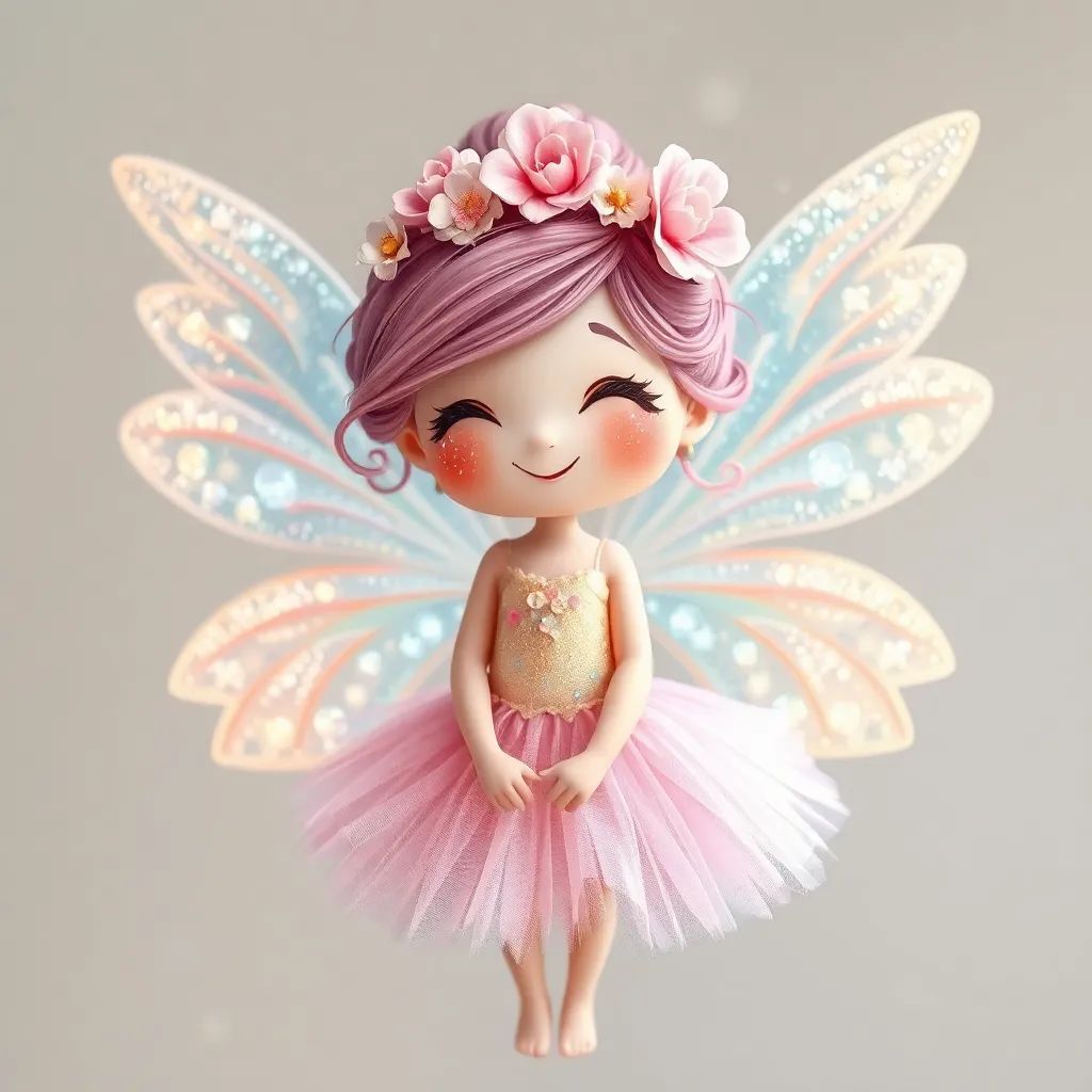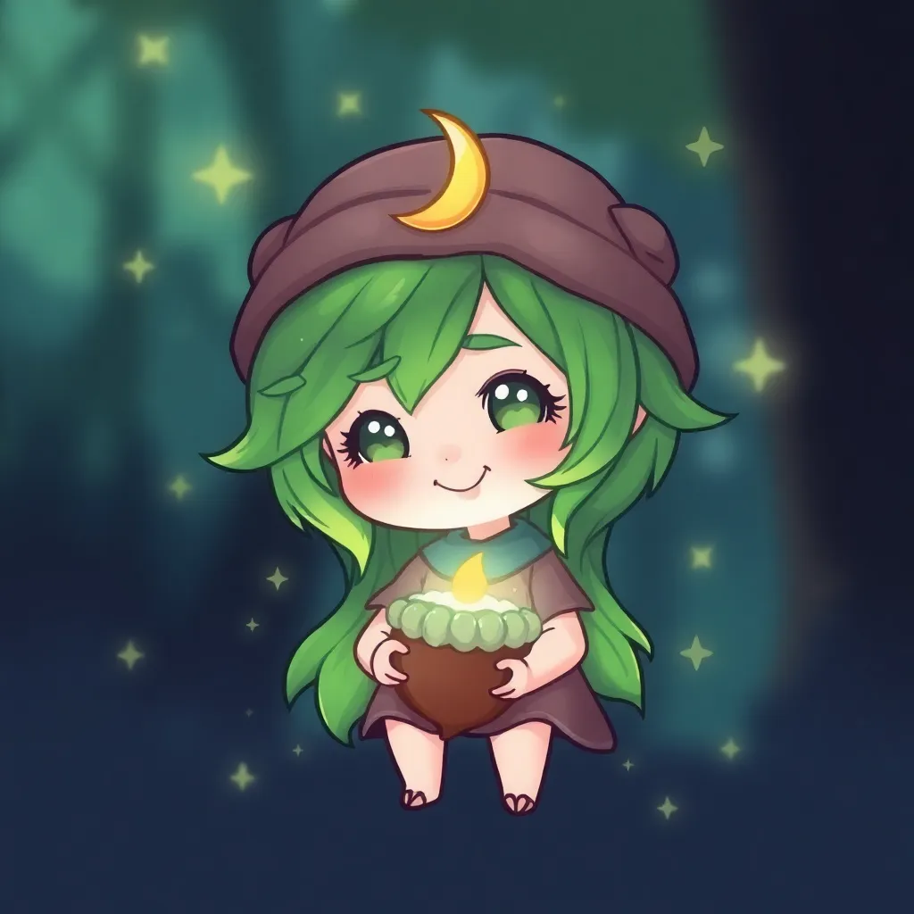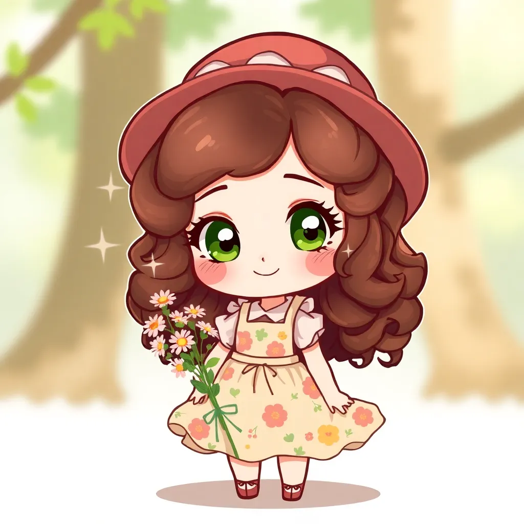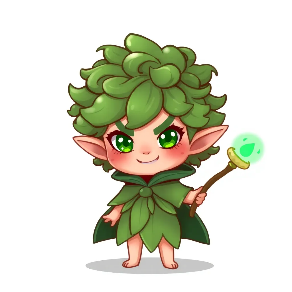 Create a whimsical chibi character for a fantasy world of lush forests and sparkling waterfalls. Design a curious, green-haired girl with a mischievous grin, wearing a leafy cloak and holding a delicate, glowing flower. Incorporate natural elements and subtle sparkles to bring this enchanting character to life!