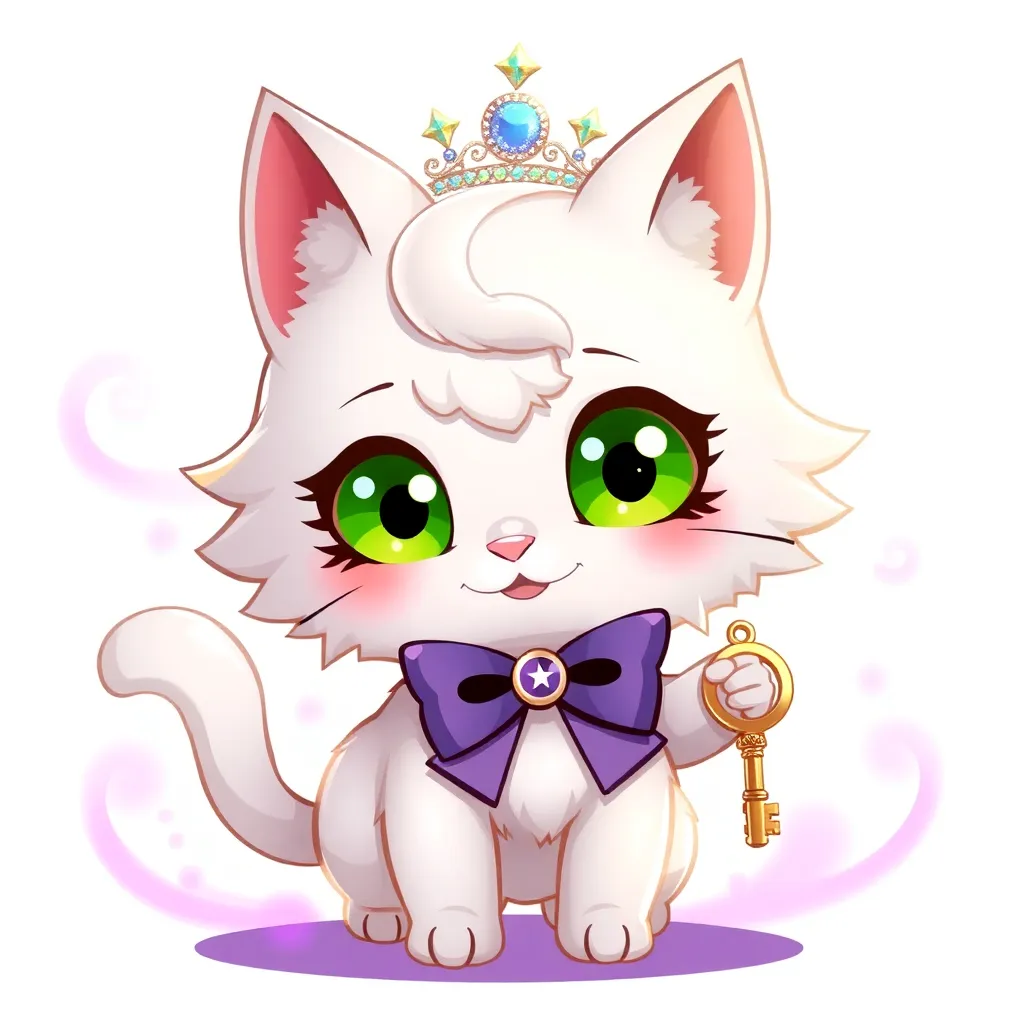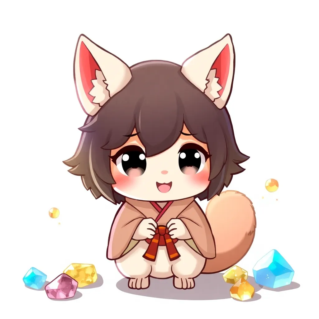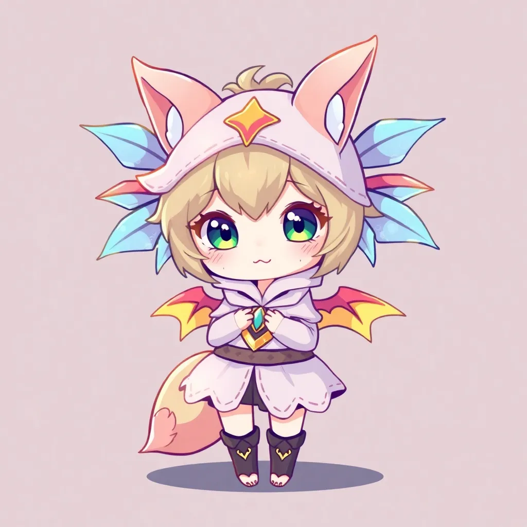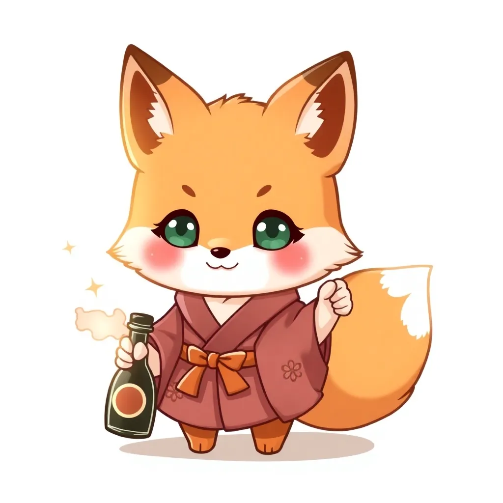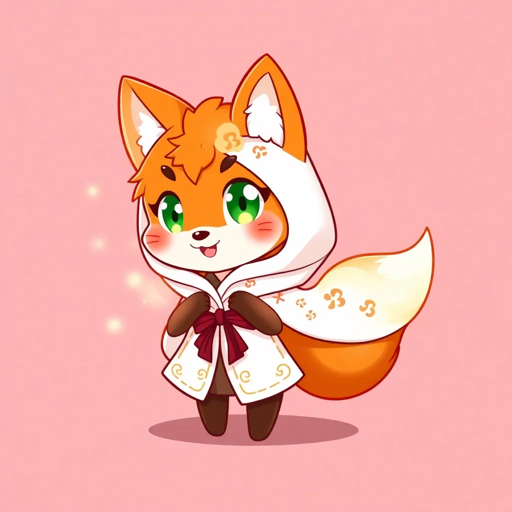 Create a whimsical chibi character inspired by Japanese folklore. Design a cheerful kitsune fox spirit with bright orange fur, sparkly green eyes, and a mischievous grin. Add a flowing white cloak with intricate red stitching and a pair of delicate, glowing wings. Generate an image that radiates warmth and playfulness!