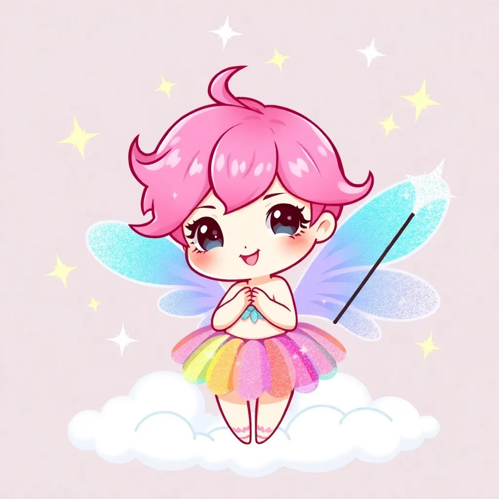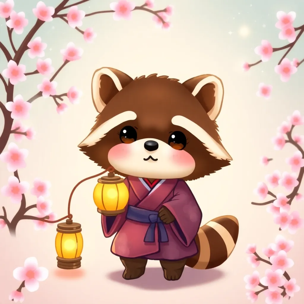 Create a whimsical chibi character inspired by Japanese folklore, with a mischievous grin and a twinkle in their eye. They should be wearing a traditional kimono, but with a modern twist (e.g. neon accents, bold patterns). Generate an image with a dreamy, pastel-colored background to match their playful vibe.