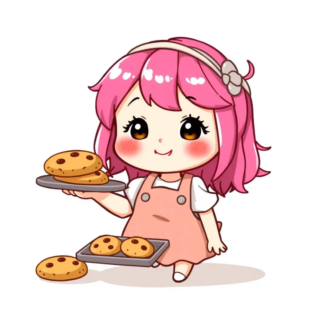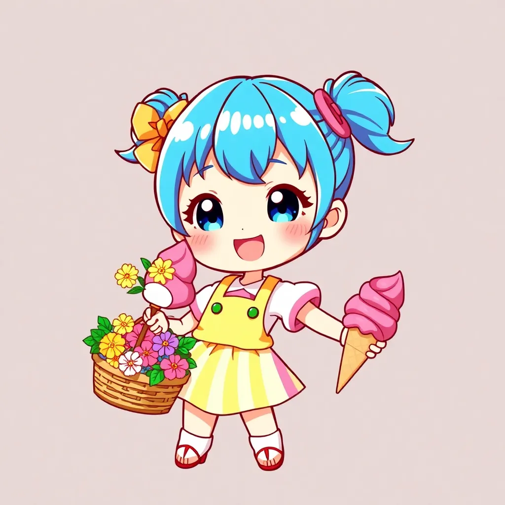 Create a whimsical chibi character wearing a bright yellow sundress with white flowers, holding a basket of freshly picked strawberries and standing in front of a vibrant pink sunset. The character should have big, sparkling eyes and a cheerful smile, with a few freckles scattered across their nose.
