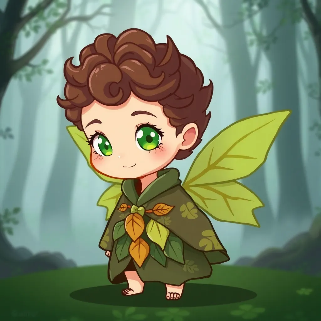 Create a whimsical chibi character for a mystical forest guardian. The character should have bright green eyes, curly brown hair, and a gentle smile. They should be dressed in a flowing leaf-patterned robe with a pair of delicate wings sprouting from their back. The background should feature a misty forest glade.