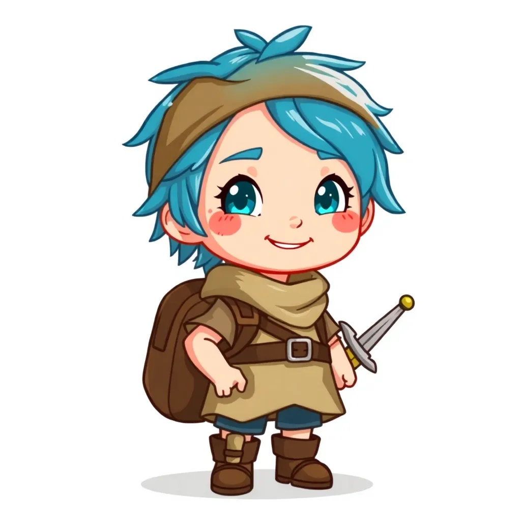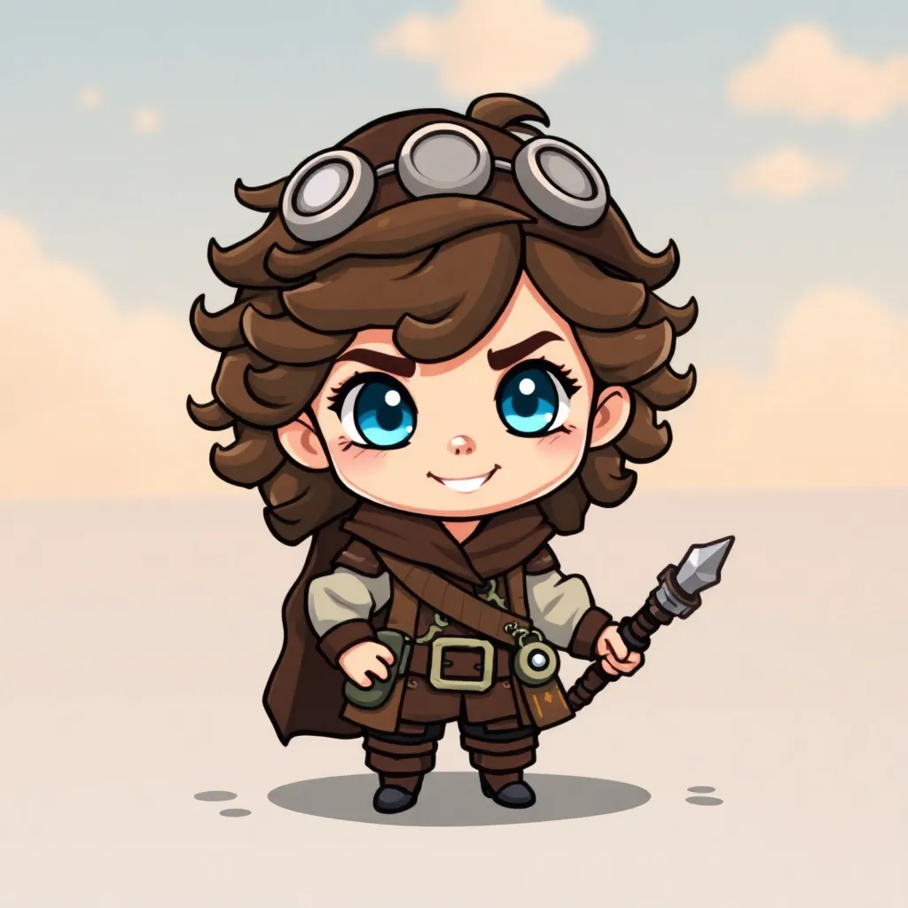 Create a playful, adventurous chibi character for a fantasy world! The character should be a young, curious explorer with a love for discovering hidden treasures and solving puzzles. They should have bright eyes blue, curly brown hair, and a mischievous grin. Dress them in a mix of medieval and steampunk attire.