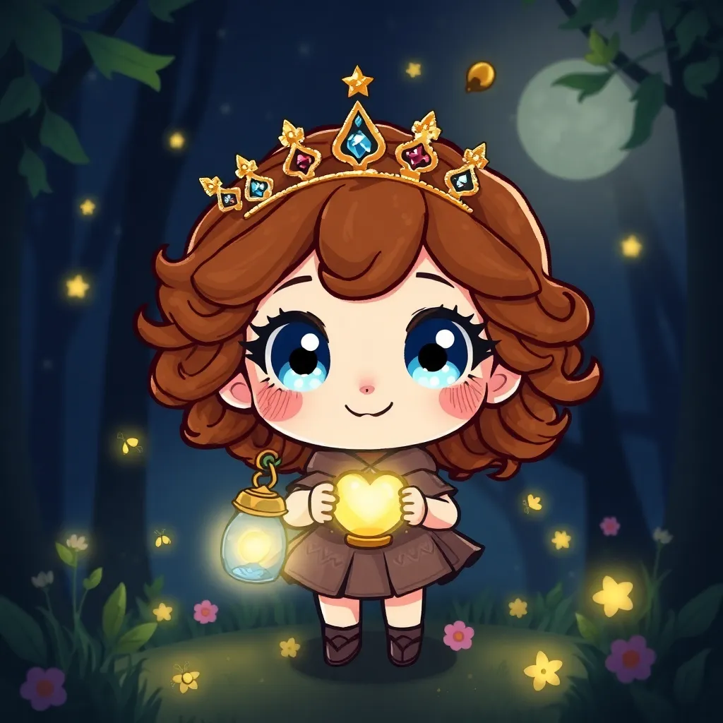 Create a whimsical chibi character who loves to explore the magical forest at night, wearing a sparkly crown and carrying a glowing lantern. The character should have bright blue eyes, curly brown hair, and a mischievous grin. Incorporate forest elements like leaves, flowers, and fireflies into the design.