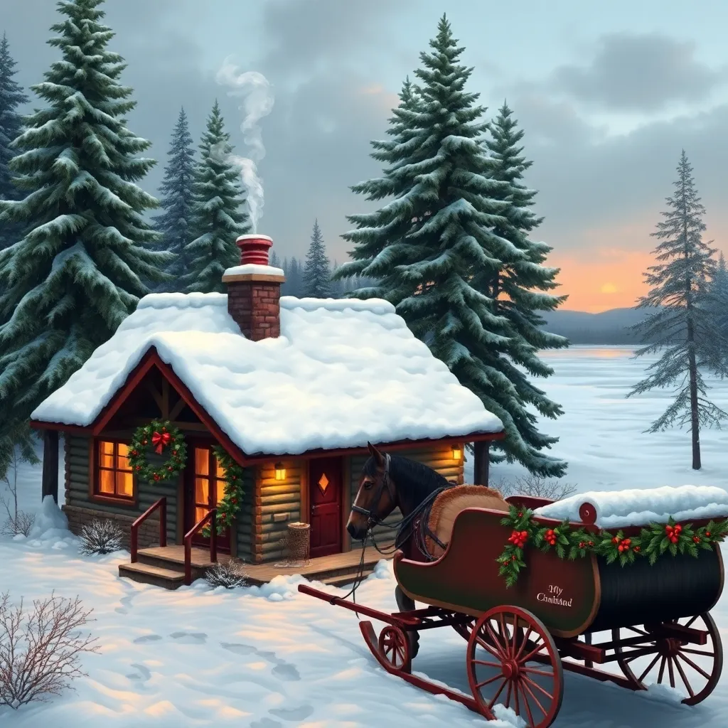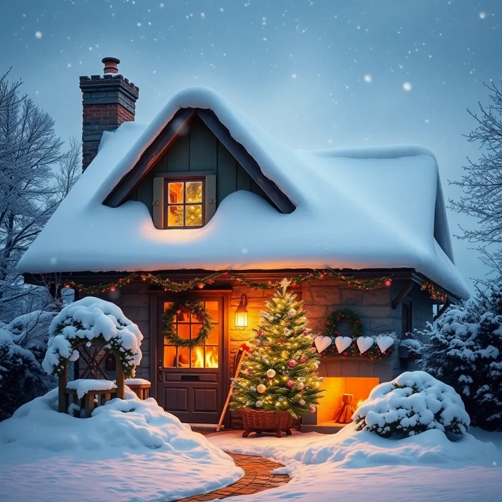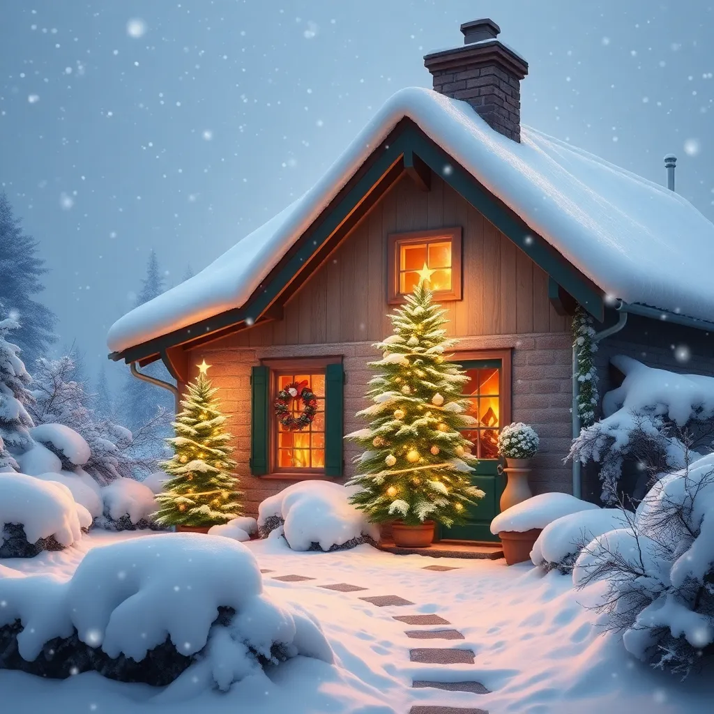 Create an image of a cozy winter wonderland scene, featuring a snow-covered cabin with smoke billowing from the chimney, surrounded by towering evergreen trees, twinkling fairy lights, and a blanket of snowflakes gently falling from the sky. Incorporate warm and inviting colors to evoke a sense of festive cheer.