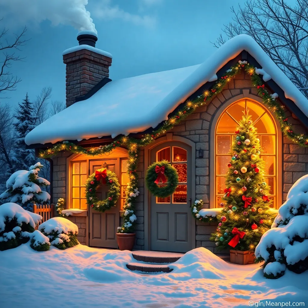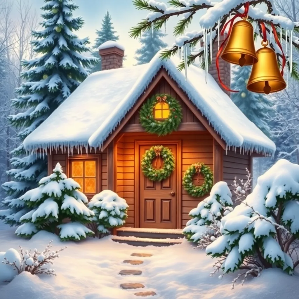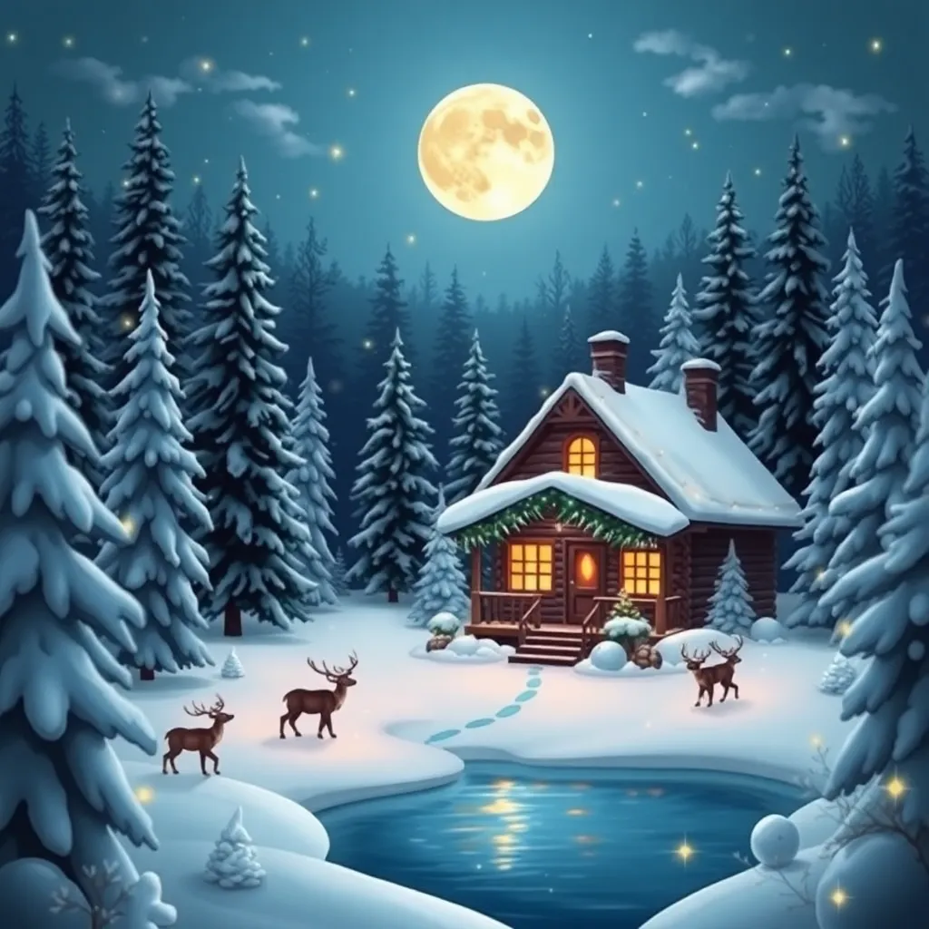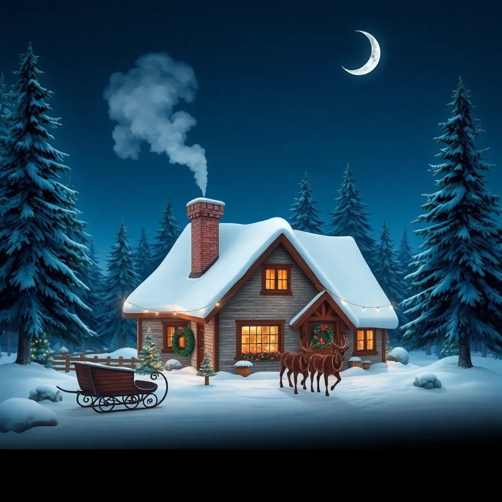 Create an image of a cozy winter wonderland scene, featuring a snow-covered cabin with smoke billowing from the chimney, surrounded by towering evergreen trees, twinkling fairy lights, and a blanket of snowflakes gently falling from the sky. Incorporate warm and inviting colors to evoke a sense of festive cheer.
