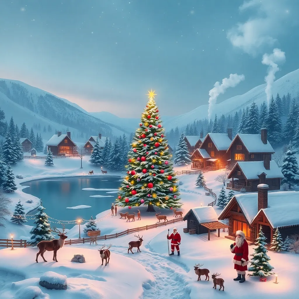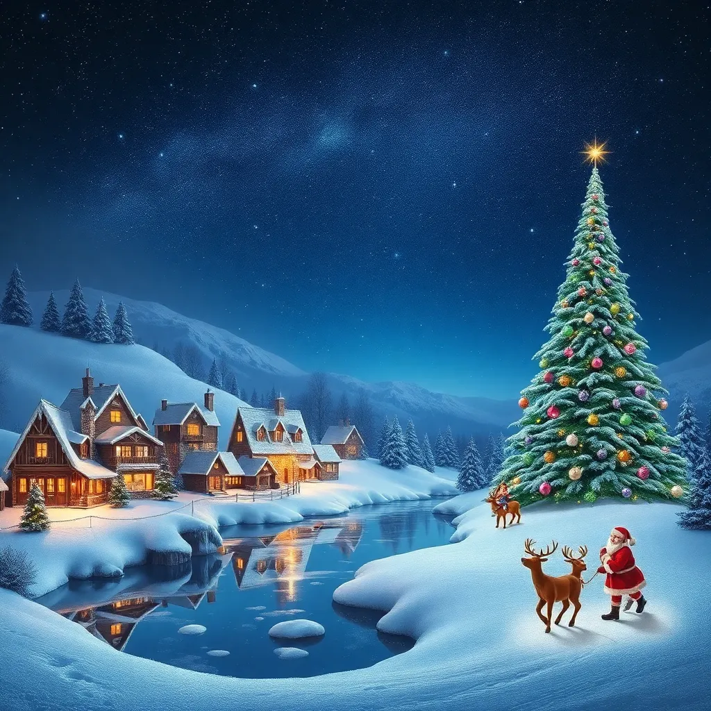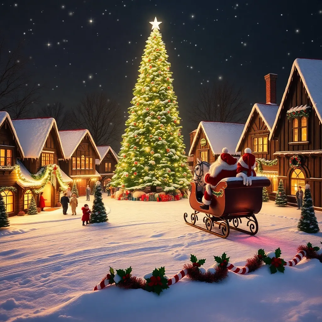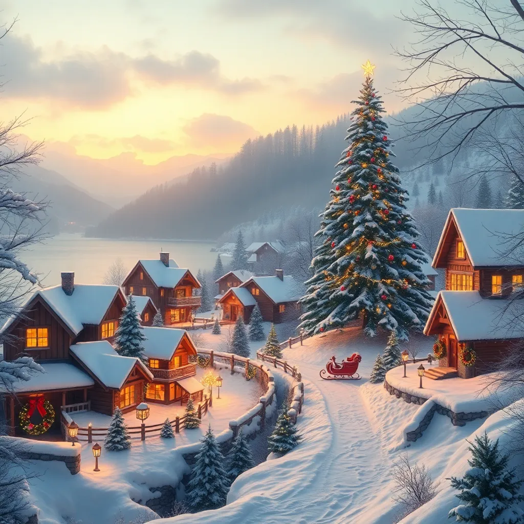 Create an idyllic winter wonderland scene for Christmas. Depict a snow-covered village with twinkling lights, a frozen lake, and a towering Christmas tree. Incorporate festive details like wreaths, garlands, and Santa's sleigh, all bathed in warm golden light. Capture the magic and coziness of the holiday season.