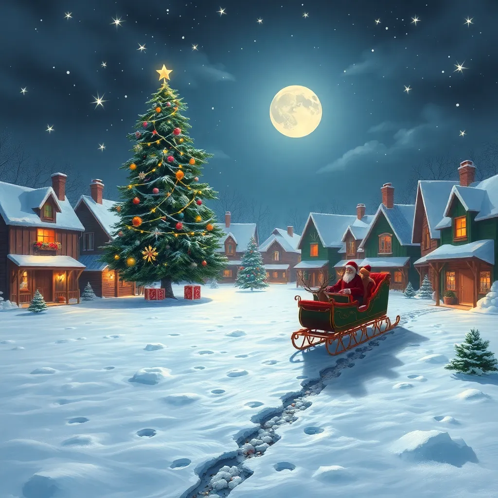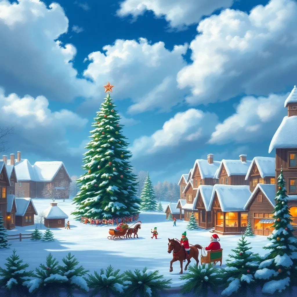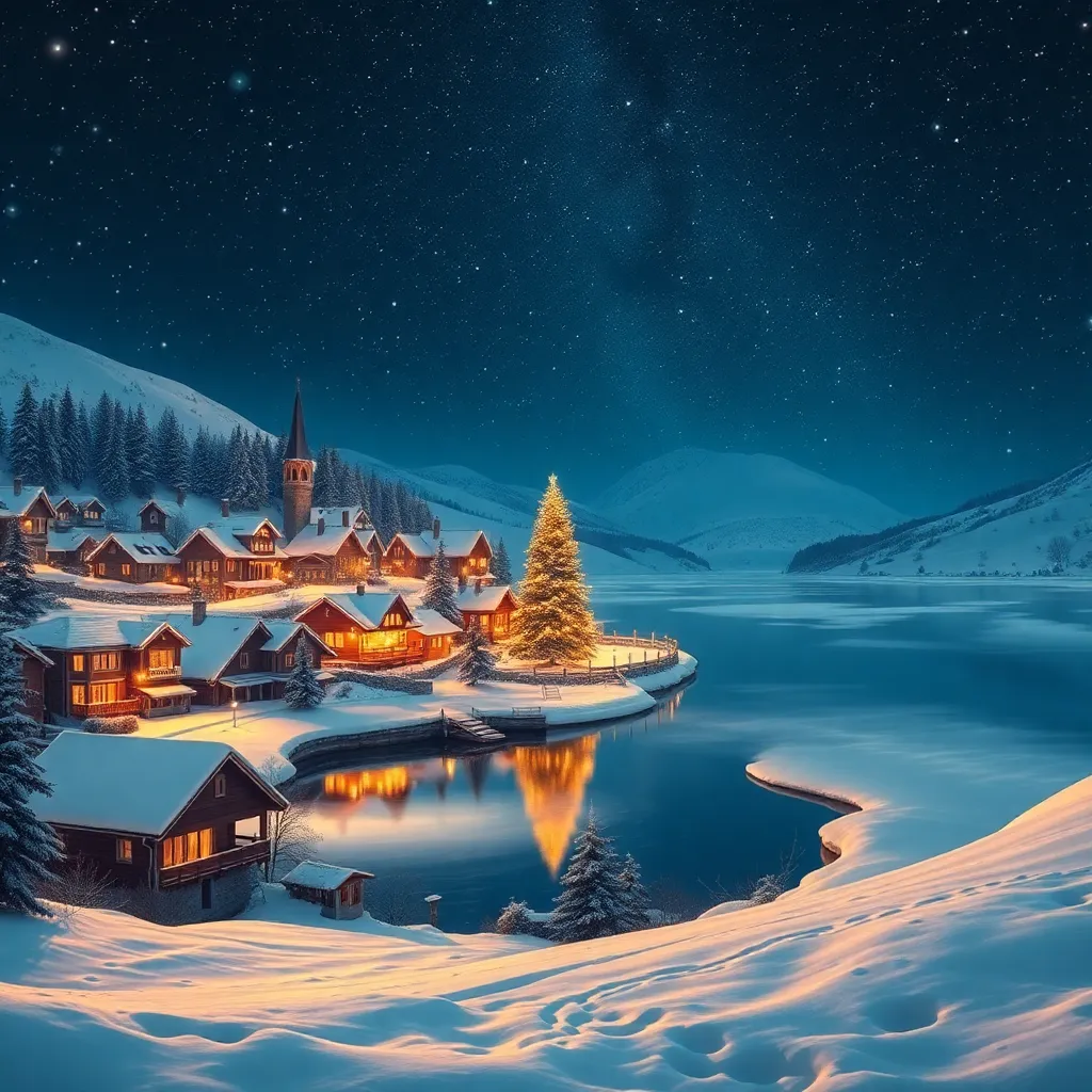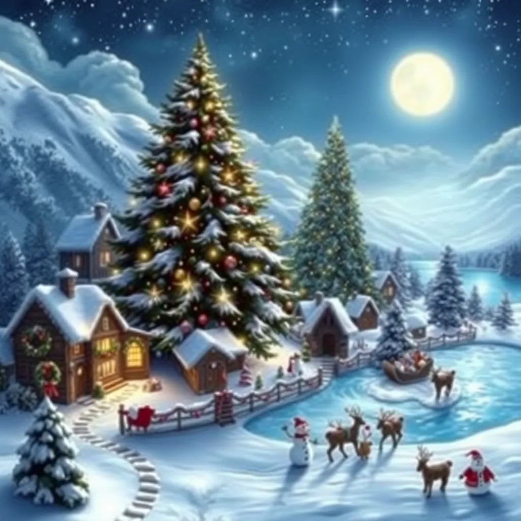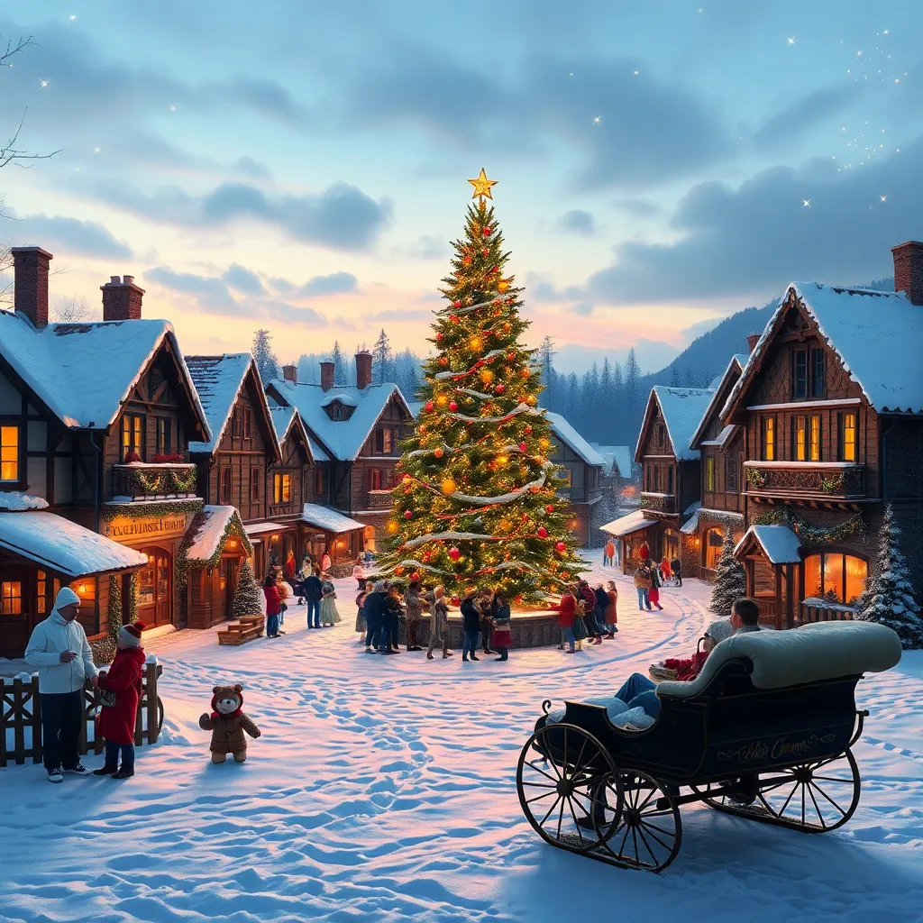 Create an idyllic winter wonderland scene for Christmas. Depict a snow-covered village with twinkling lights, a frozen lake, and a towering Christmas tree. Incorporate festive details like wreaths, garlands, and Santa's sleigh, all bathed in warm golden light. Capture the magic and coziness of the holiday season.