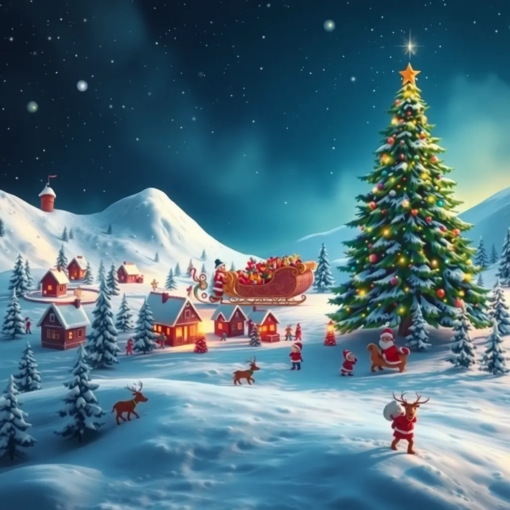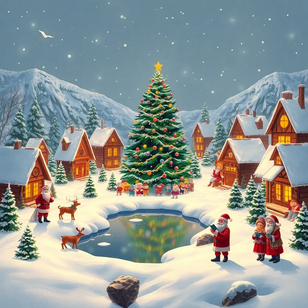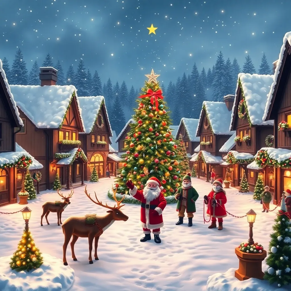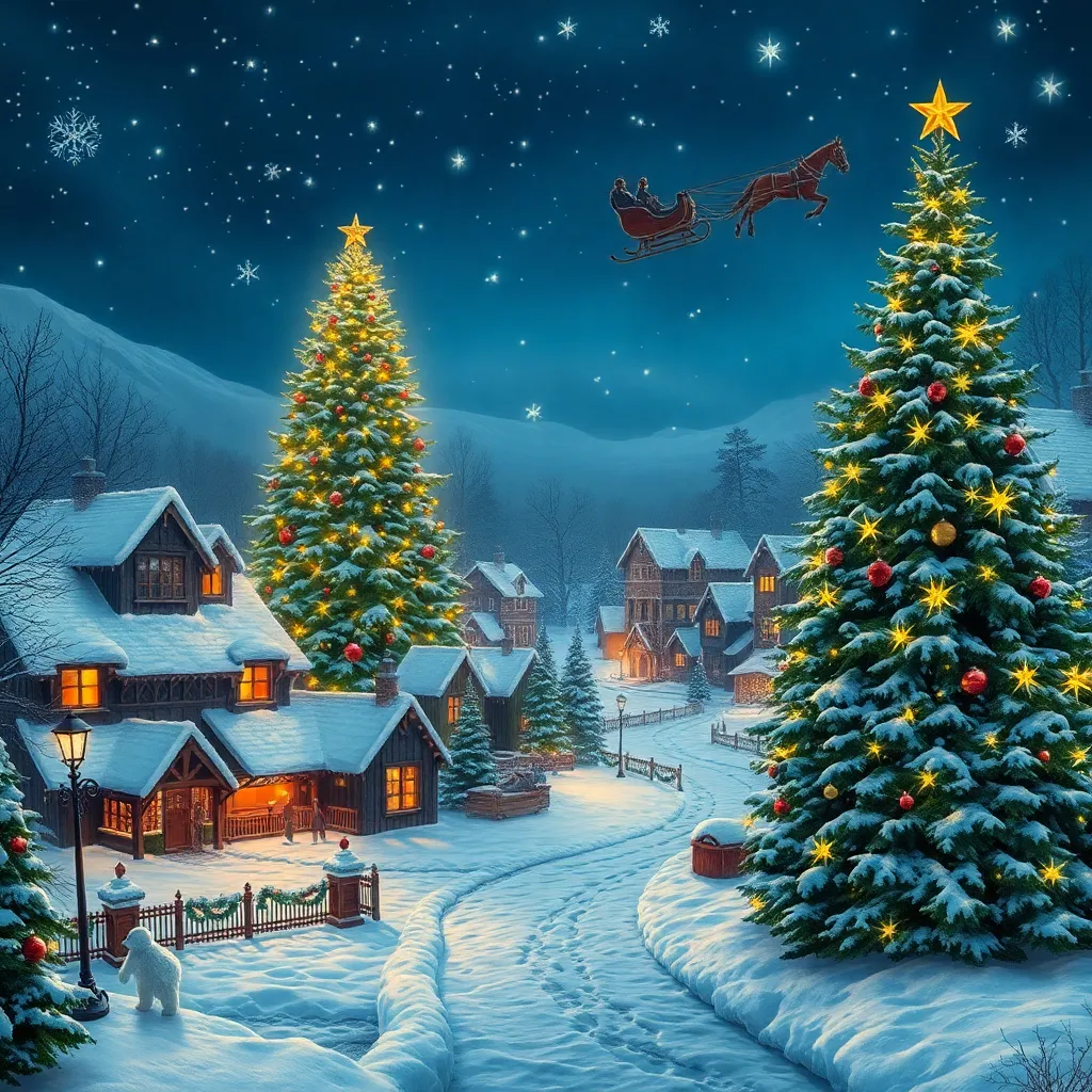 Create an idyllic winter wonderland scene for Christmas. Depict a snow-covered village with twinkling lights, a frozen lake, and a towering Christmas tree. Incorporate festive details like wreaths, garlands, and Santa's sleigh, all bathed in warm golden light. Capture the magic and coziness of the holiday season.