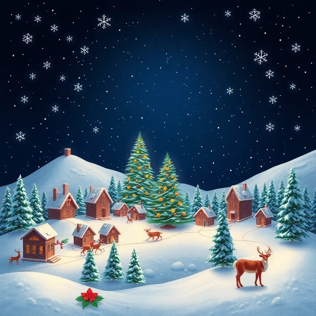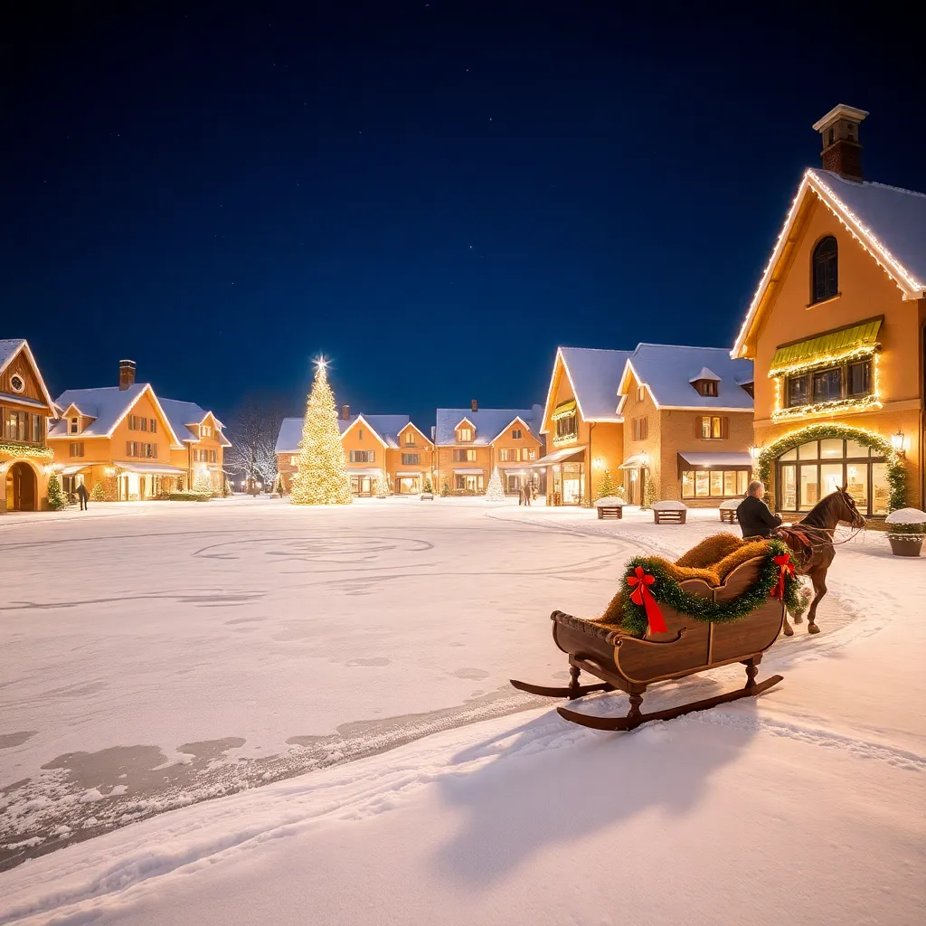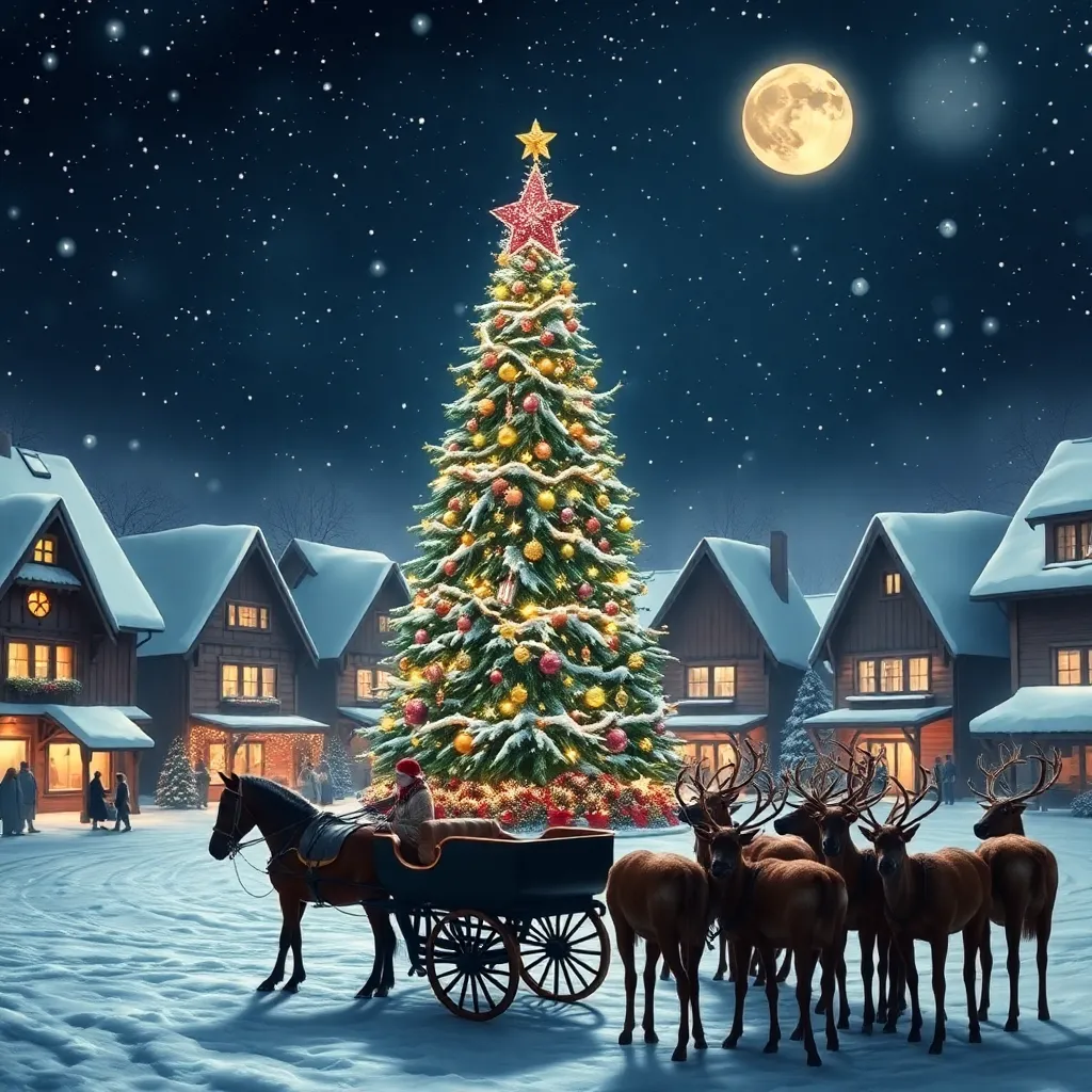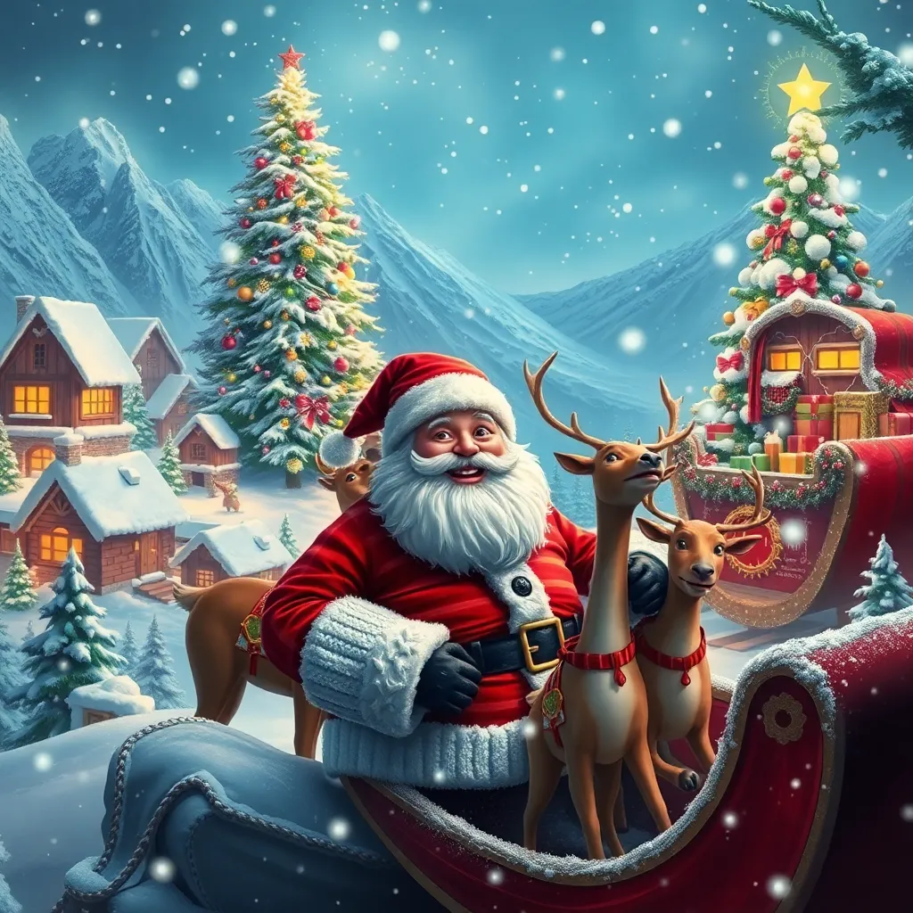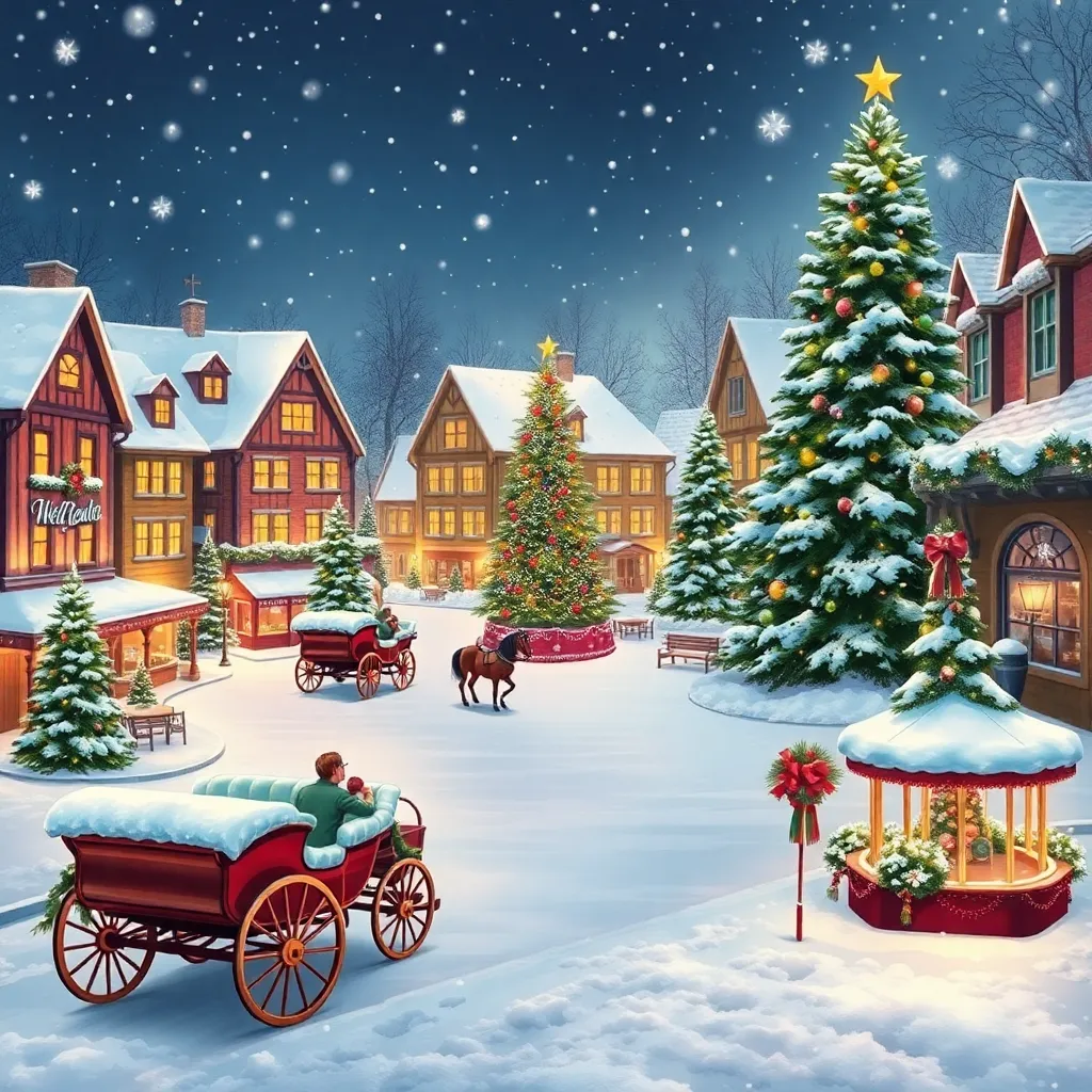 Create an idyllic winter wonderland scene for Christmas. Depict a snow-covered village with twinkling lights, a frozen lake, and a towering Christmas tree. Incorporate festive details like wreaths, garlands, and Santa's sleigh, all bathed in warm golden light. Capture the magic and coziness of the holiday season.