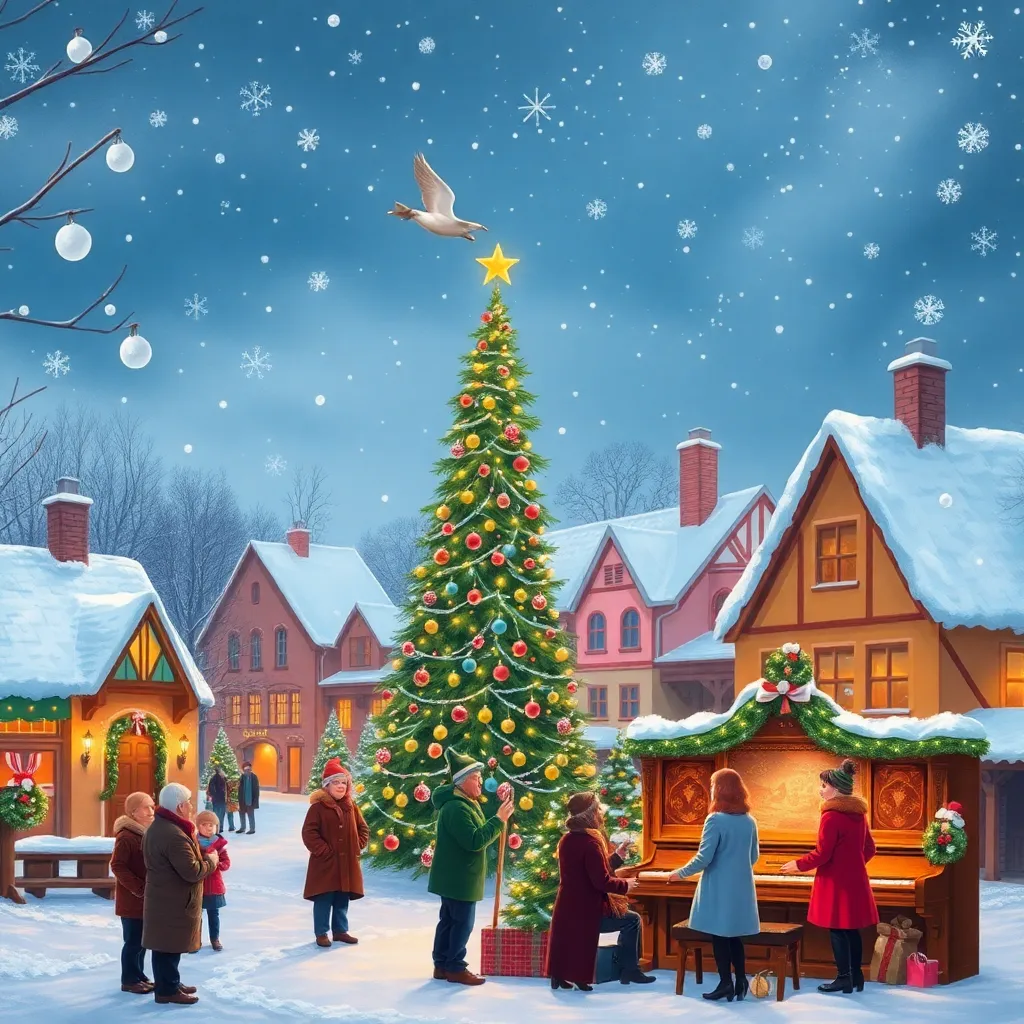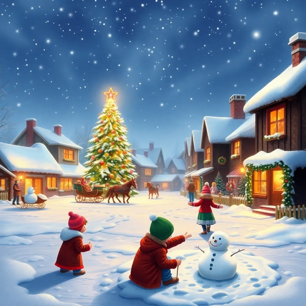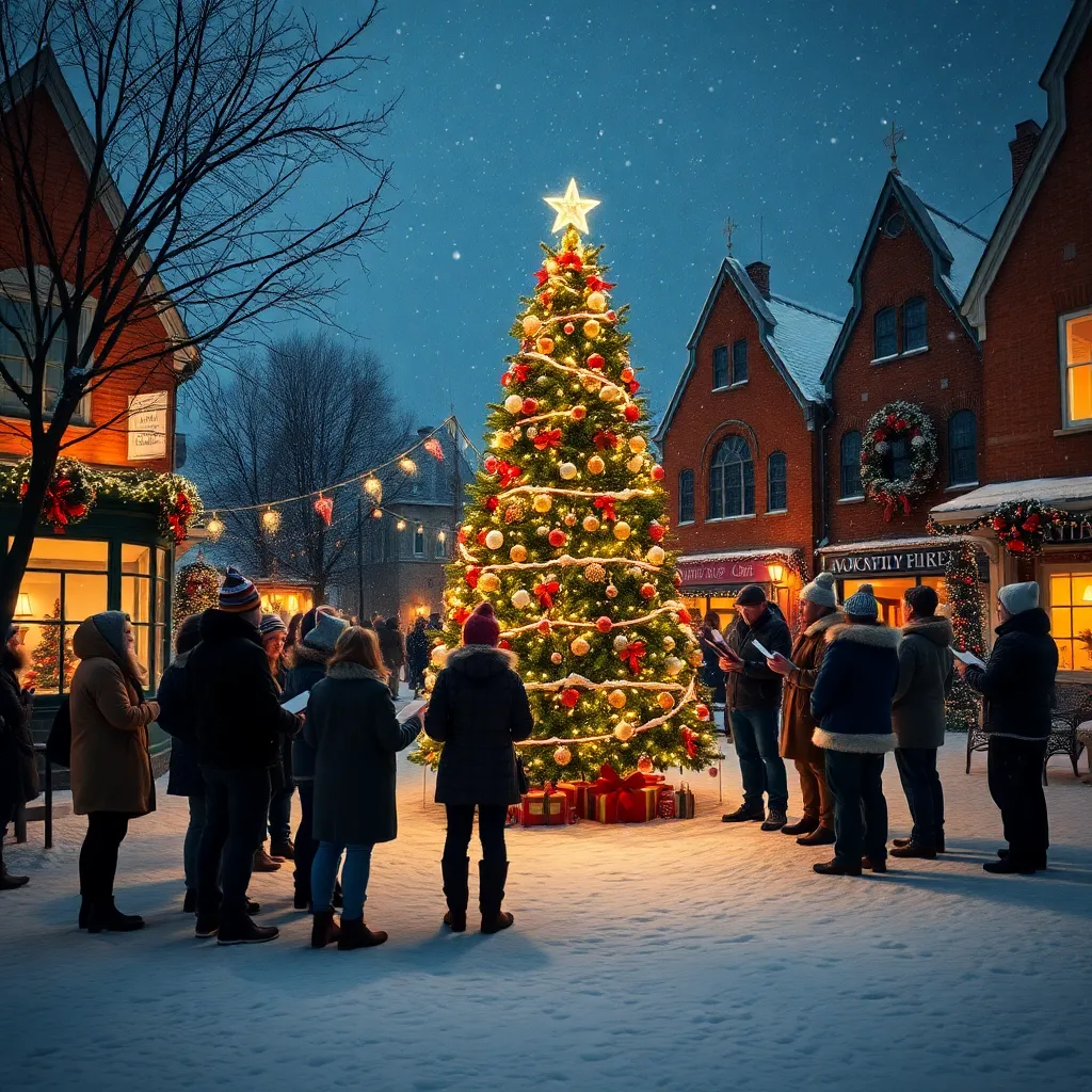 A snowy winter evening in a quaint town square, surrounded by twinkling lights and festive decorations. A group of carolers gather around a beautifully decorated Christmas tree, their warm breath visible in the cold air. The scent of hot chocolate and freshly baked cookies wafts through the crisp winter air.