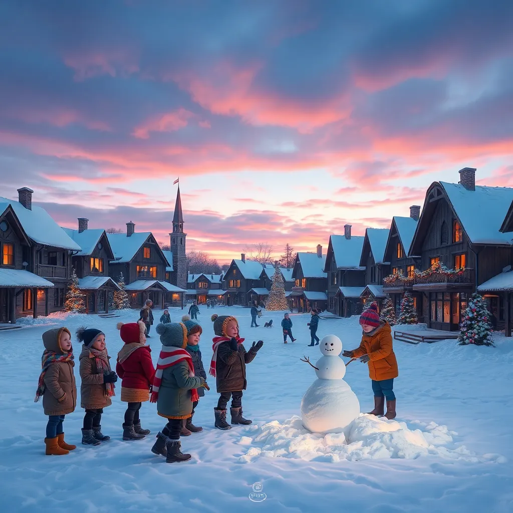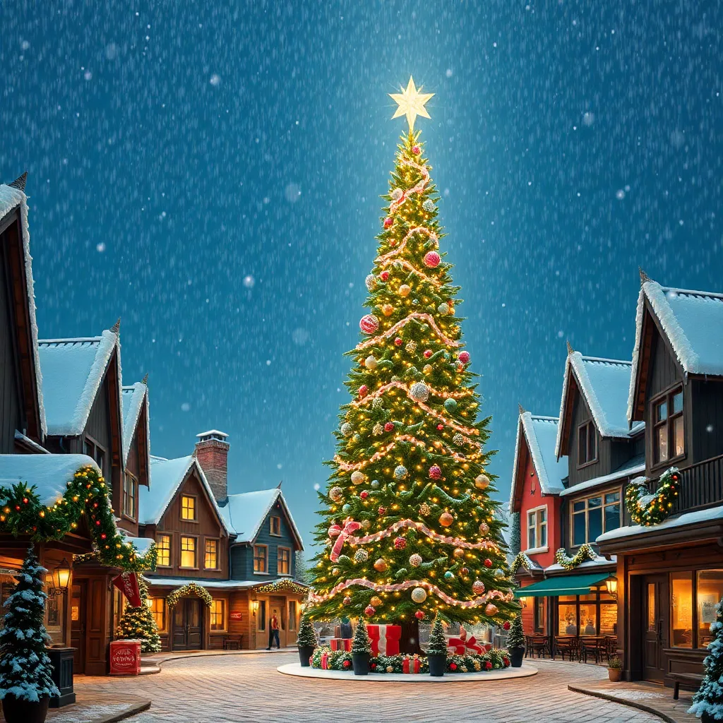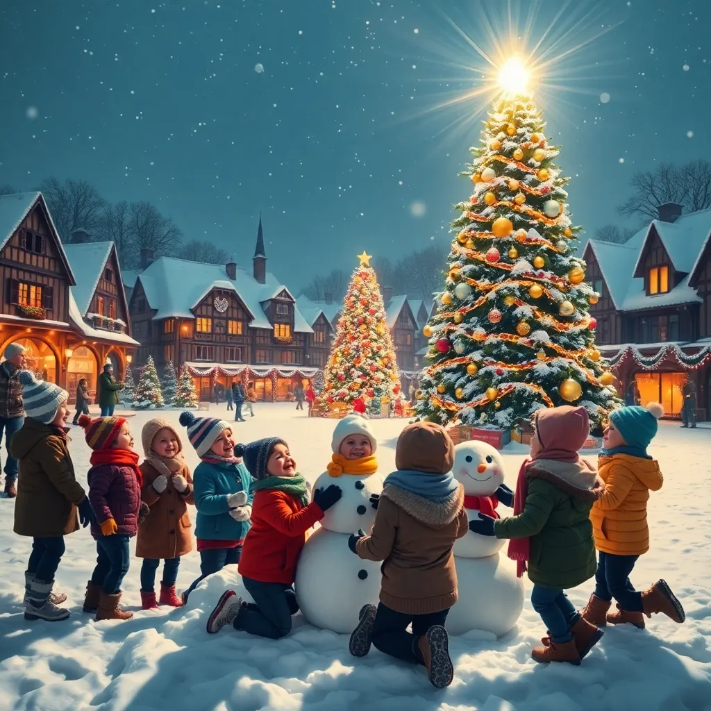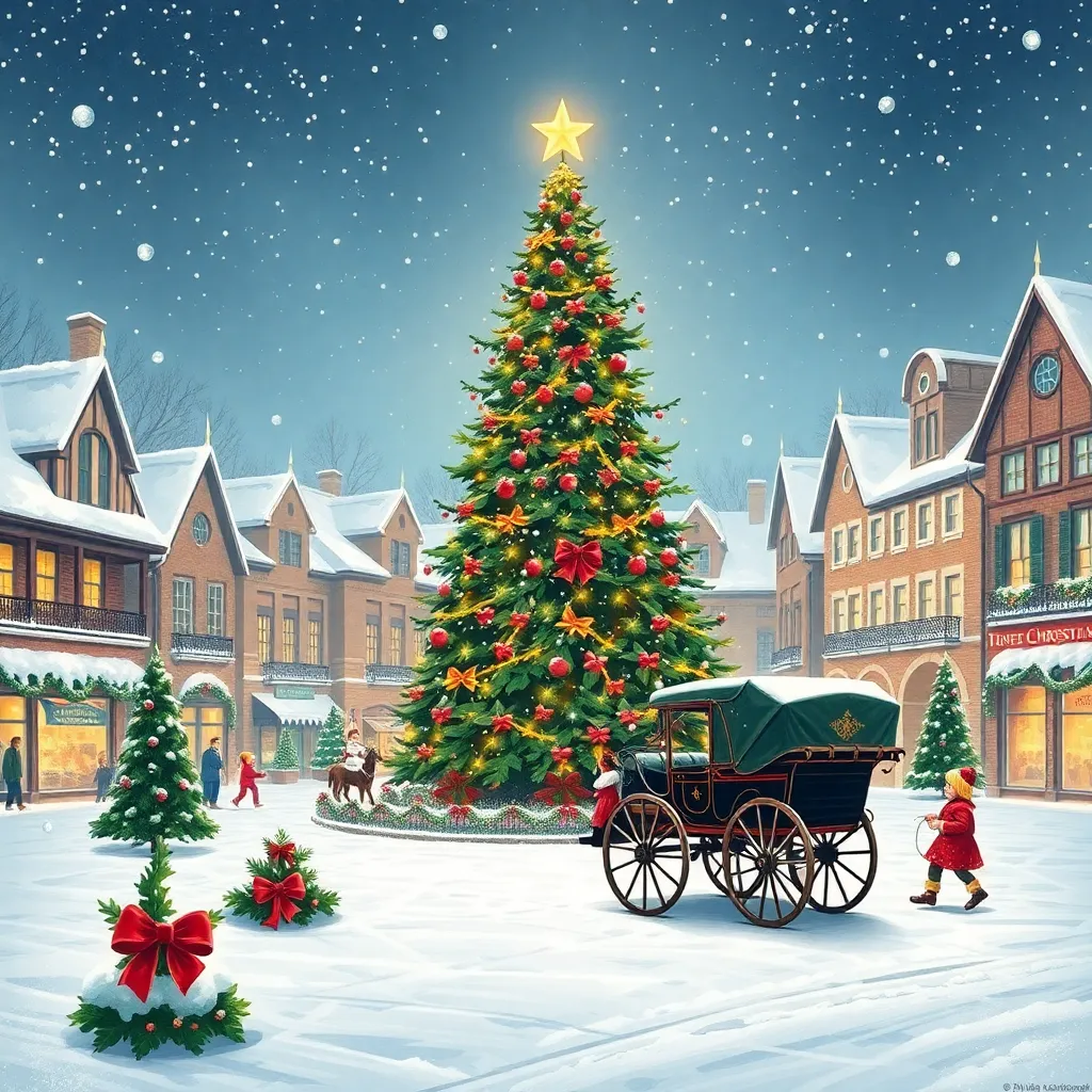 A snowy winter evening in a quaint town square, surrounded by twinkling lights and festive decorations. A group of carolers gather around a beautifully decorated Christmas tree, their warm breath visible in the cold air. The scent of hot chocolate and freshly baked cookies wafts through the crisp winter air.