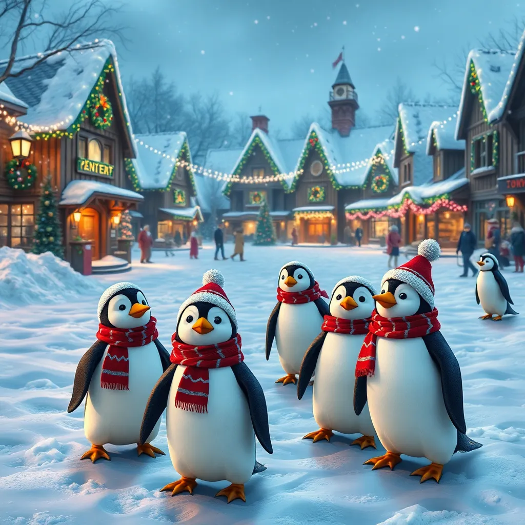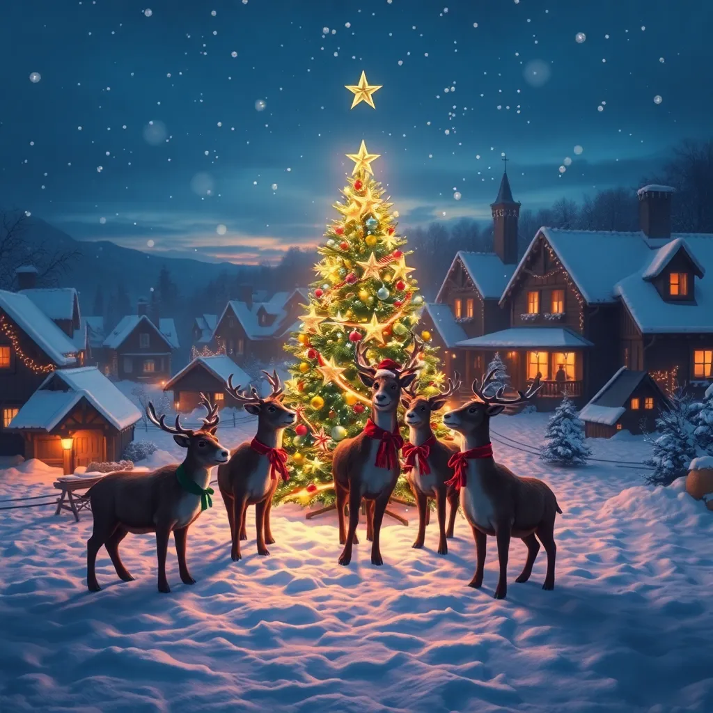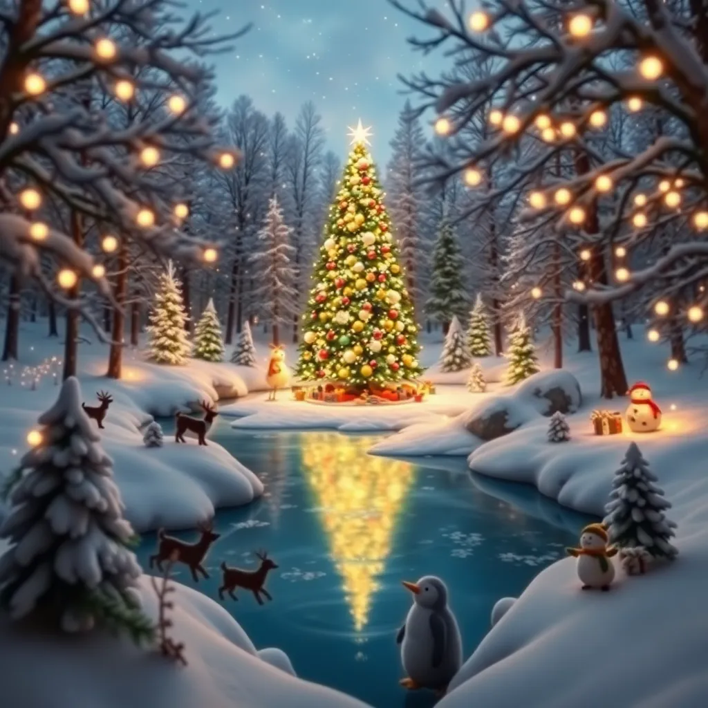 Create a whimsical winter wonderland scene for Christmas. Imagine a snow-covered forest with twinkling fairy lights, a frozen lake, and a majestic Christmas tree in the center. Add a few festive creatures like reindeer, penguins, and snowmen, and a hint of magic in the air. Make it sparkle and shine!