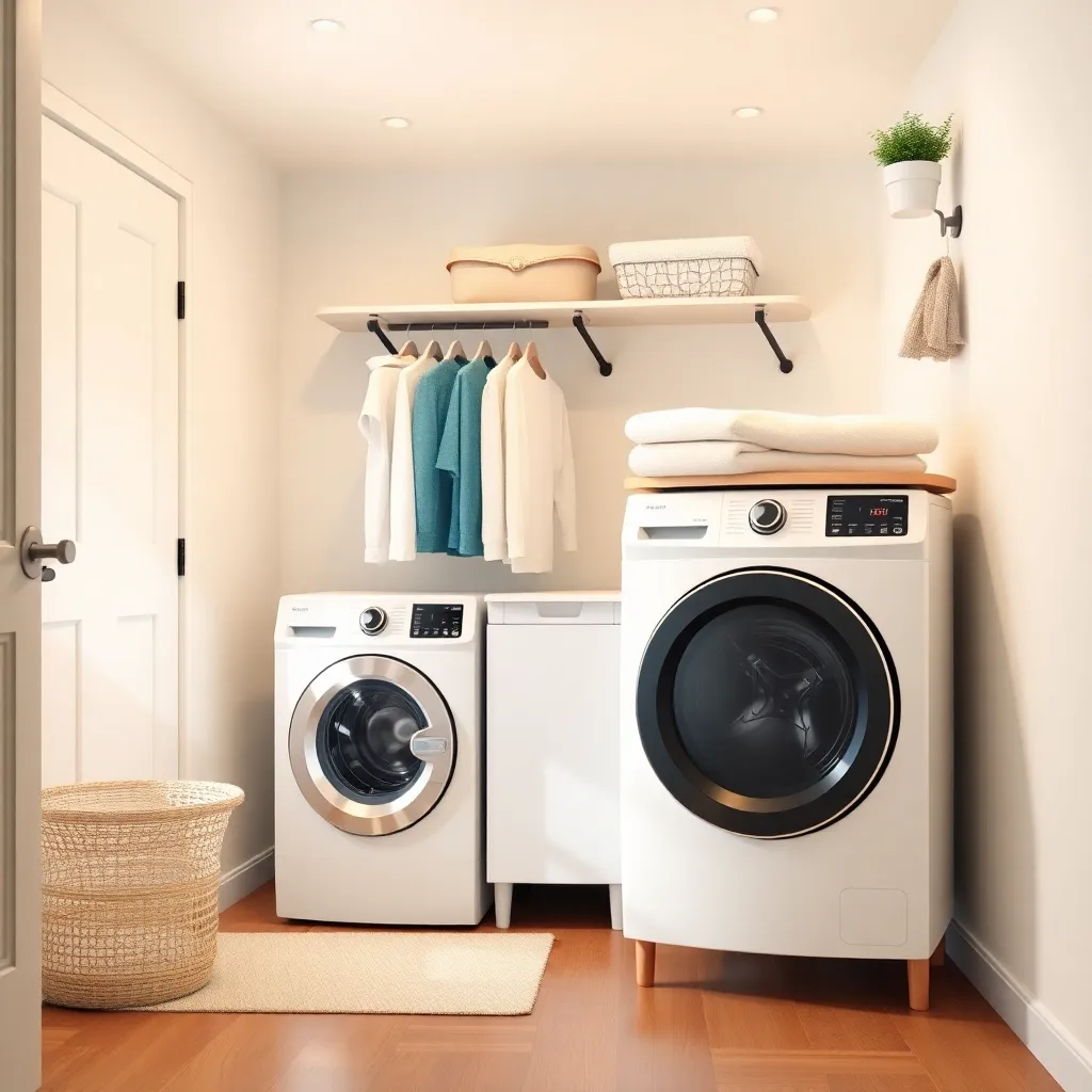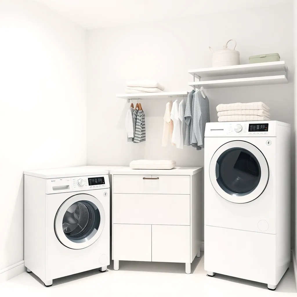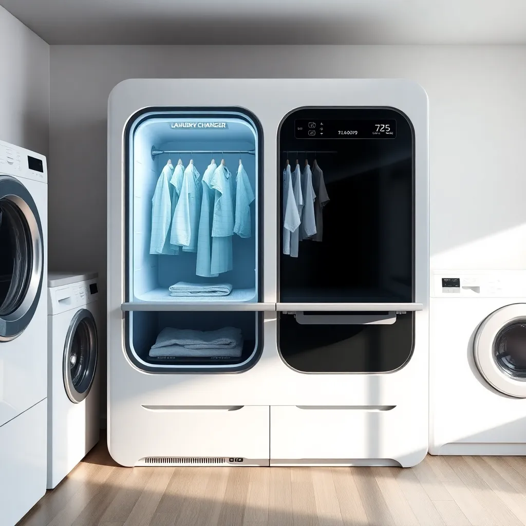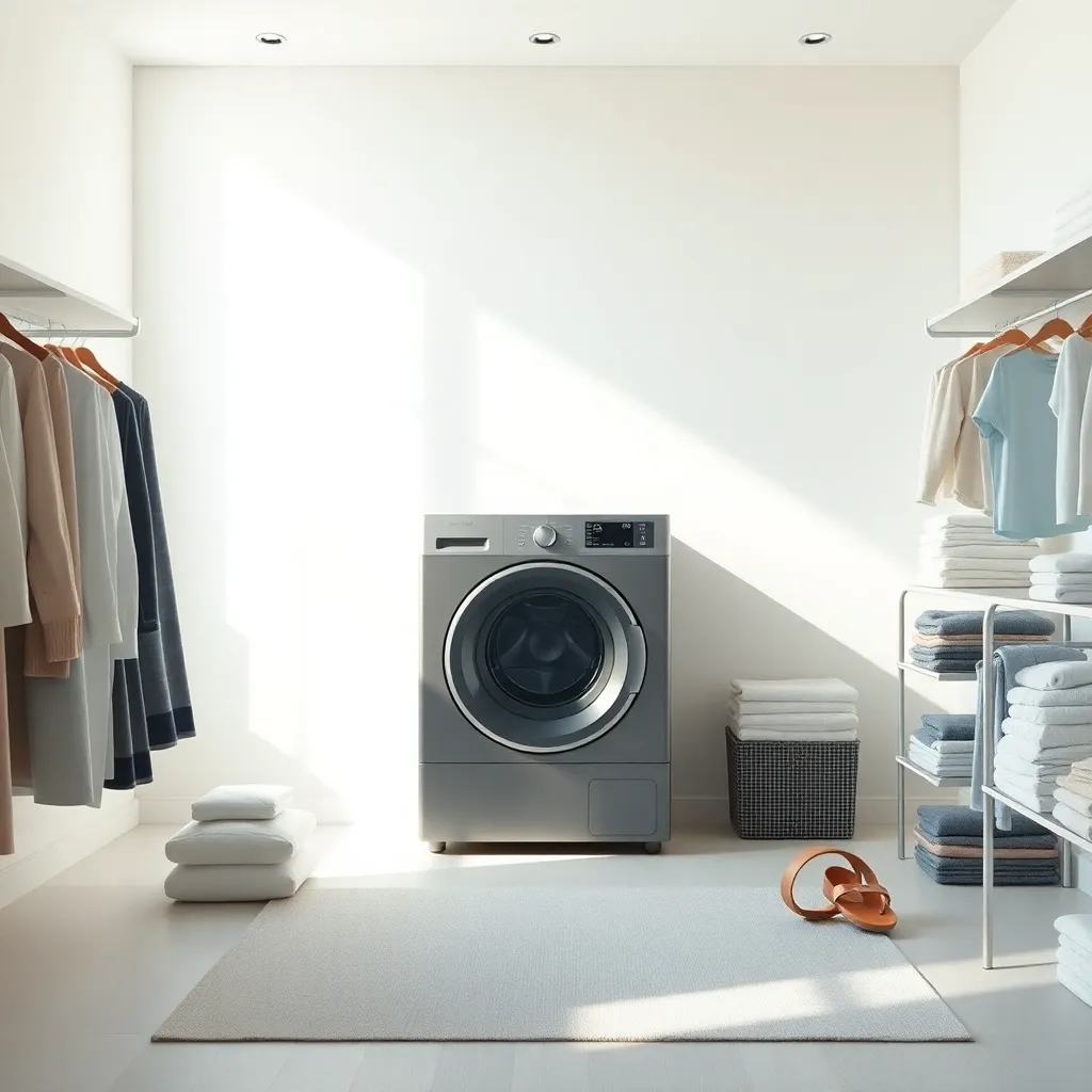 Create an image of a modern, minimalist laundry room with a sleek clothes changer in the center, surrounded by clean and folded clothes. Incorporate soft, natural lighting and a calming color scheme to evoke a sense of serenity and organization. The clothes changer should be the focal point of the scene.