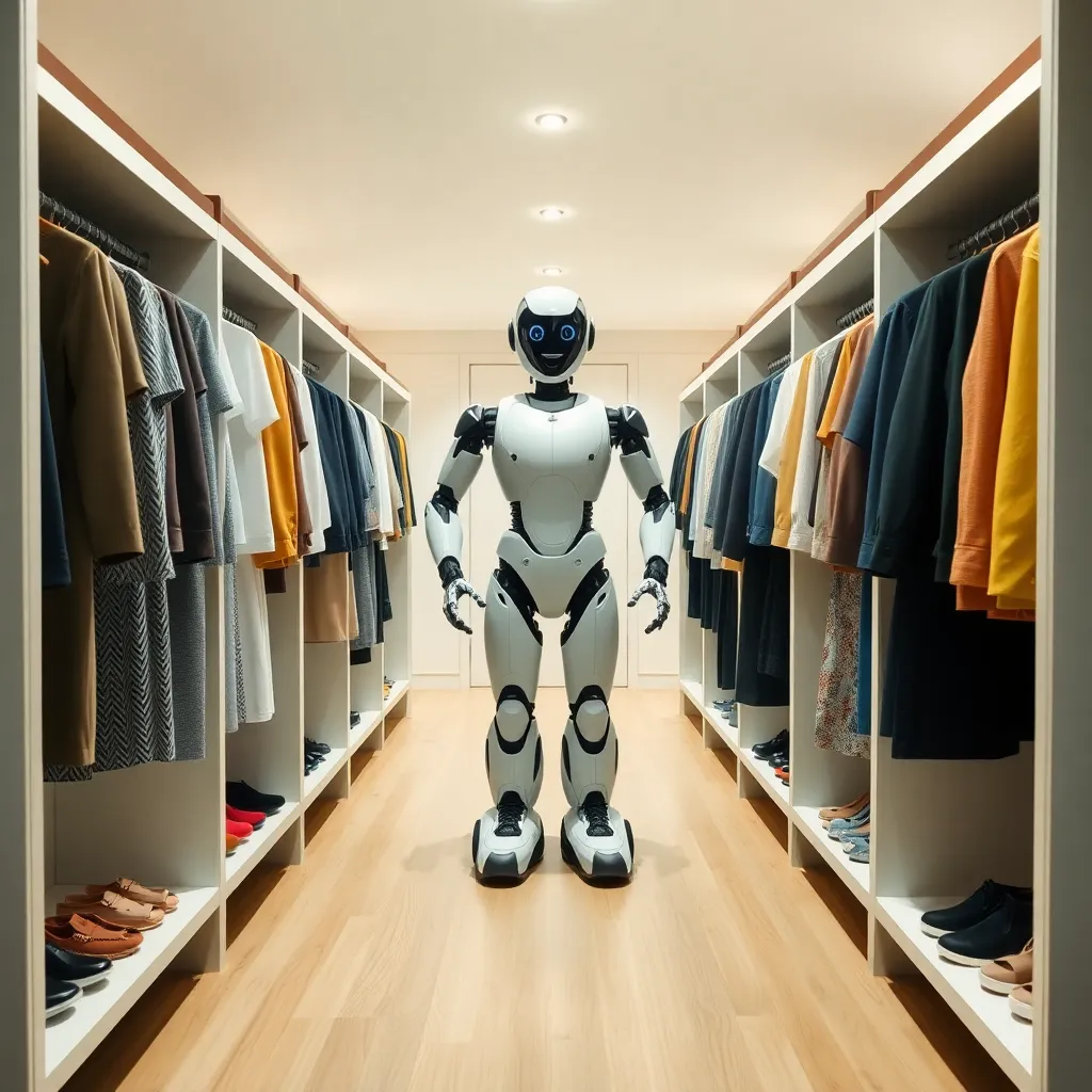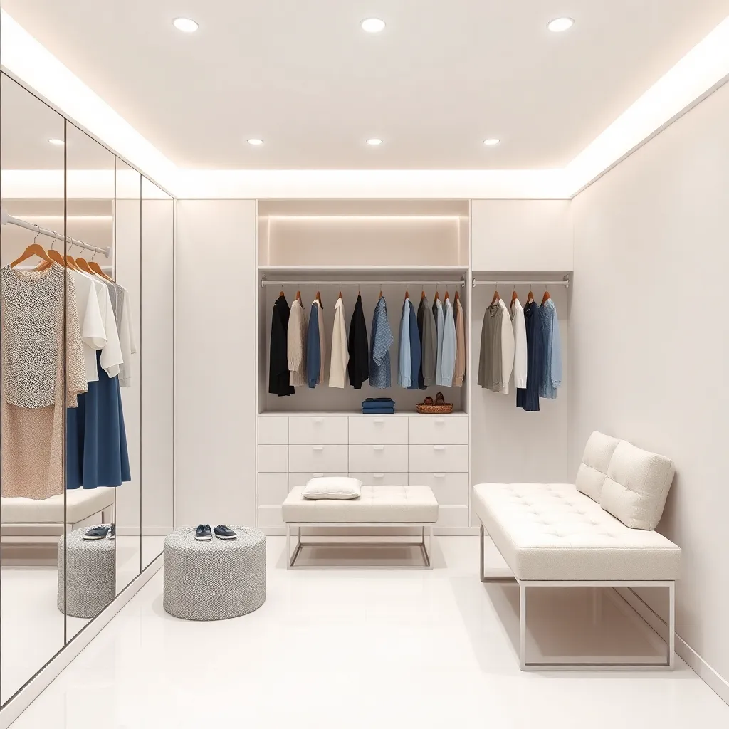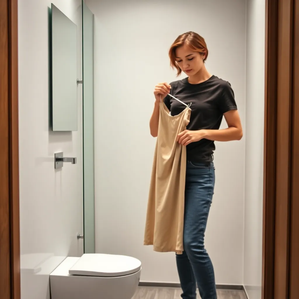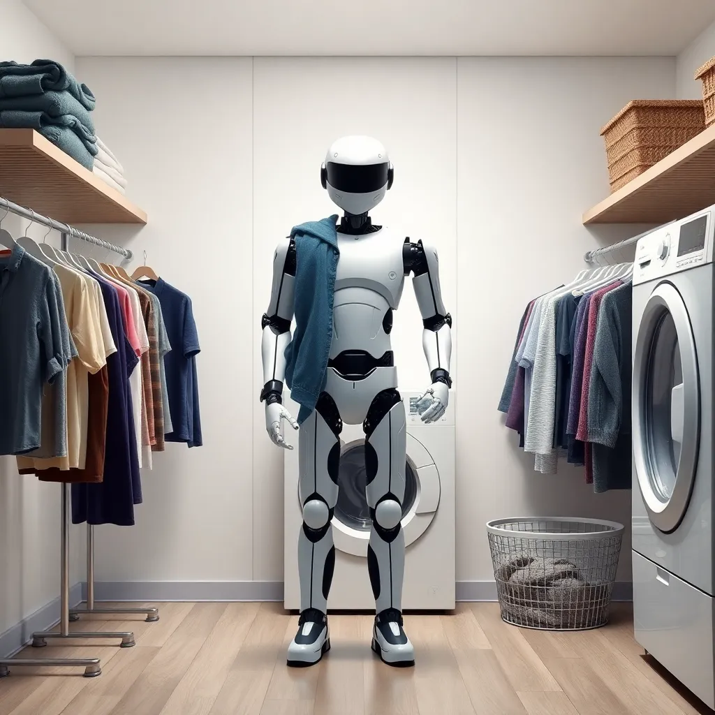 Create an image of a modern, minimalist laundry room with a sleek clothes changer in the center, surrounded by clean and folded clothes. Incorporate soft, natural lighting and a calming color scheme to evoke a sense of serenity and organization. The clothes changer should be the focal point of the scene.