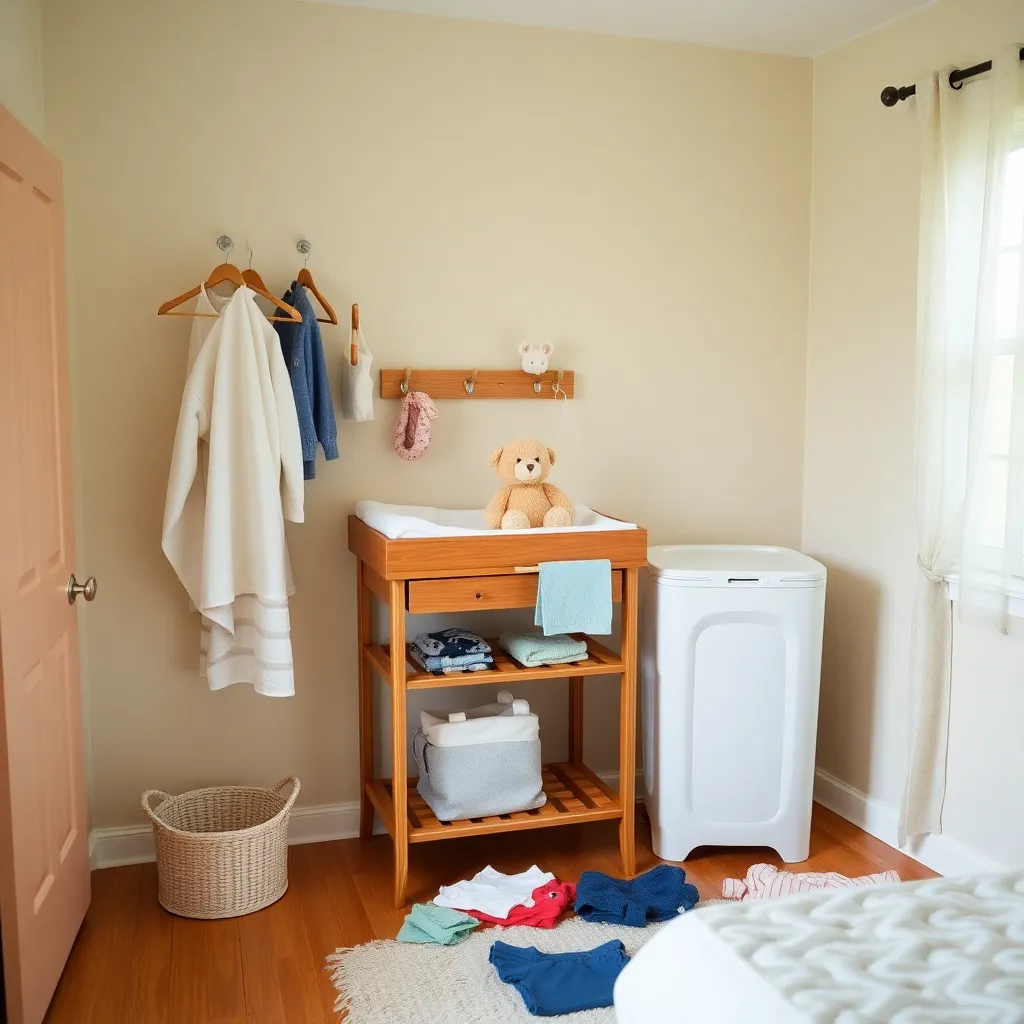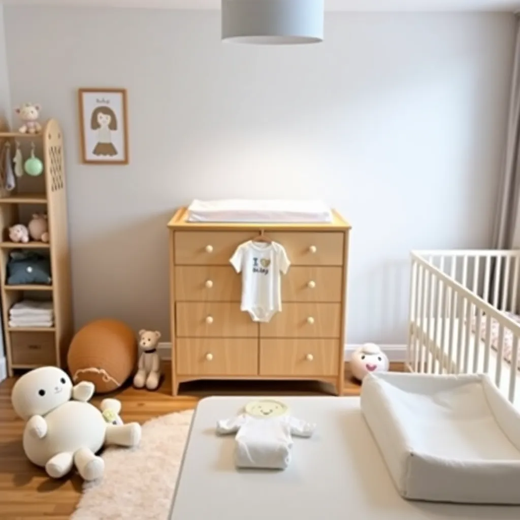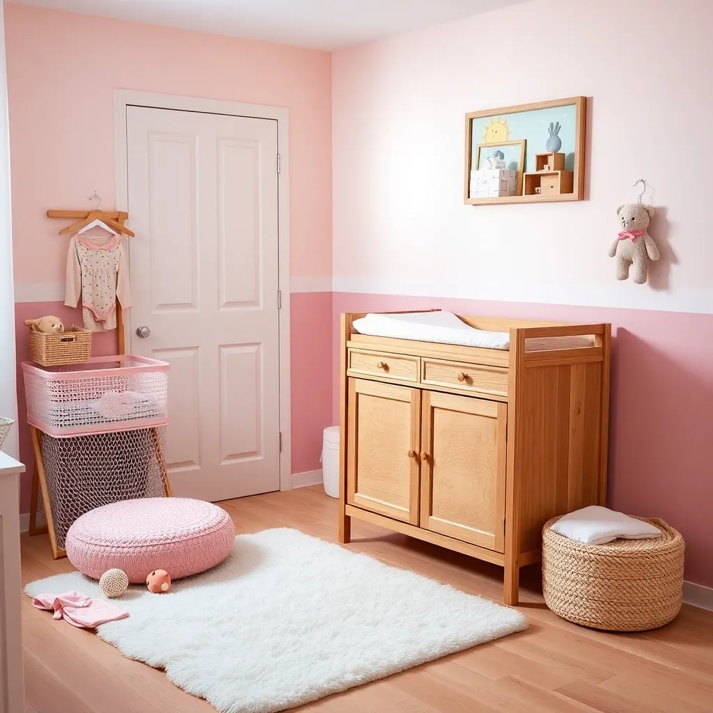 Create an image of a cozy nursery with a clothes changer station, featuring a soft pink and white color scheme, a sturdy wooden changing table with storage, a plush rug, and a few adorable baby clothes and toys scattered around. Incorporate a warm and inviting lighting effect to create a soothing atmosphere.