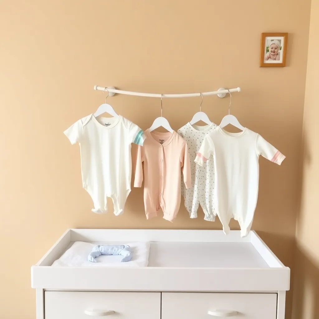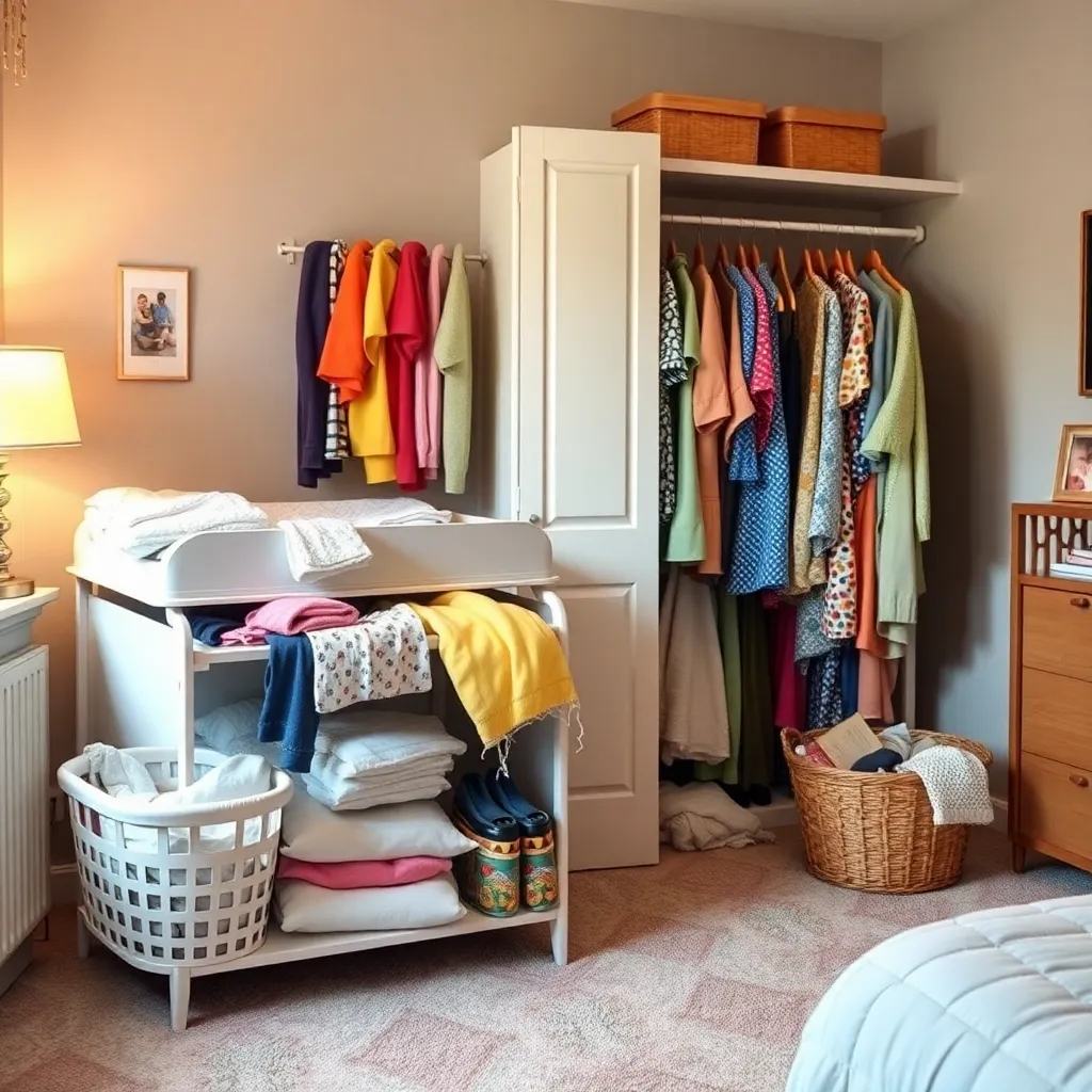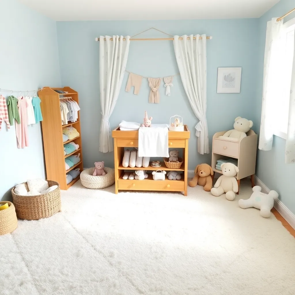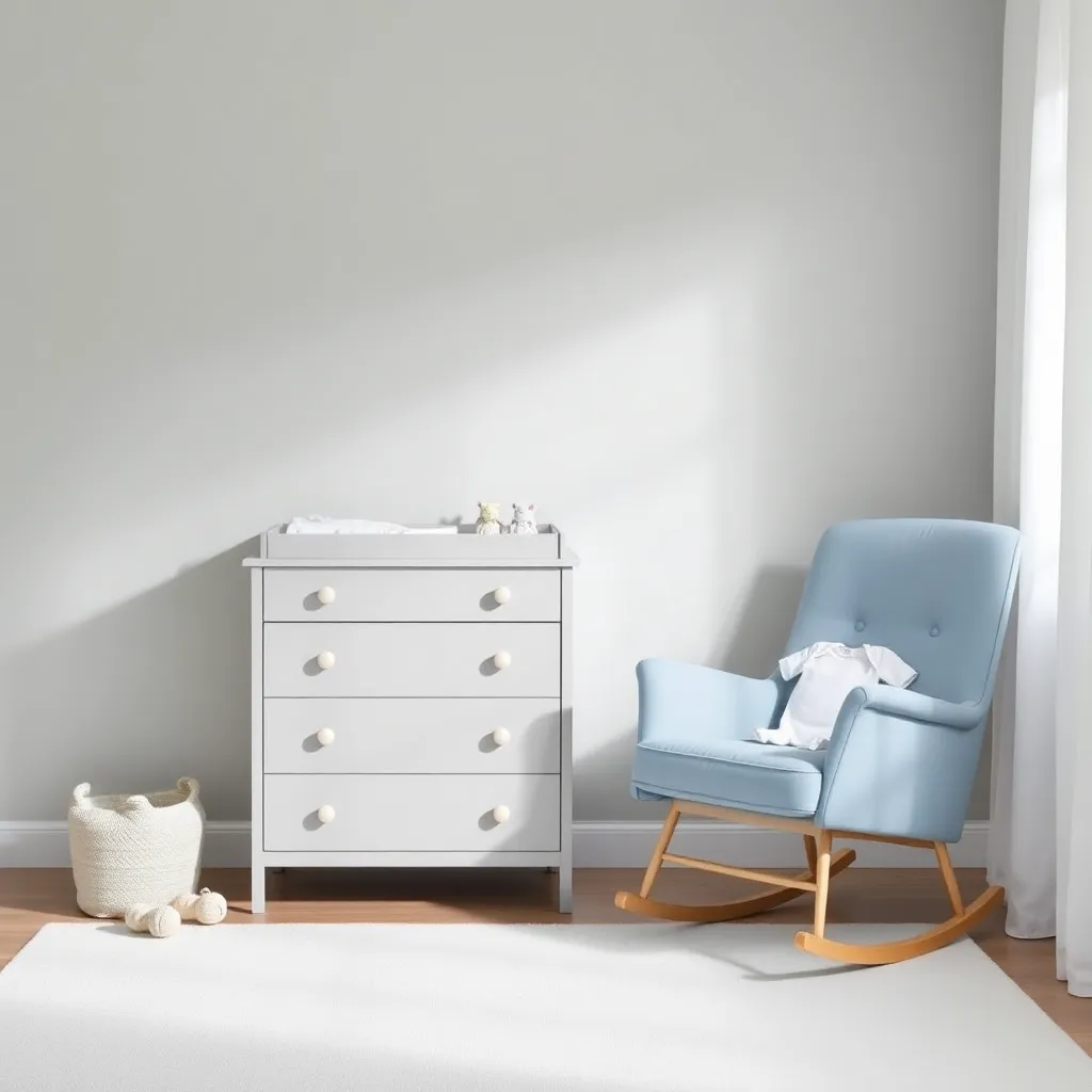 Create an image of a cozy nursery with a clothes changer station, featuring a soft pink and white color scheme, a sturdy wooden changing table with storage, a plush rug, and a few adorable baby clothes and toys scattered around. Incorporate a warm and inviting lighting effect to create a soothing atmosphere.