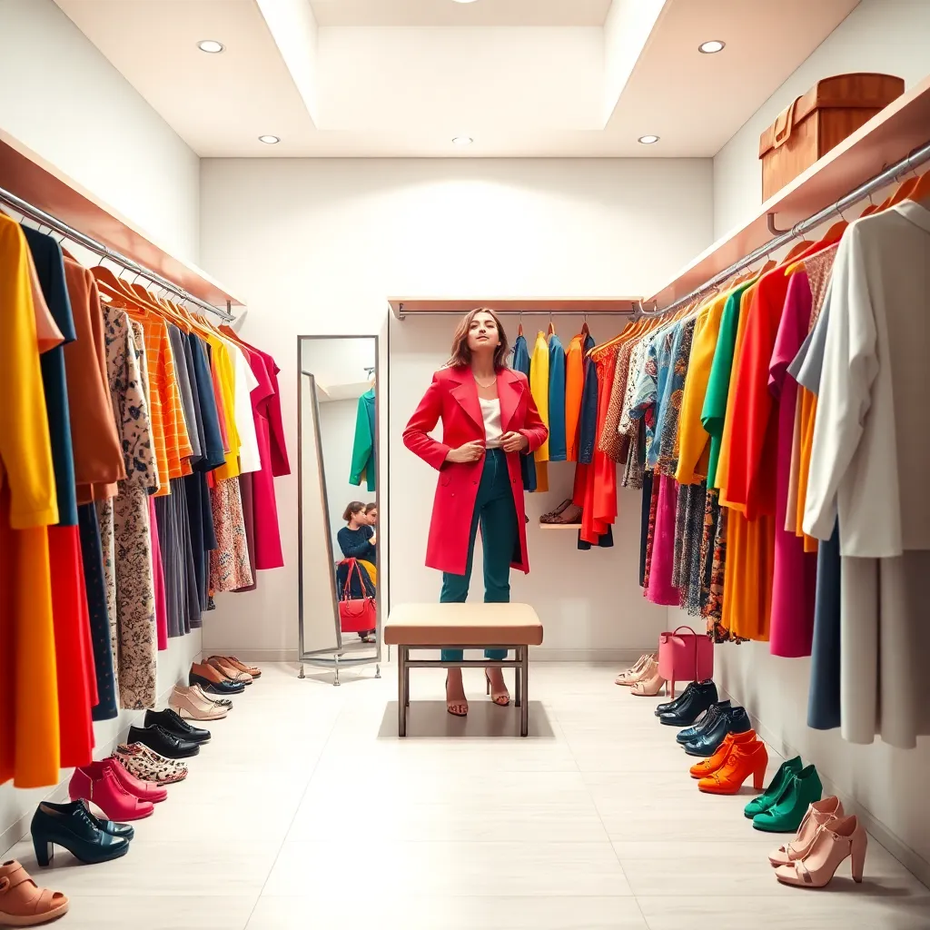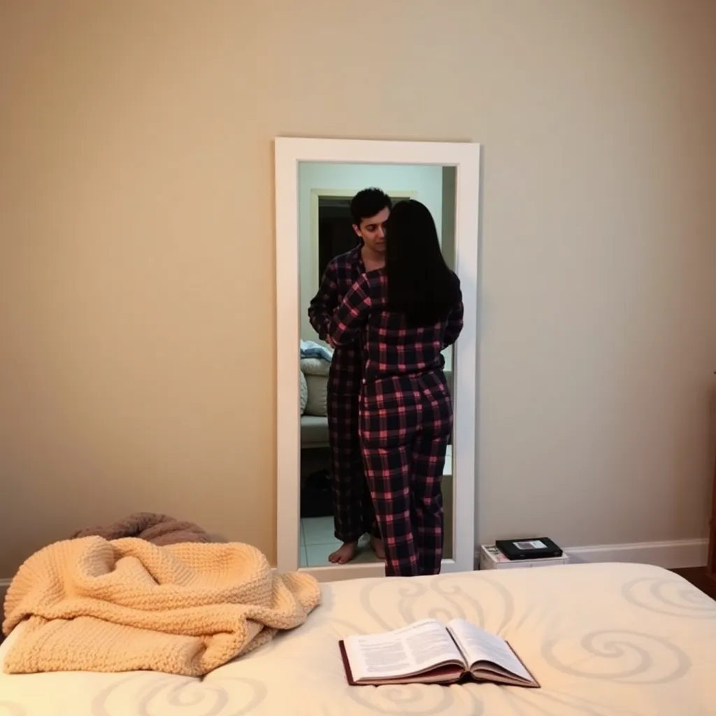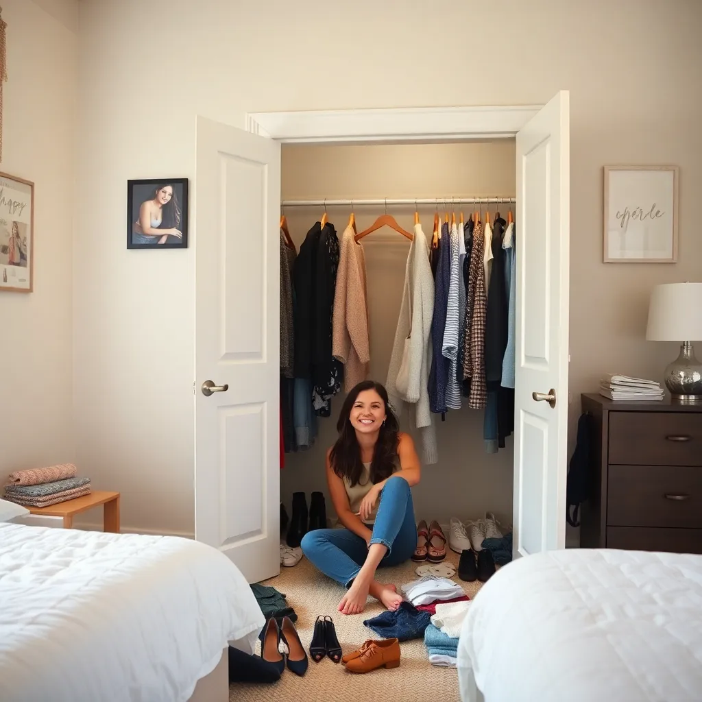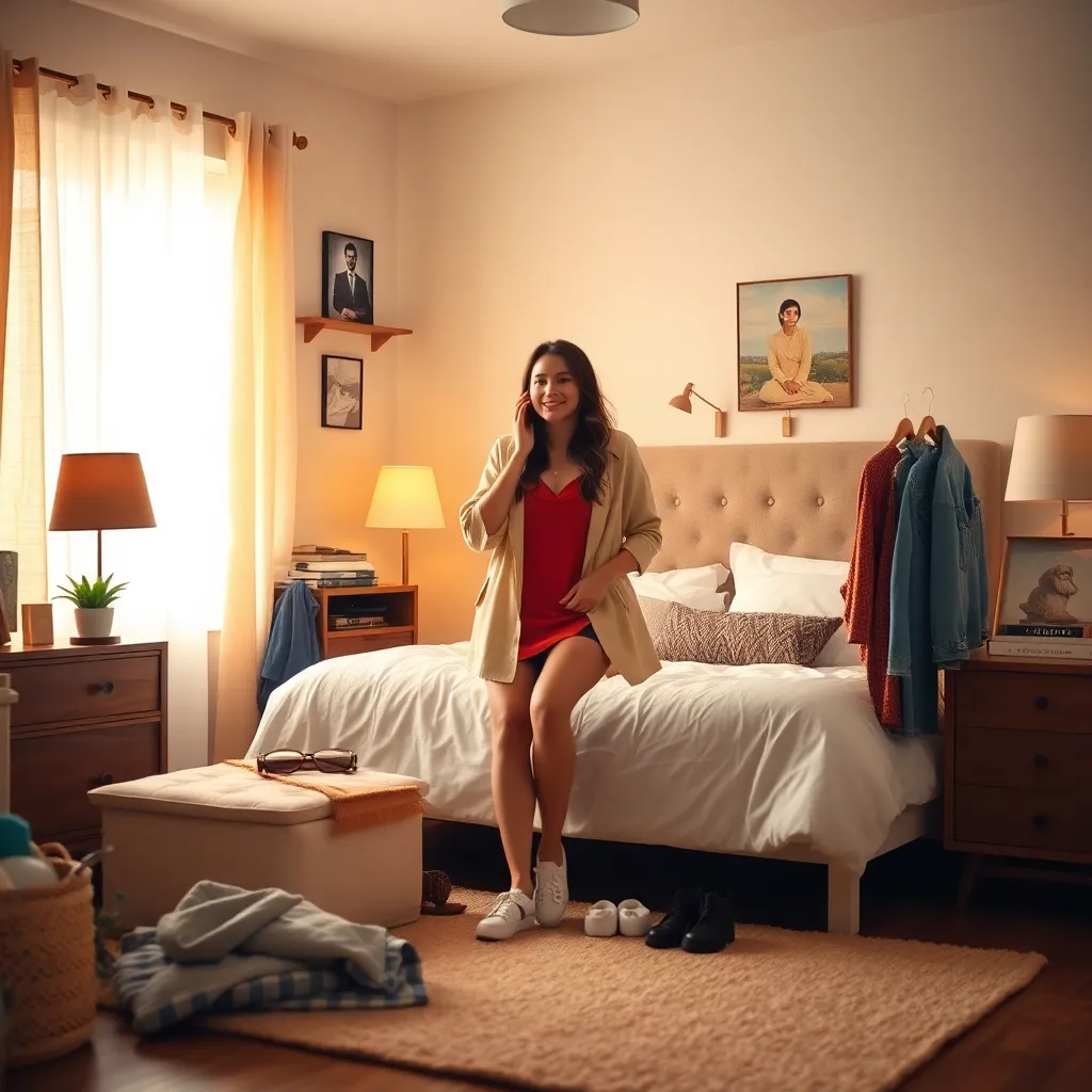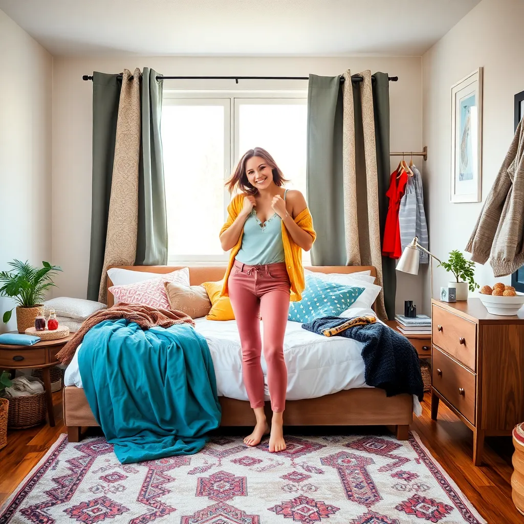 Capture the moment of a person effortlessly changing into their favorite outfit in a cozy bedroom. Incorporate a mix of textures, colors, and fabrics, such as soft blankets, vibrant clothing, and a comfortable rug. The scene should evoke feelings of relaxation and joy, as if the person is getting ready for a fun adventure.