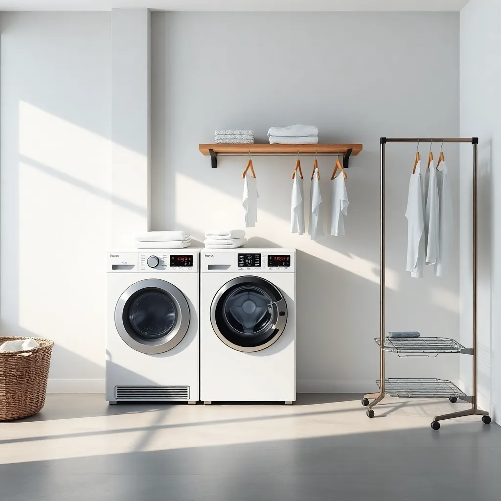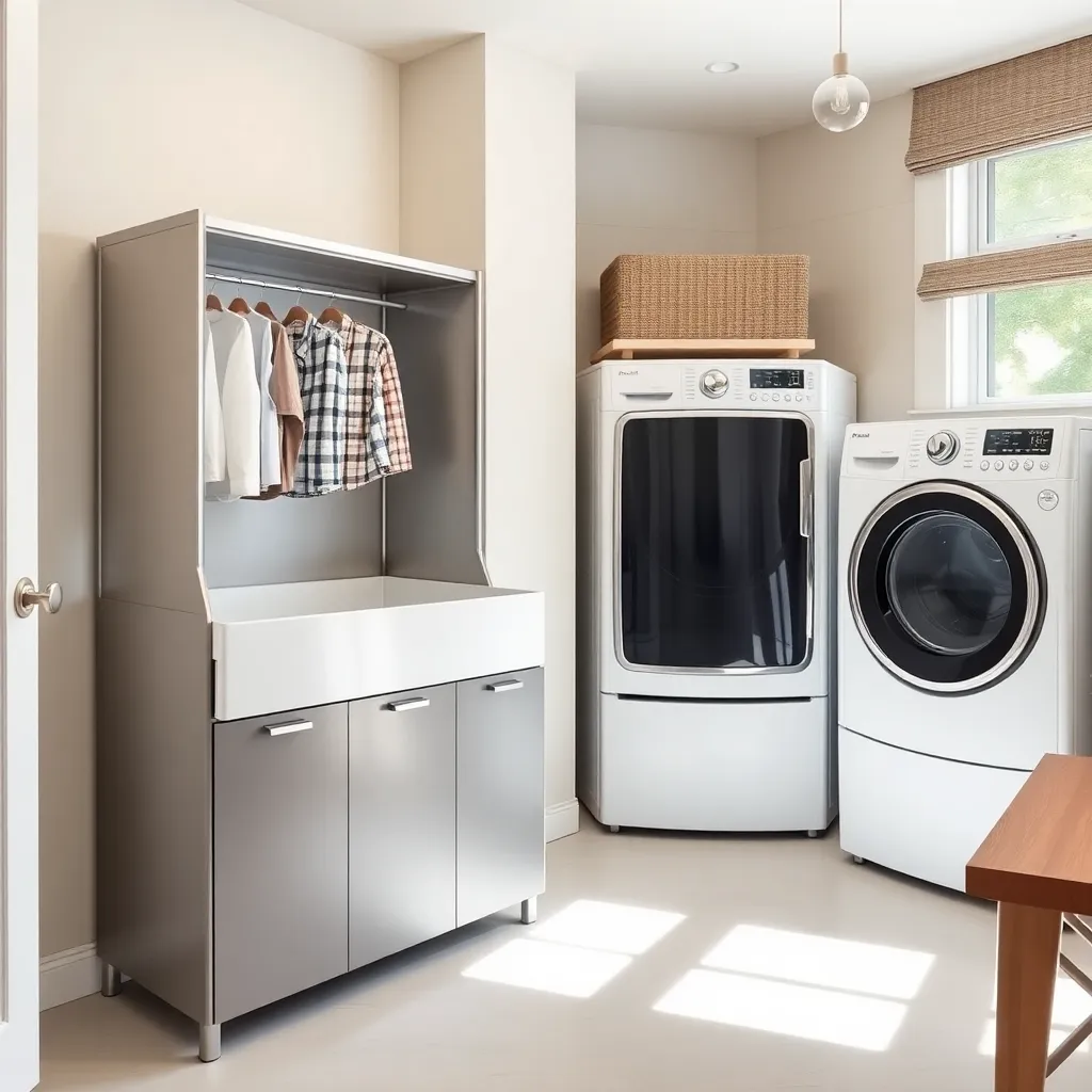 Create an AI image of a modern laundry room with a sleek clothes changer, a smart washing machine, and a drying rack. The clothes changer should be equipped with advanced features like automatic folding and steaming. The room should have a minimalist design with a mix of industrial and natural elements.