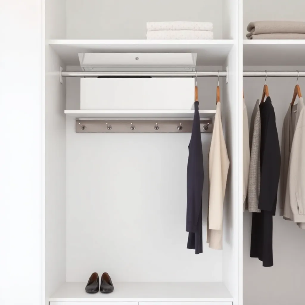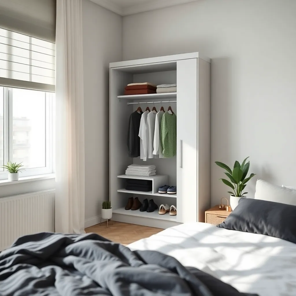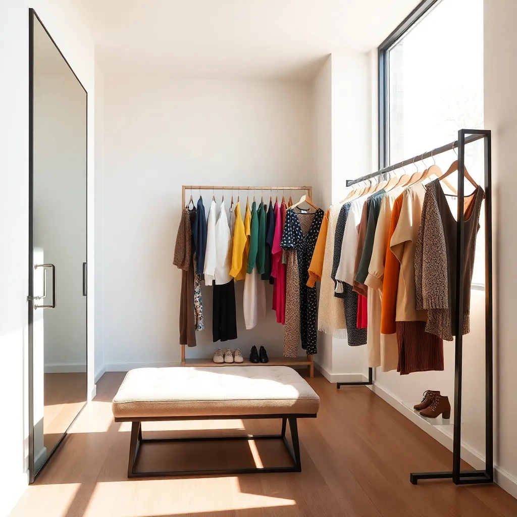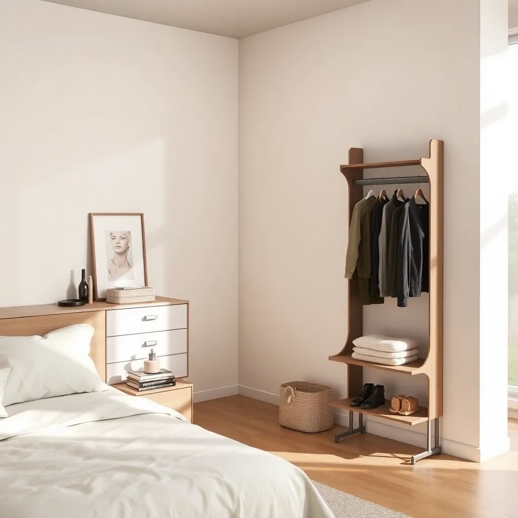 Create an image of a modern, minimalist bedroom with a comfortable-looking bed, a dresser, and a clothes changer. The clothes changer is a sleek, wall-mounted unit with multiple hooks and a shelf. The room is lit by soft, natural light and has a calming color palette. Incorporate a few clothes and accessories to add texture and interest.