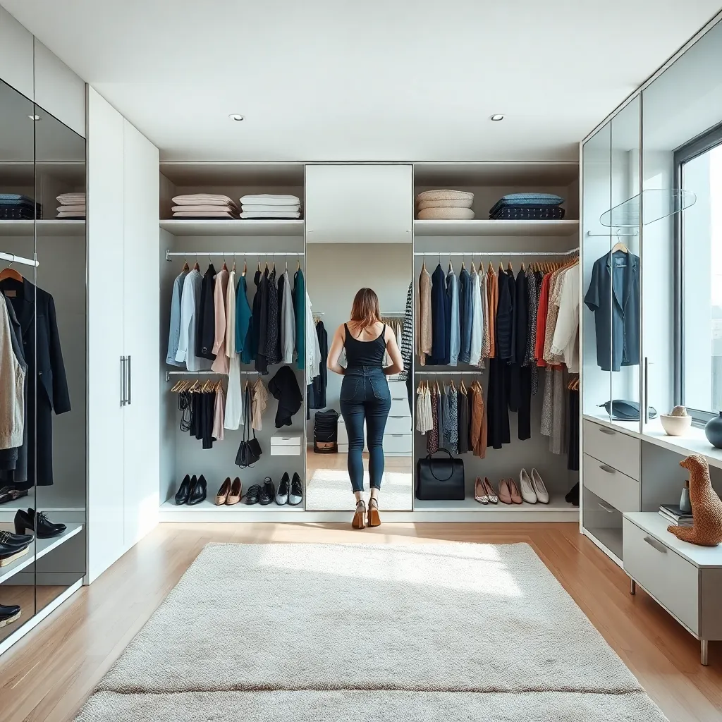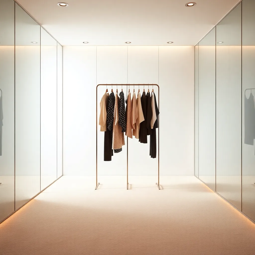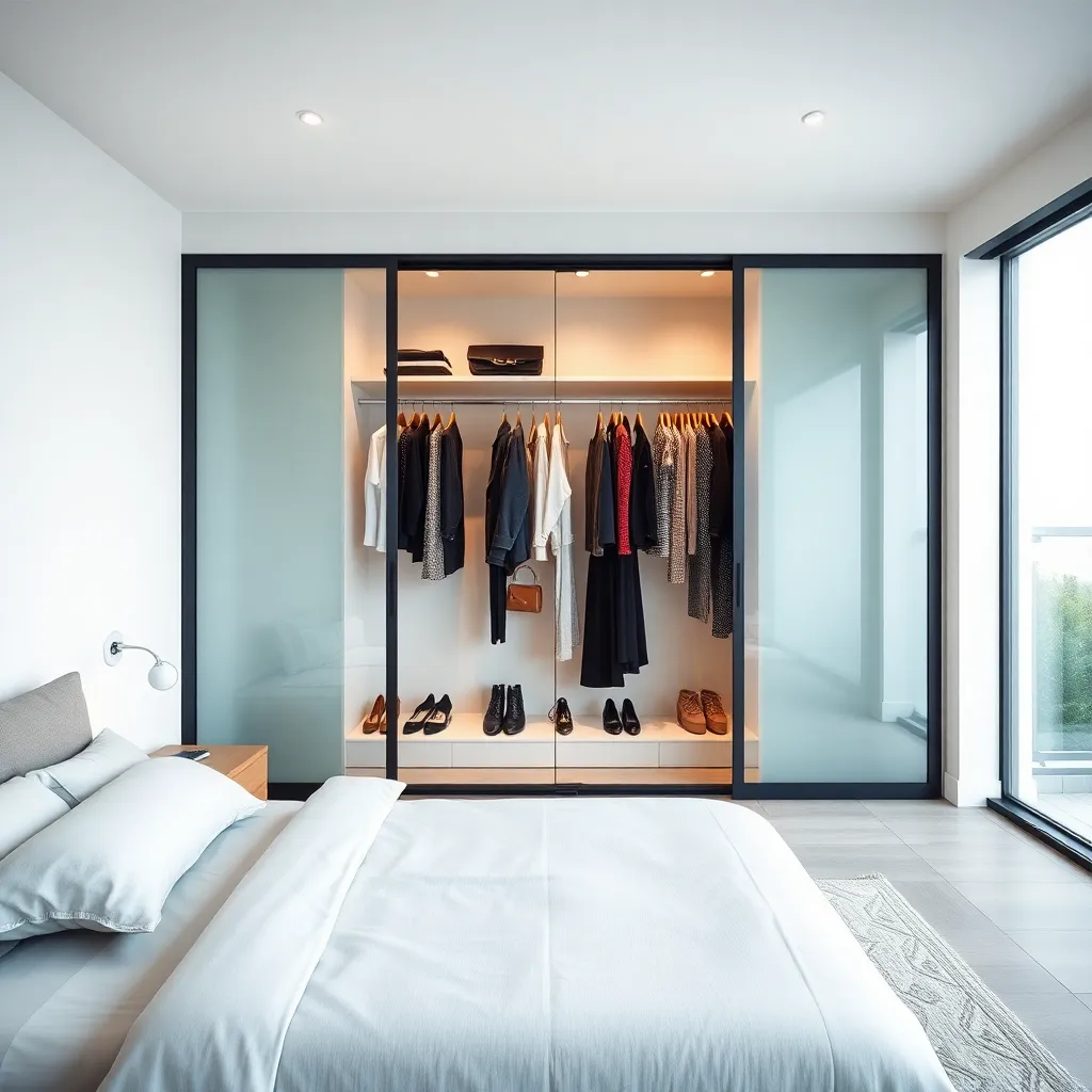 Generate an image of a modern, minimalist bedroom with a comfortable-looking bed and a large, floor-to-ceiling closet with sliding glass doors. Inside the closet, display a variety of stylish outfits and accessories, with a few pieces hung on a clothes rack. The overall atmosphere is calm, serene, and inviting.