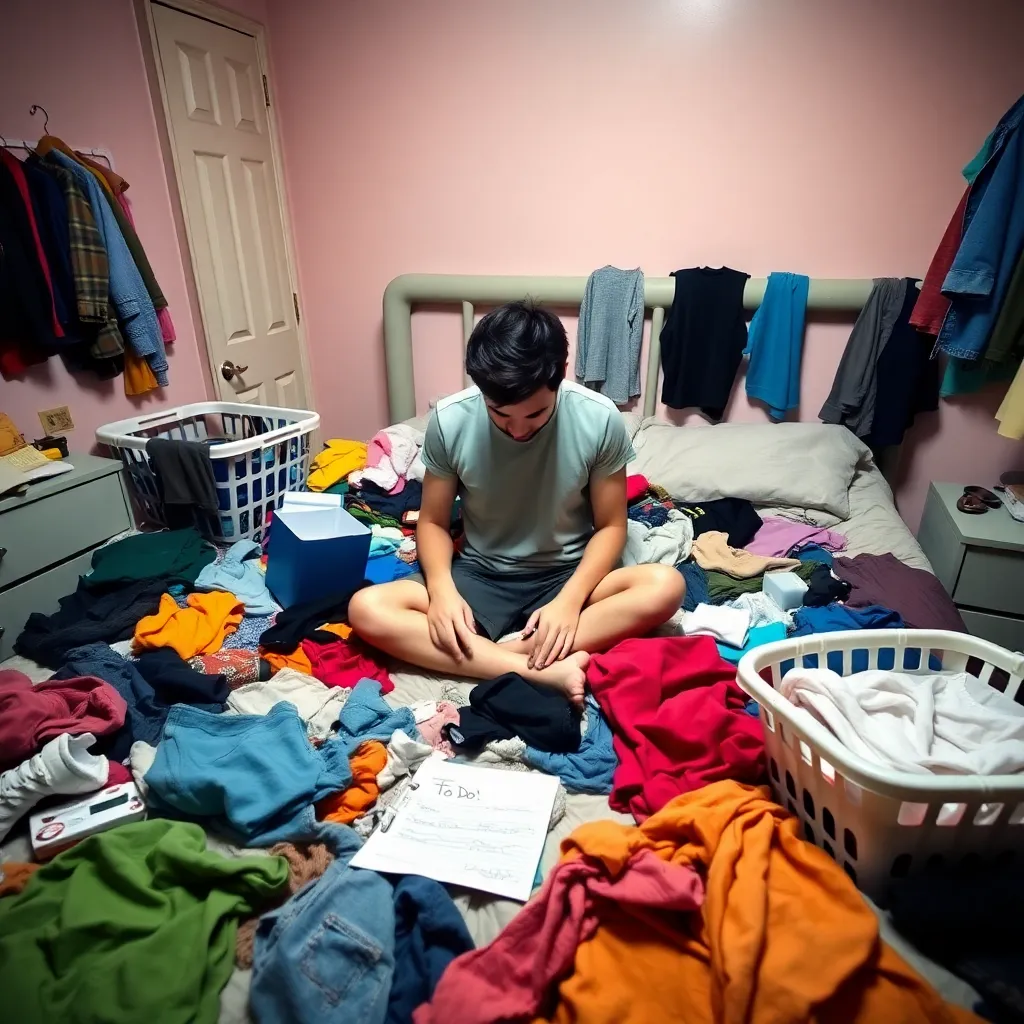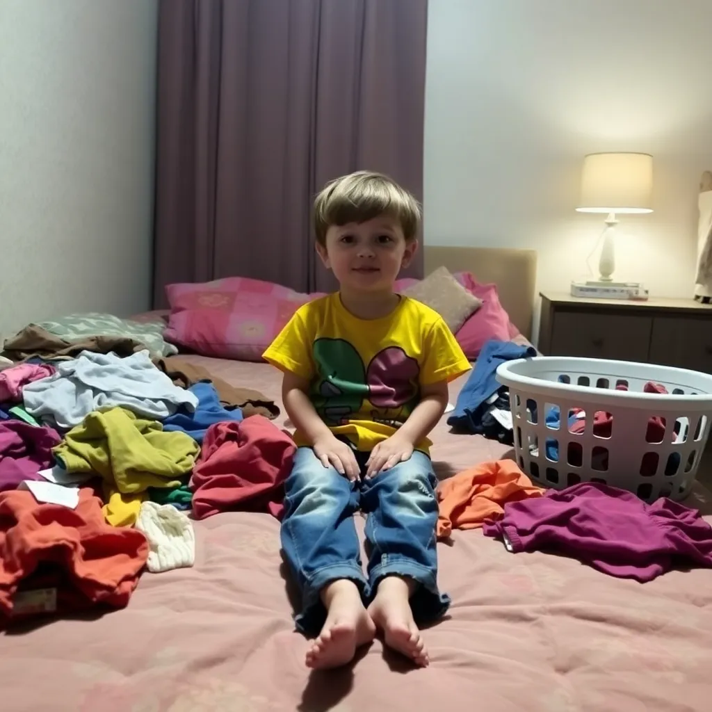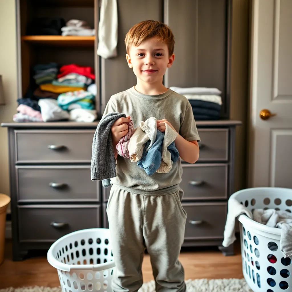 A young boy, around 8 years old, standing in front of a dresser in a cozy bedroom. He is wearing a worn-out t-shirt and sweatpants, holding a handful of fresh clothes. The dresser is filled with neatly folded clothes, and a laundry basket is sitting on the floor. The room has a warm and inviting atmosphere.