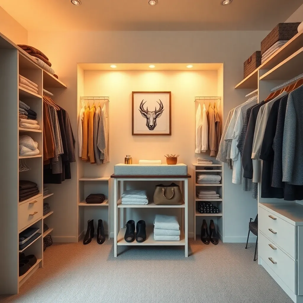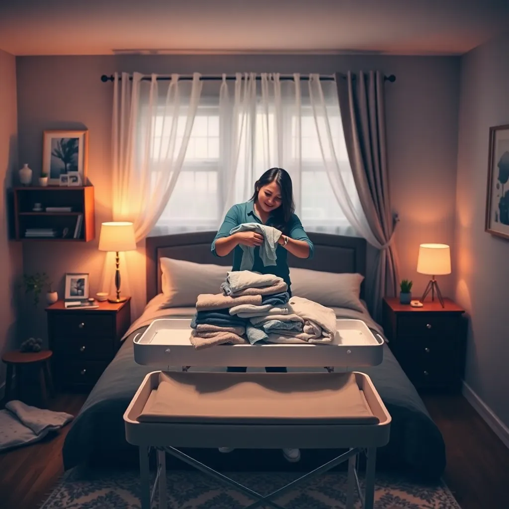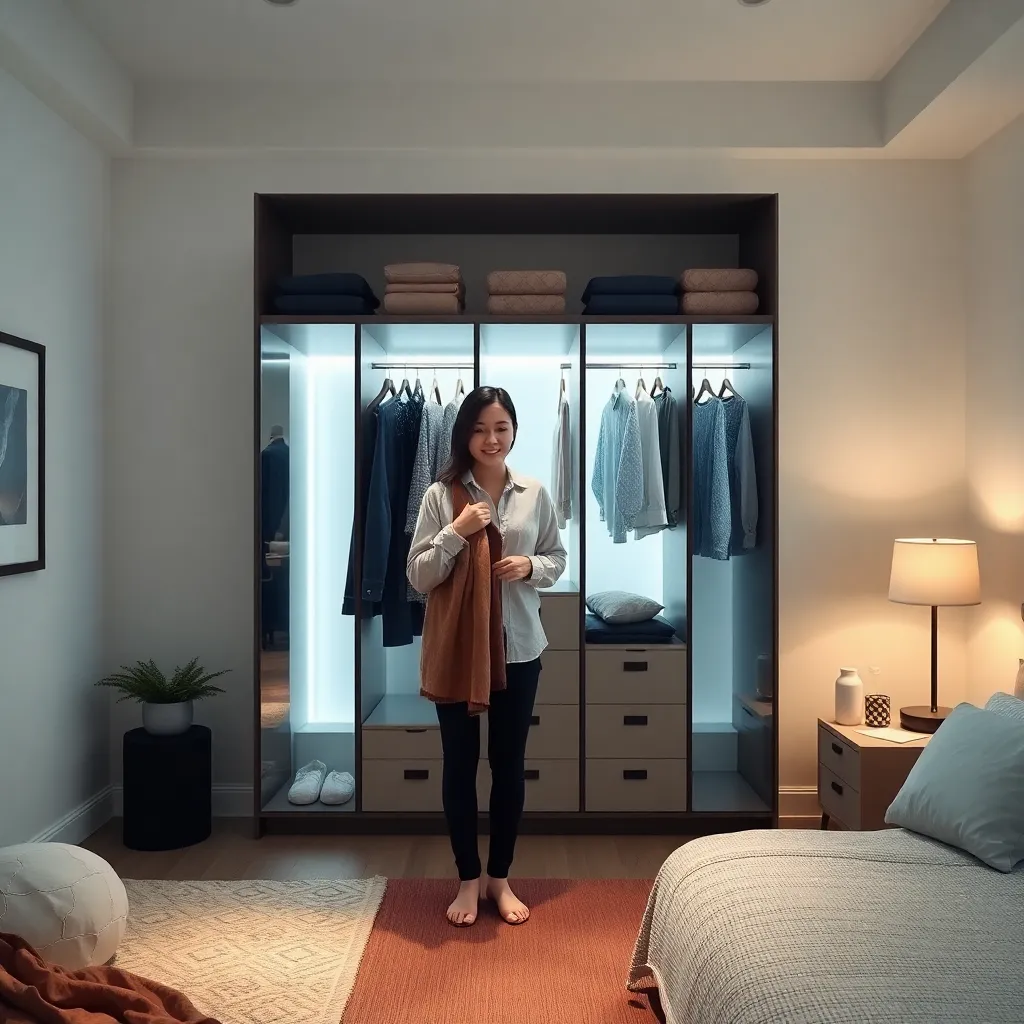 Create an image of a cozy bedroom with a clothes changer in the center. The changer is a sleek, modern design with multiple compartments and a soft, glowing light. A person is standing in front of it, holding a few clothes and looking relaxed. The room is decorated with calming colors and soft textiles.