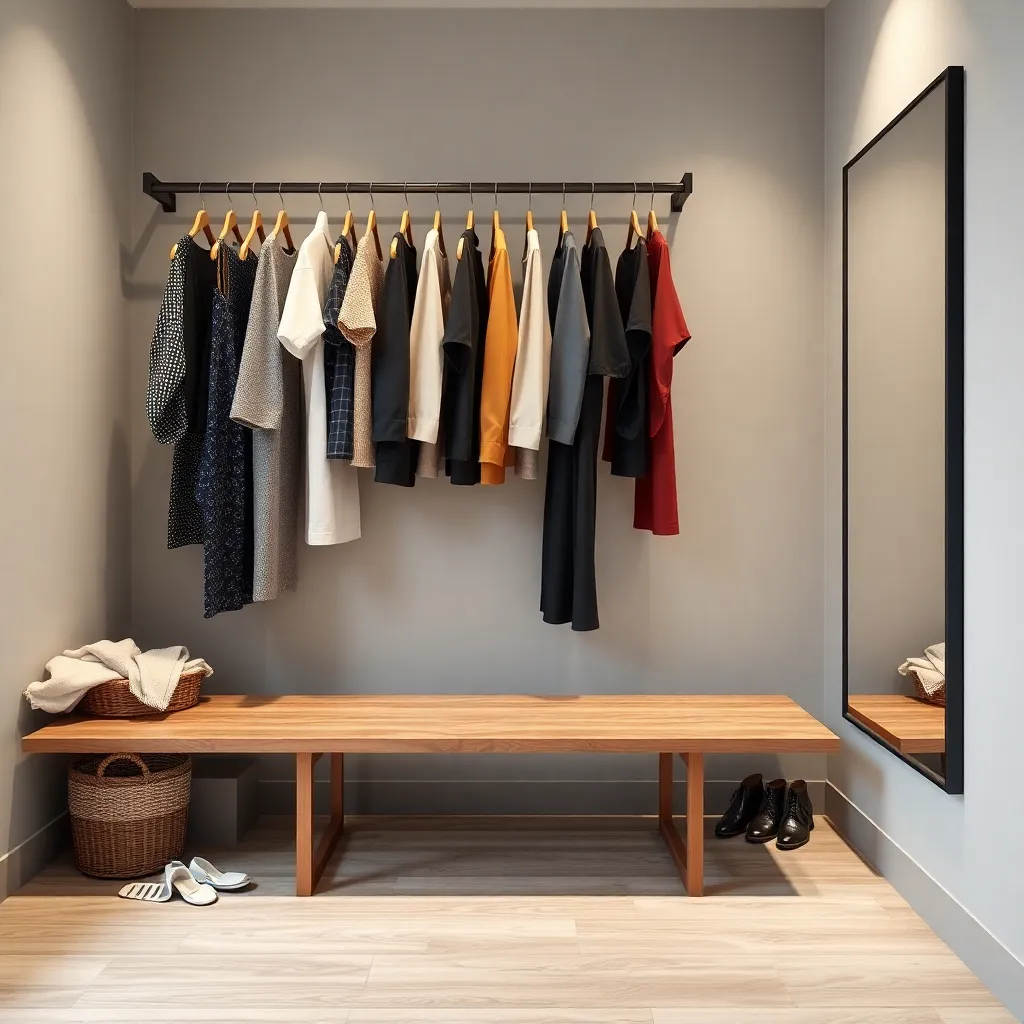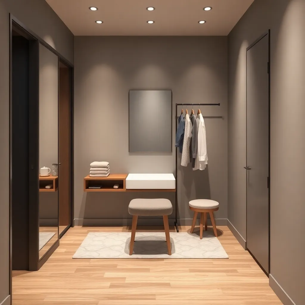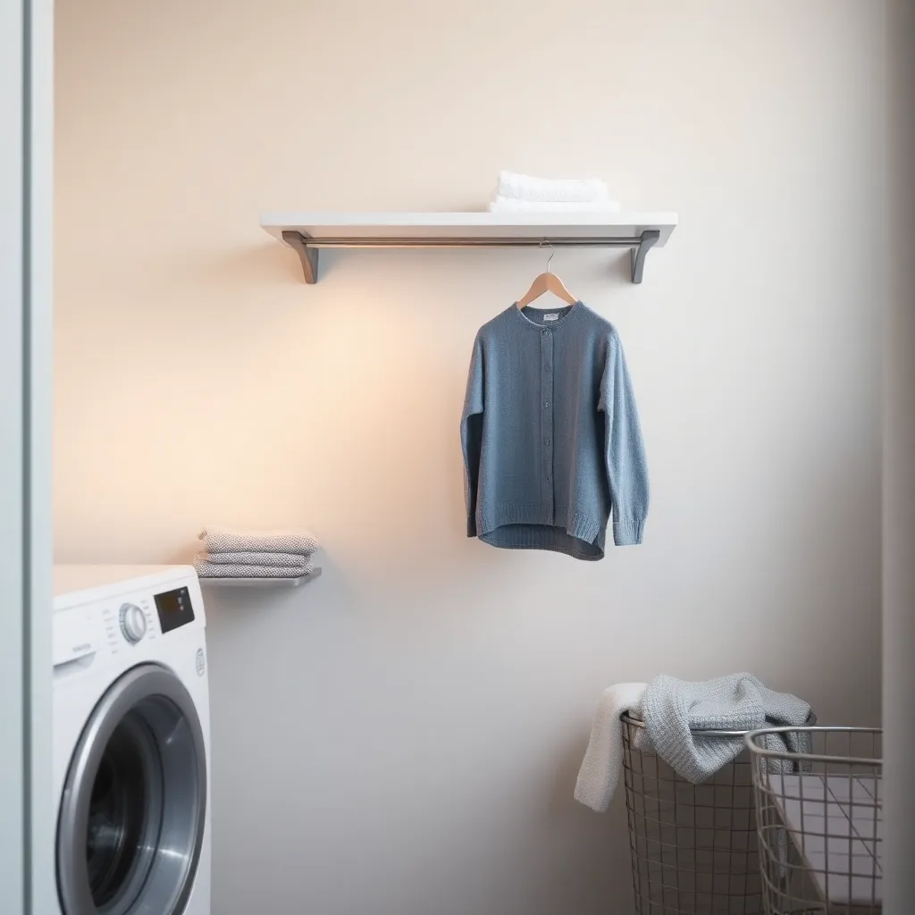 Create an image of a modern, minimalist laundry room with a sleek clothes changer featuring a stainless steel rod and a compact, wall-mounted design. The background is a soft, calming gray, and the clothes changer is illuminated by a warm, natural light. Incorporate a few folded clothes and a laundry basket nearby.