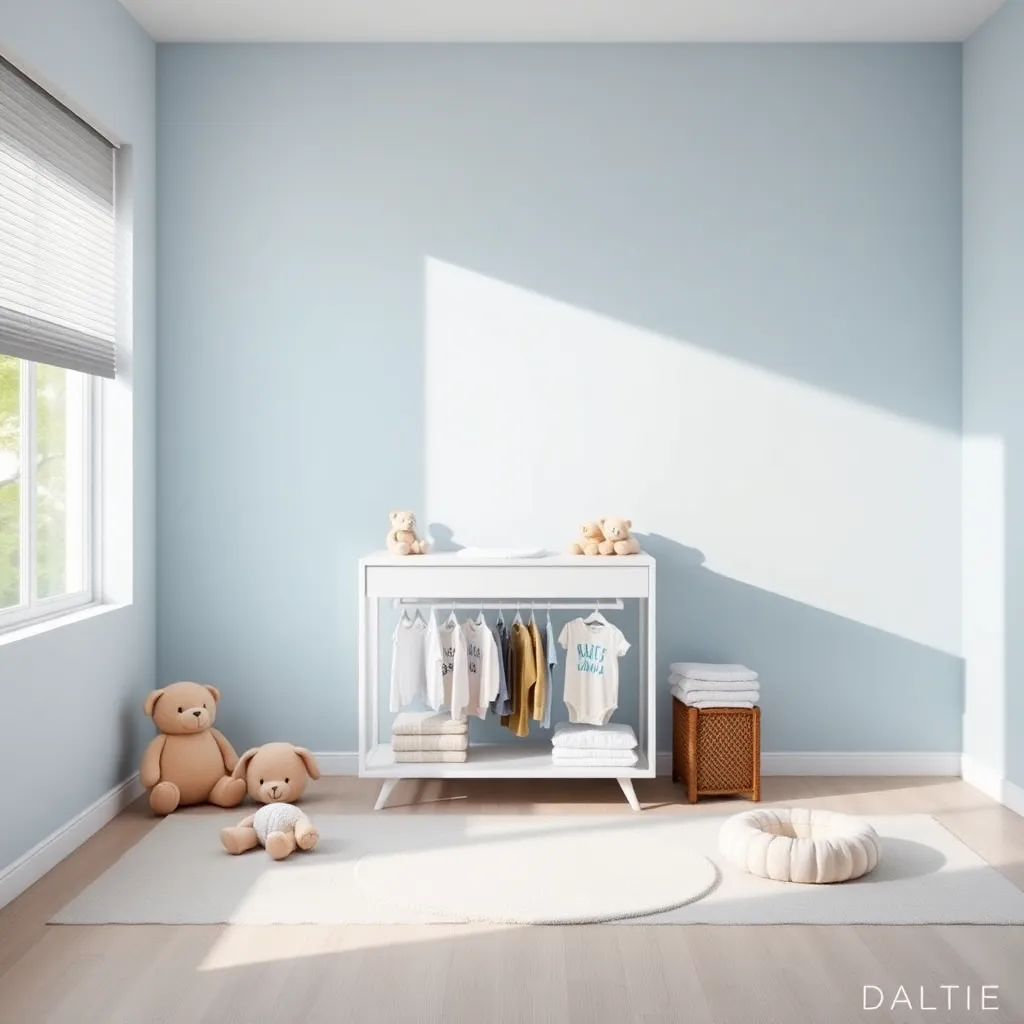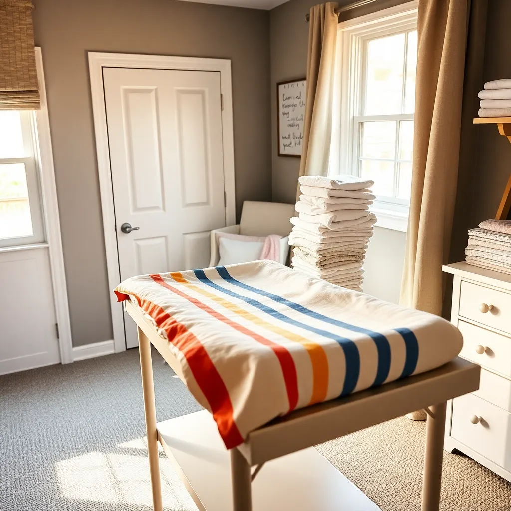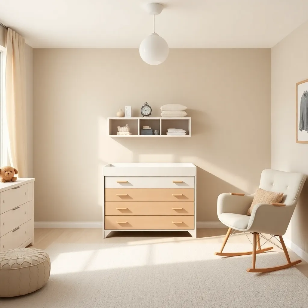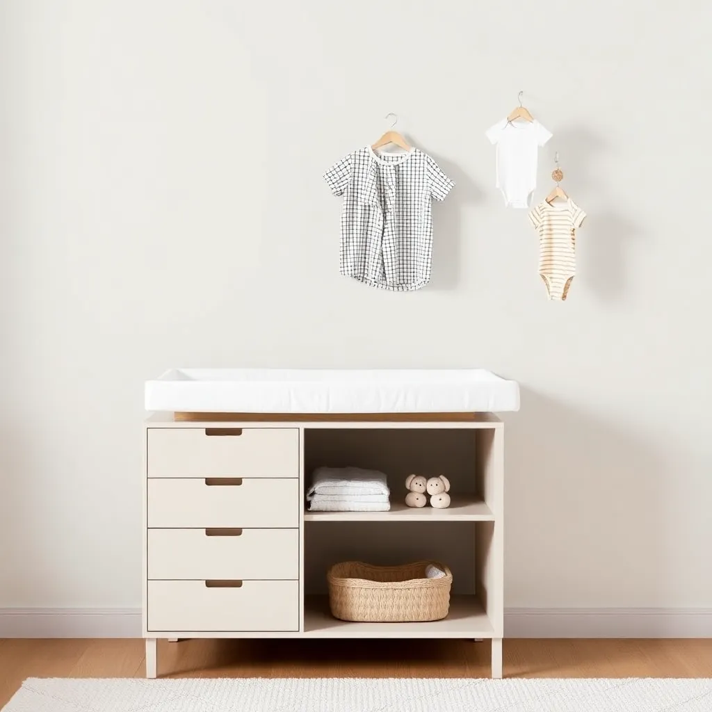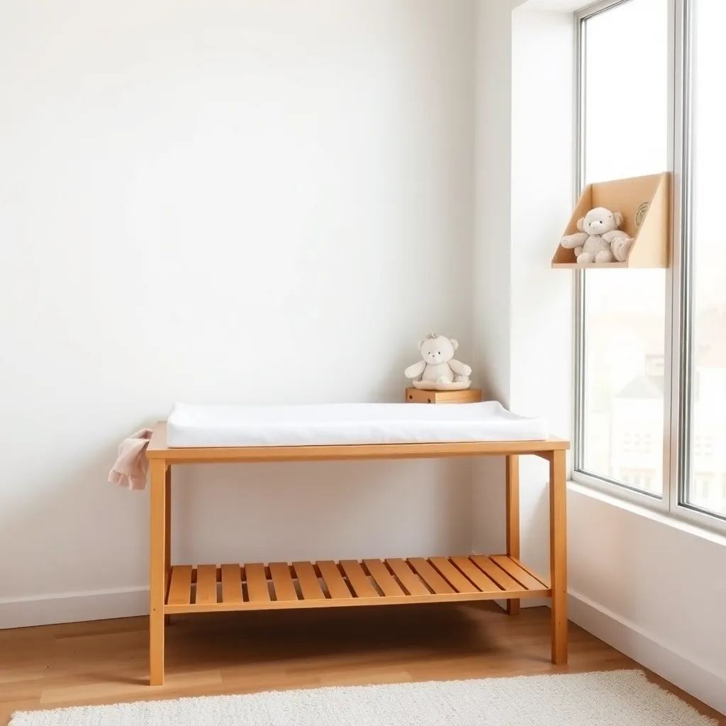 Create an image of a modern, minimalist nursery with a changing table in the center. The table should be made of natural wood and have a soft, cushioned changing pad. A stack of onesies and a few toys should be neatly arranged on a nearby shelf. The room should be bright and airy with a large window.